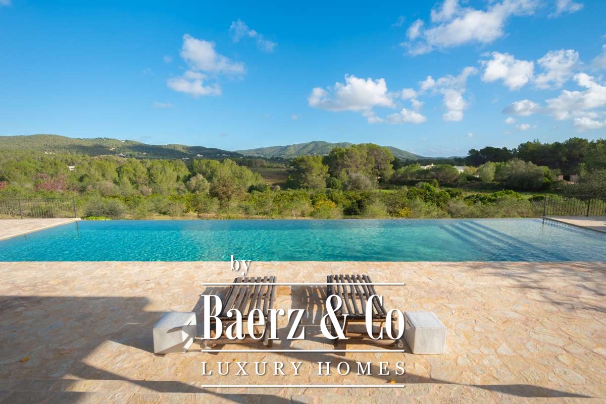 This farmhouse Sant Llorenç de Balàfia resides at the island’s highest valley point, where rolling agricultural land meets forest and mountain views. The property’s terraces open onto a tapestry of olive groves and fruit trees, with vistas extending to the church tower of Balafí and historic walls in the far distance. On the opposite side, the springs of San Rafael bring freshness to the landscape, softening the horizon. Quiet and privacy envelope this 24,215 m² estate, though Eivissa and Santa Gertrudis remain easily within reach.