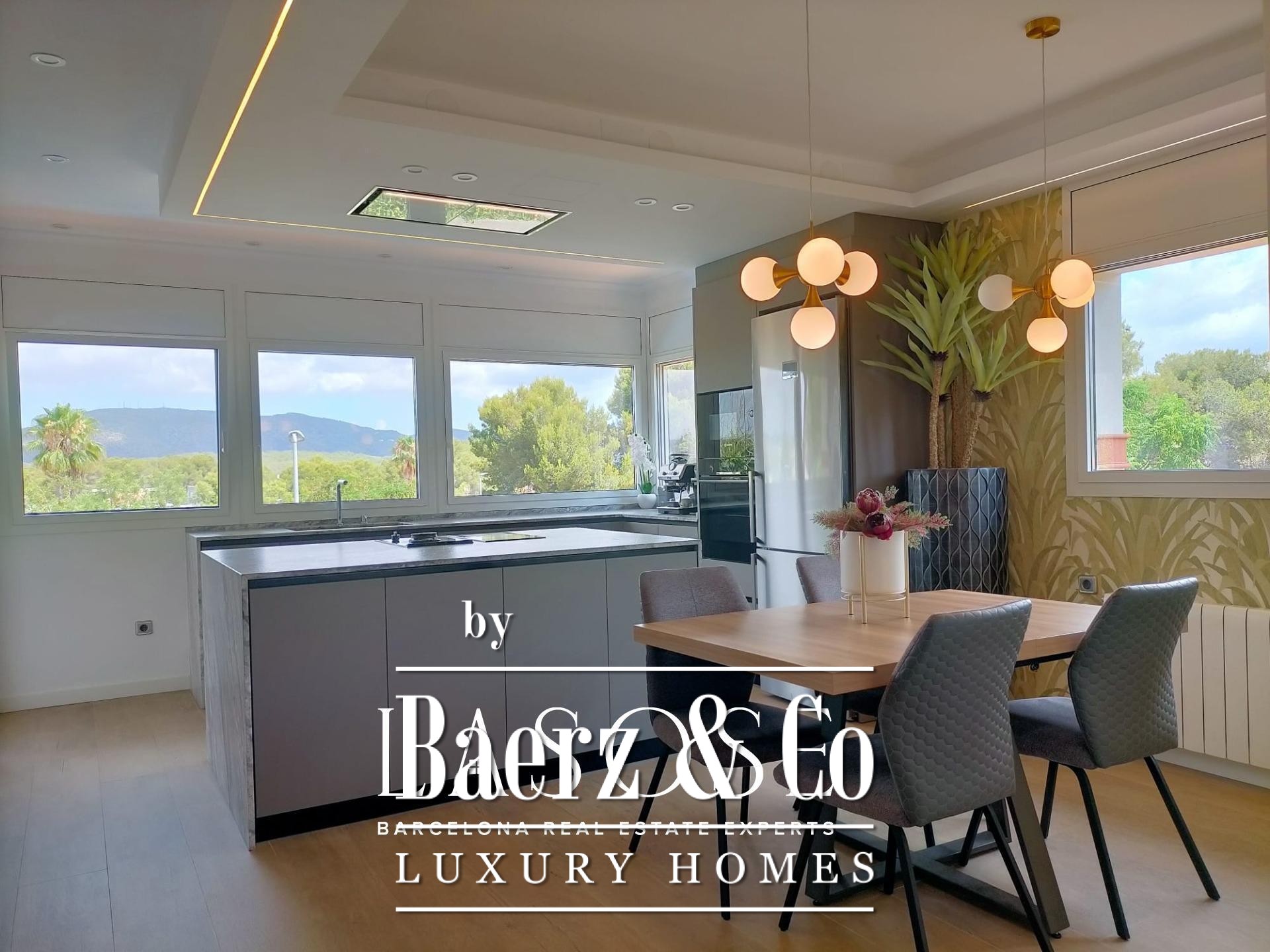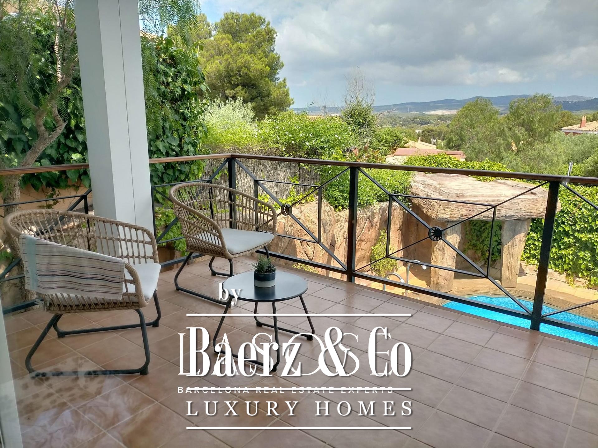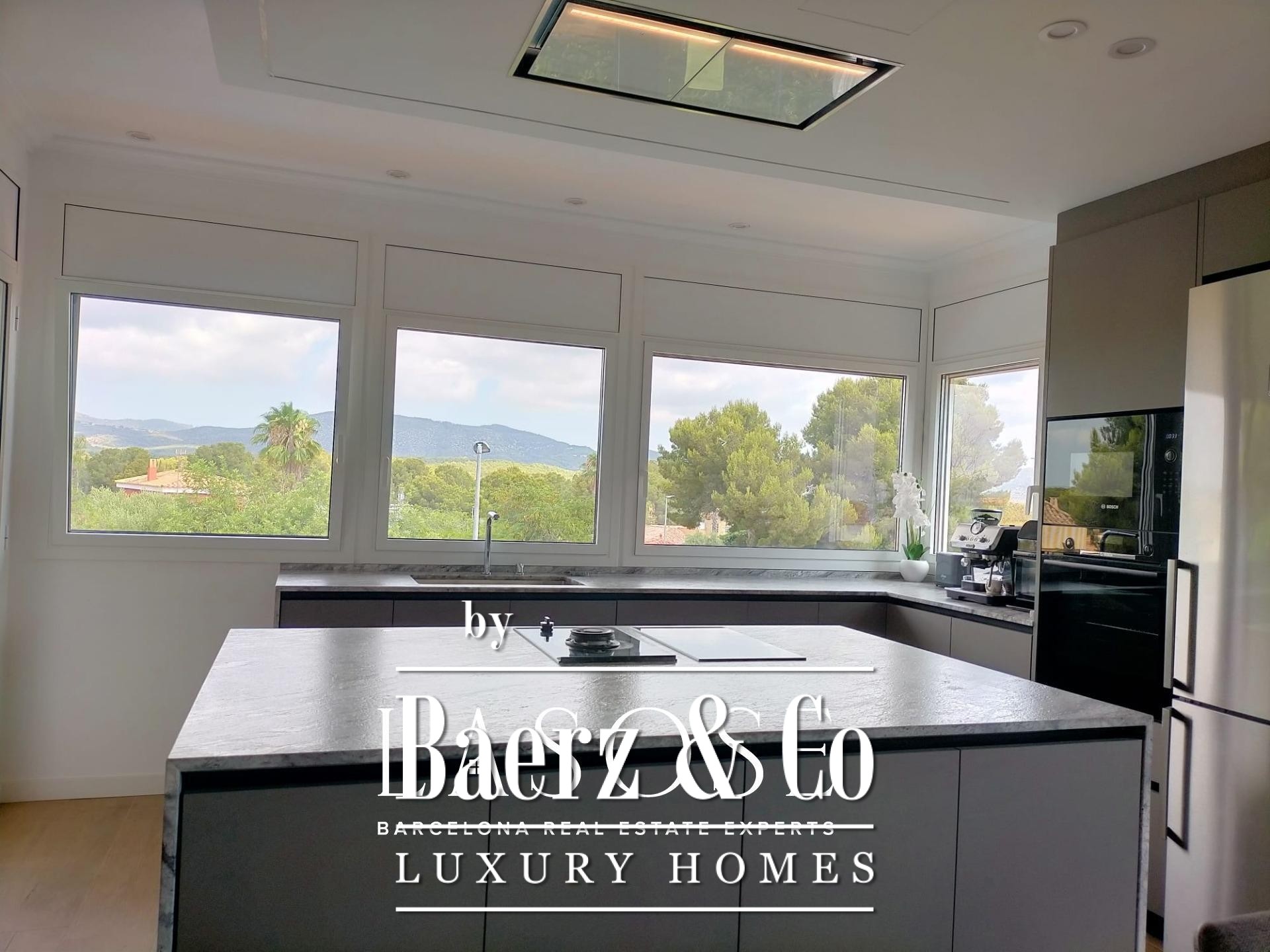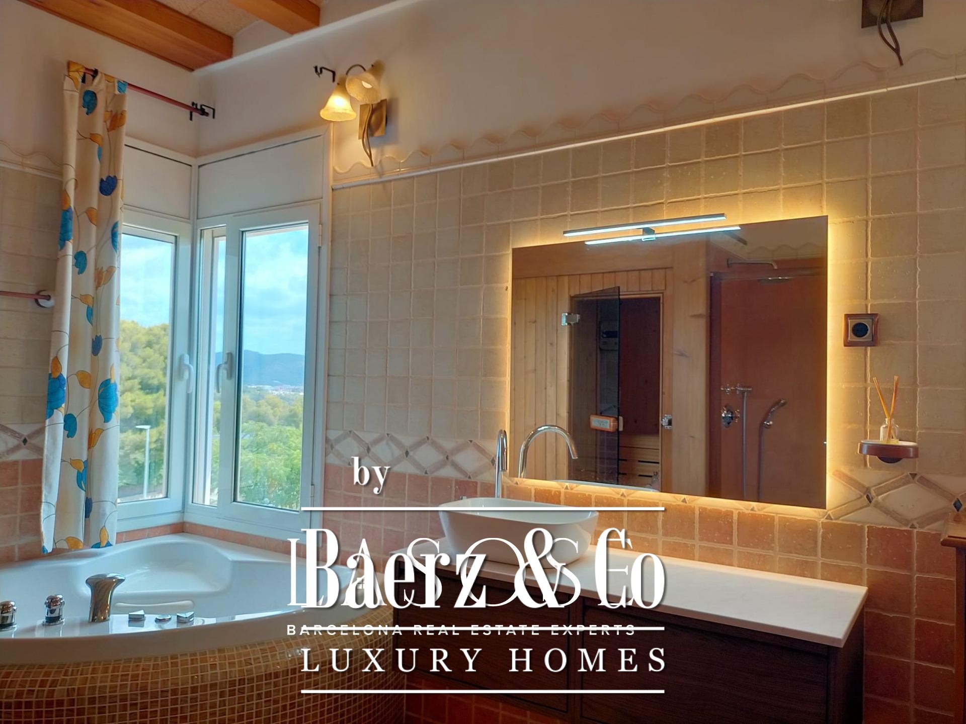 LASOSE proudly presents this remarkable 5-bedroom, 3-bathroom villa located in the prestigious residential area of Els Cards, one of the most desirable districts between Sitges and Sant Pere de Ribes. Set on an elevated position, the property enjoys panoramic views over the surrounding landscape, offering privacy, natural light and a serene atmosphere just minutes from the coast.. . This residence beautifully blends traditional Spanish character with contemporary elegance. Recently renovated interiors showcase modern finishes while preserving architectural charm, including arches, warm tones and natural textures. The open-plan layout creates a seamless flow between the kitchen, dining area and living room, all bathed in sunlight from windows on two sides. A stylish fireplace adds a cozy focal point, perfect for gatherings throughout the year.. . The fully renovated kitchen is both sophisticated and functional. It features a central island topped with striking Brazilian granite, generous storage and direct connection to the dining space. The abundance of natural light enhances the sense of space, and the layout is ideal for families and for entertaining.. . The villa offers five bright bedrooms, including a spacious master suite designed for total comfort and privacy. The en-suite bathroom features a bathtub, walk-in shower, double sink, bidet and the rare luxury of a private sauna—perfect for relaxation and wellbeing.. . Outdoor living is one of the property’s greatest highlights. Step out to a beautifully maintained garden with real grass, mature trees—including