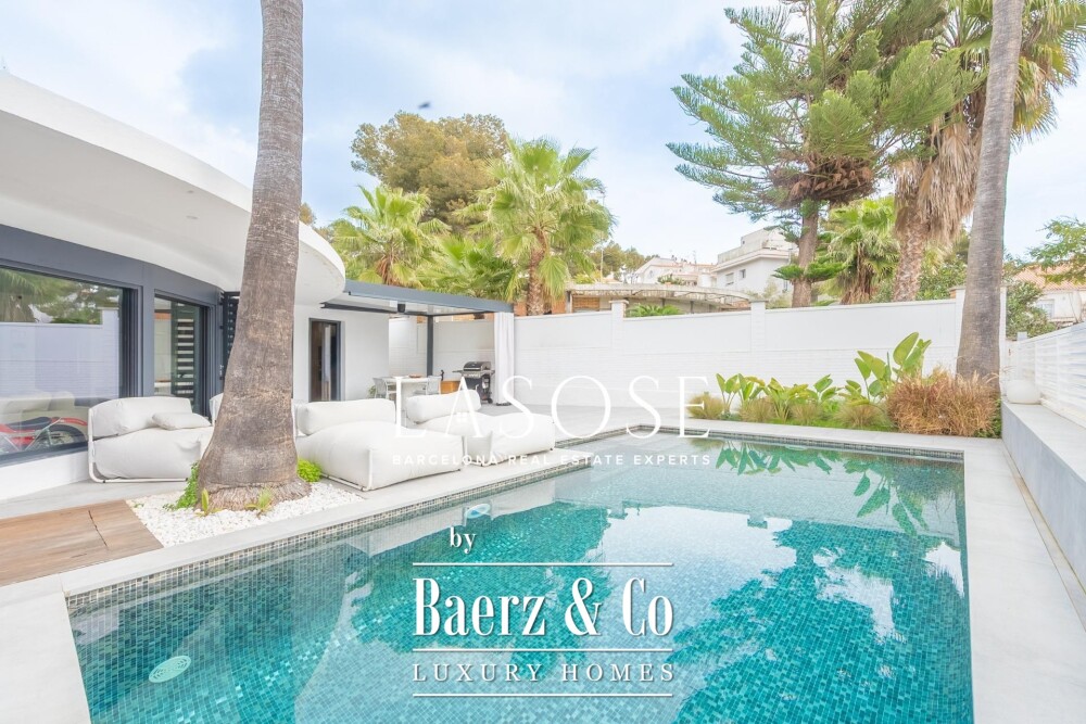 Villa Sitges Vallpineda introduces elevated Mediterranean living in a discreet residential setting. This 100 m² single-storey villa has been fully renovated to precise contemporary standards, offering two bedrooms and two bathrooms that flow seamlessly into generous living spaces. The property stands on a 278 m² plot, framed by stately palm trees and enhanced by open views, where tranquil indoor and outdoor environments merge. Floor-to-ceiling windows illuminate the main living and dining area, integrating naturally with the terrace and private pool—ideal for family gatherings or quiet reflection.