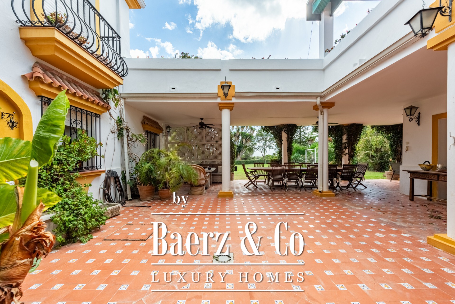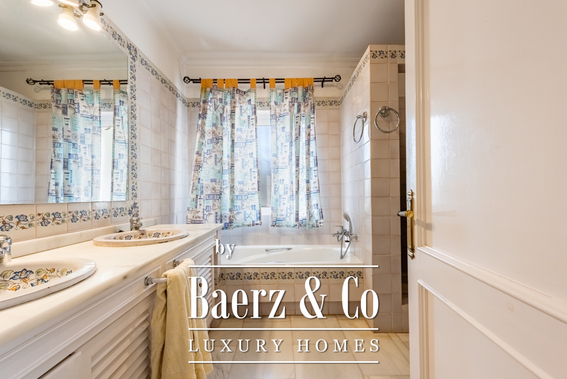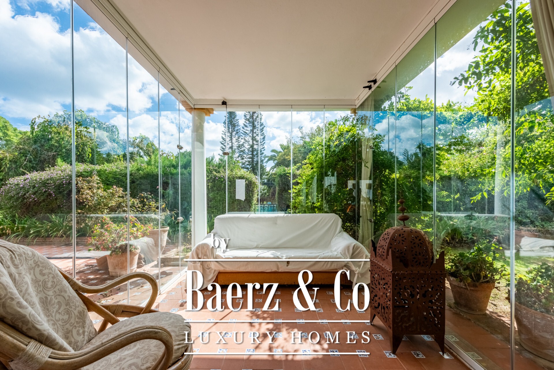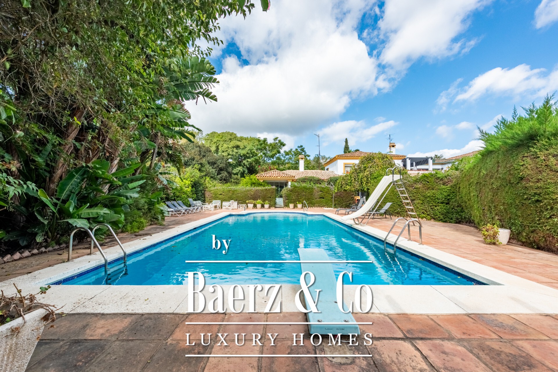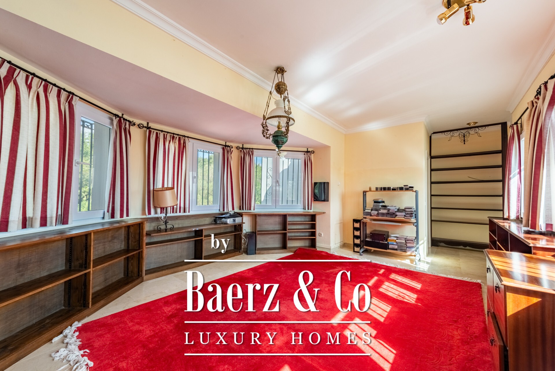 Located in an elevated position at the highest point of the sought-after Calle Doñana in the D-Zone of Sotogrande Alto, this impressive villa sits on an exceptionally large plot of almost 7,000 m². With a built area of approximately 1,000 m², the villa offers not only maximum privacy but also far-reaching views – all the way to the sea. Built in 1988, the property impresses with its balanced proportions, solid construction and architectural symmetry. It offers the ideal basis for a high-quality renovation or a visionary redesign – whether as a contemporary family retreat or an exclusive getaway in southern Spain. With selective tree pruning and professional landscaping, the garden can once again frame the sea views that make this location so desirable. The spacious terraces – some covered, some open – invite you to enjoy stylish outdoor dinners and relaxing hours under the open sky. Inside, you will find six spacious bedrooms, five