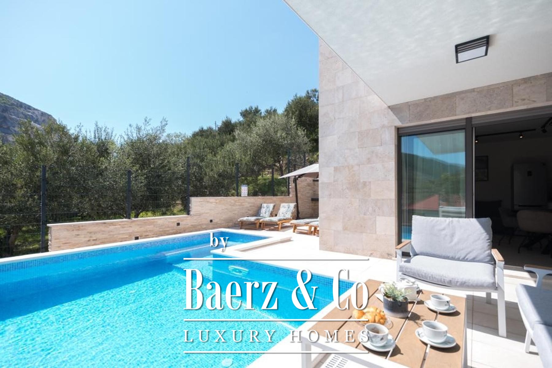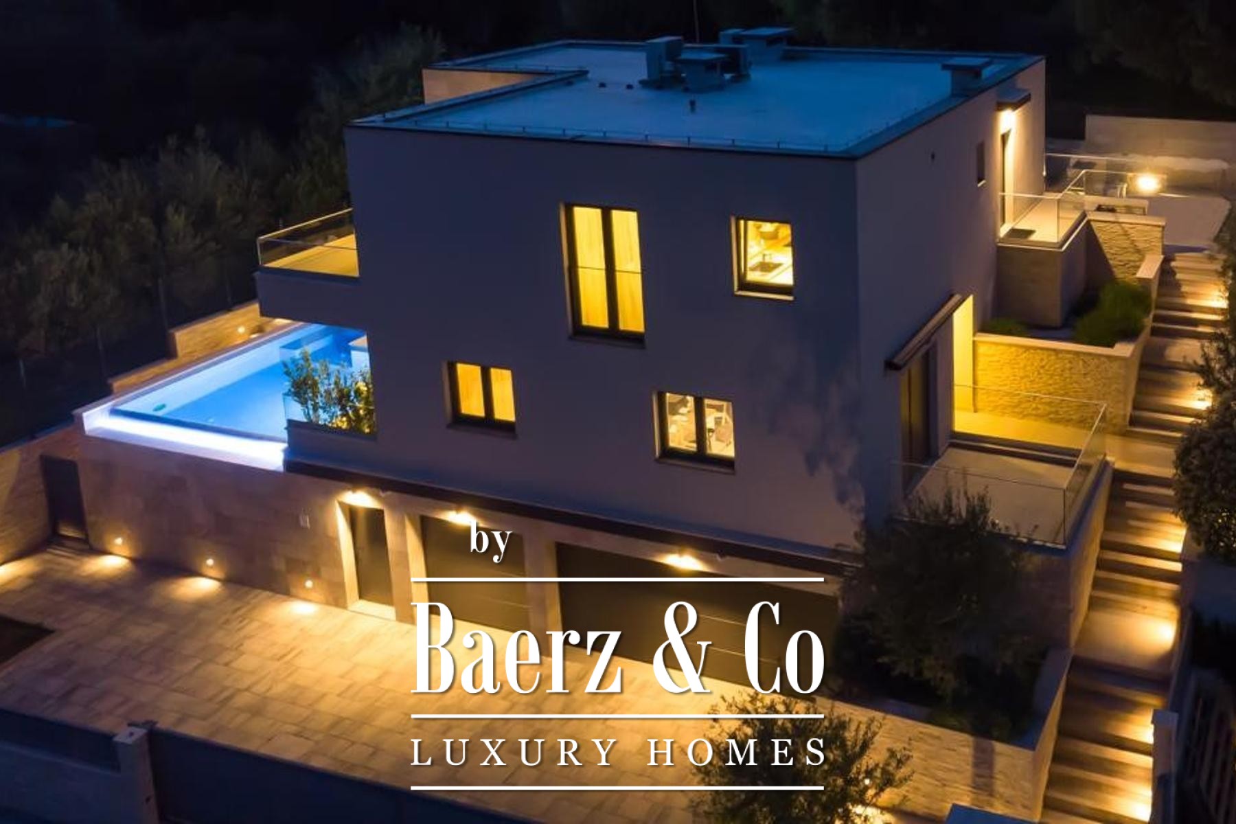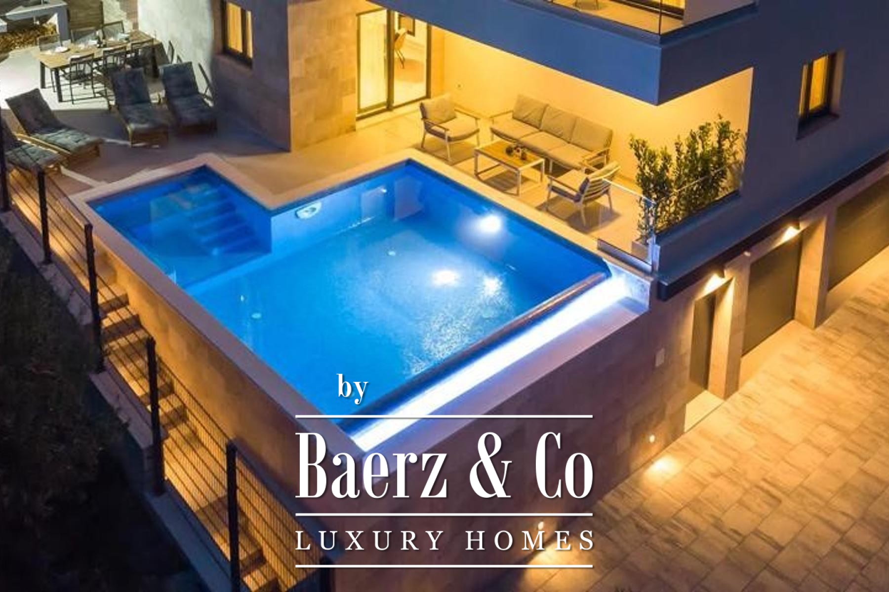 Split, Žrnovnica, luxury villa with 2 residential units, a garage for 3 vehicles and an outdoor heated pool, built on a plot of land of 551 m2.It consists of a ground floor and two floors. On the ground floor there is a garage, a storage room and a pool machine room with a fitness area. On the 1st floor there is a three-room apartment consisting of a kitchen with a dining room and a living room, 3 bedrooms, a bathroom, a toilet with attached terraces and a 27 m2 swimming pool.It is suitable both for living and for tourist rental. It is 3 km from the sea, 26 km from Split airport, 13 km from the center of Split and 18 km from the city of Omiš.The house is newly built, completed