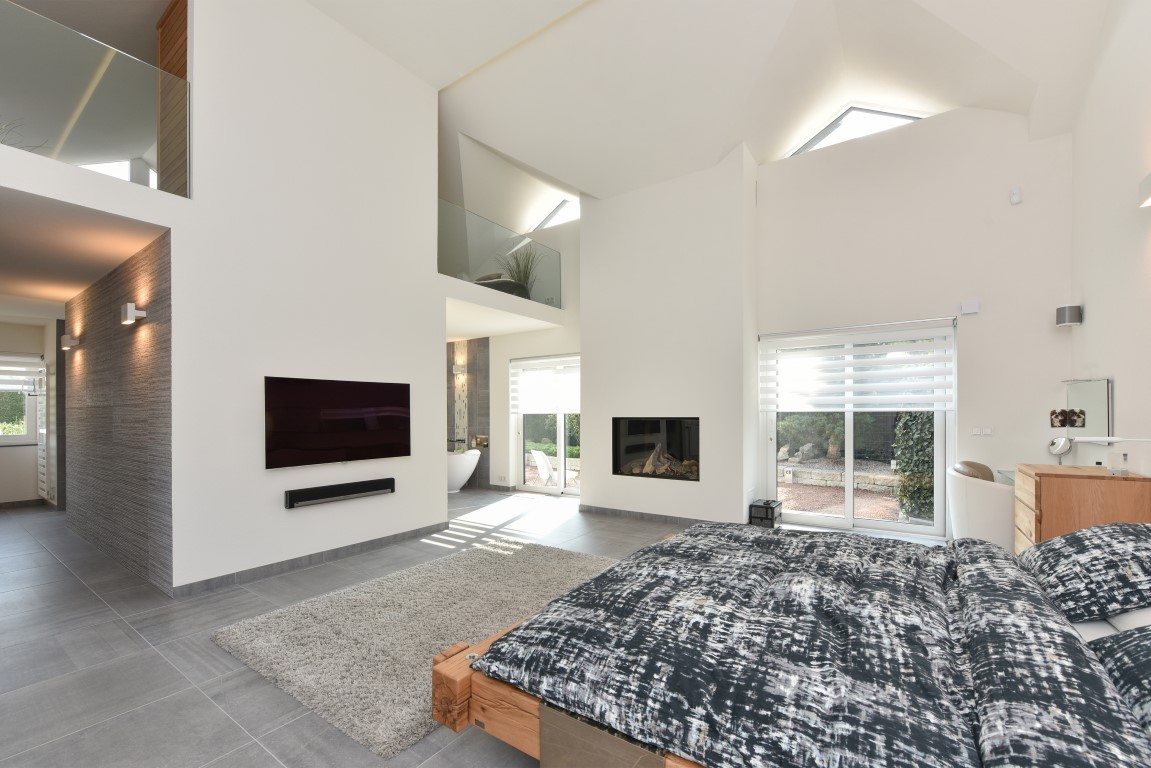 De living is comfortabel ruim en licht van opzet, beschikt over een Cinewall en een 3-tal schuifpuien richting de tuin rondom. Vanuit de eethoek loopt de sfeer vloeiend over richting de open woonkeuken met alle luxe van dien. Denk aan een royaal granieten werkblad, hoogwaardige inbouwapparatuur, granieten vloeren, inbouwverlichting en bovenal een zeer neutrale kleurstelling.