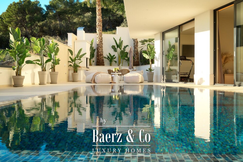 On the lower level, a dedication to wellness prevails. The professionally appointed fitness zone, sauna, entertainment area, and utility suite open directly onto sunlit terraces, offering a seamless transition to the outdoors. Here, an infinity pool of 31 m² with heated massages and counter-current waves, a jacuzzi, and a generous sundeck invite repose against the backdrop of the sea.