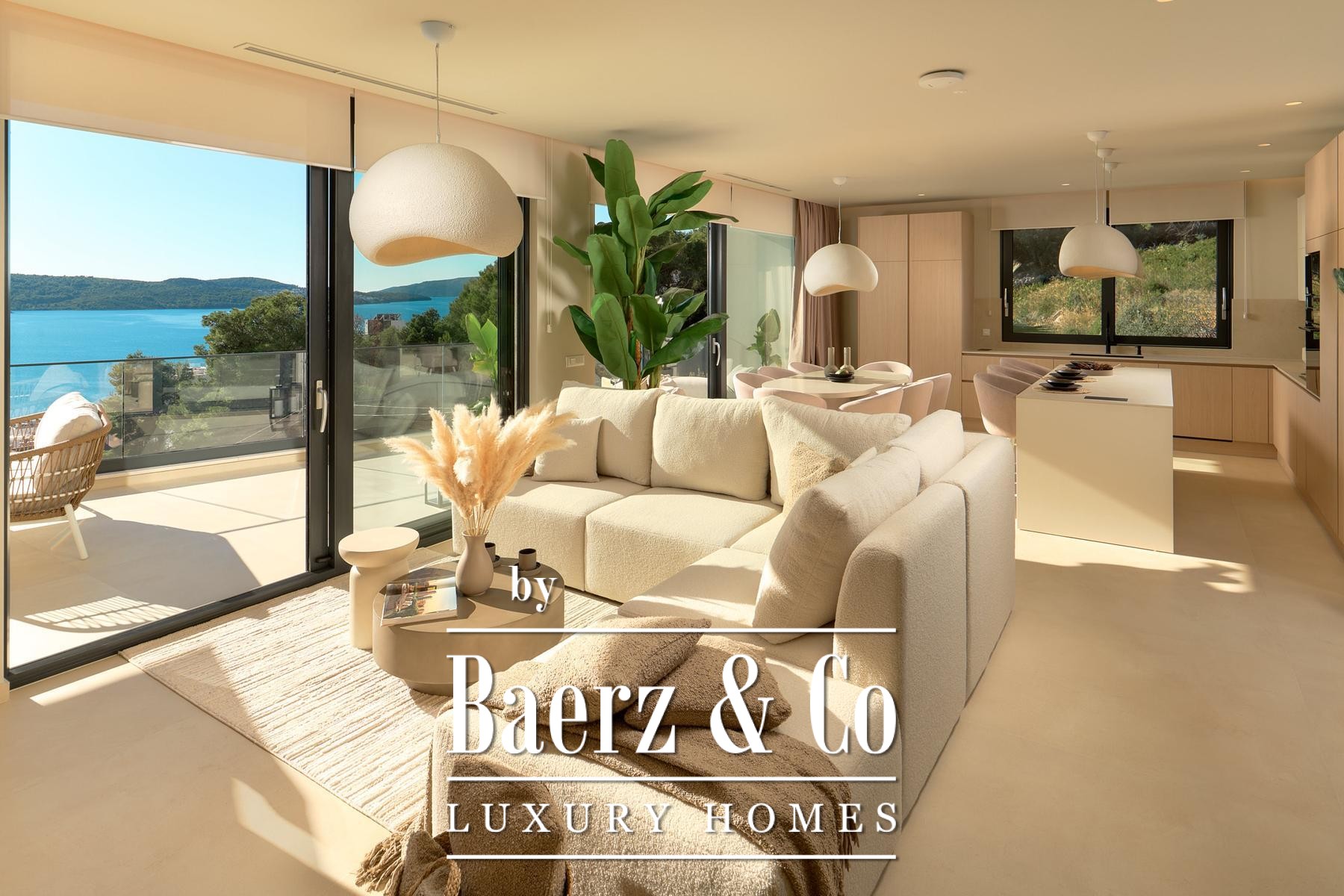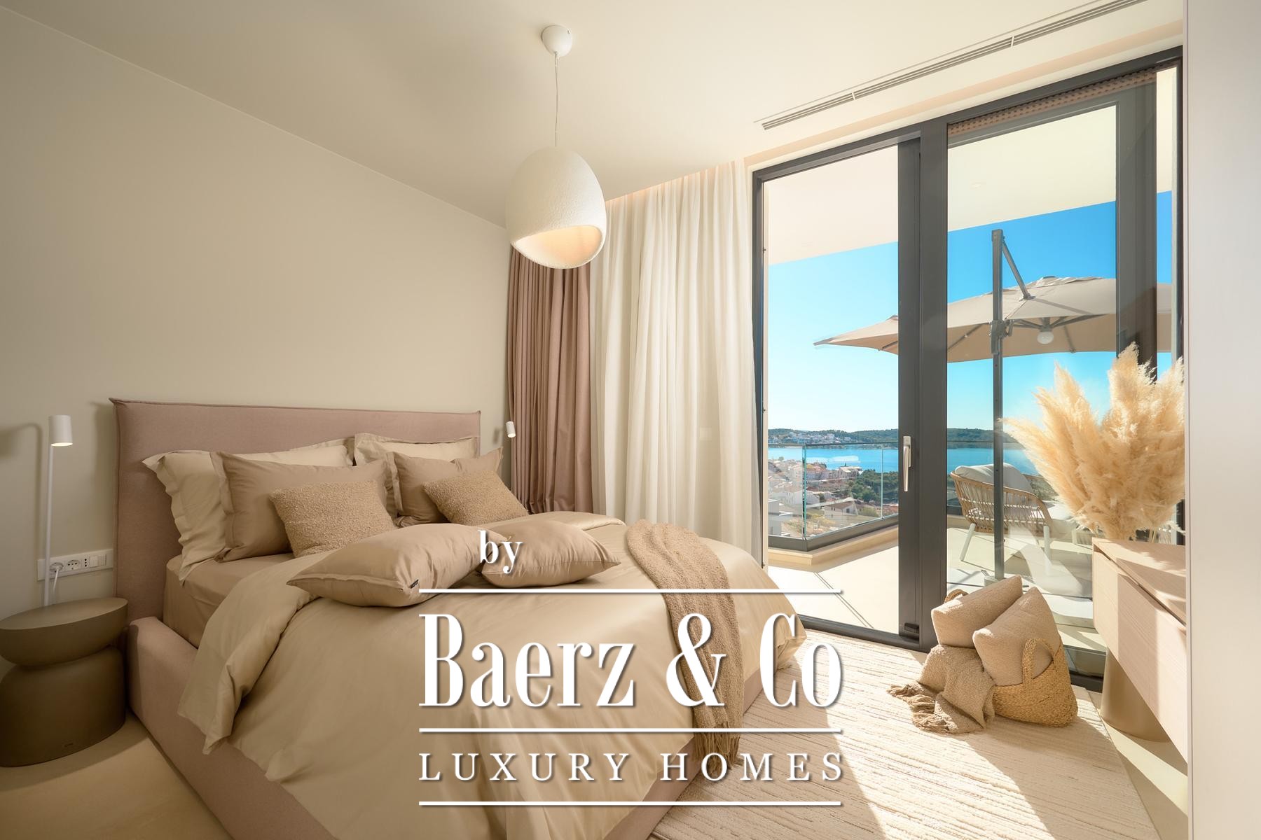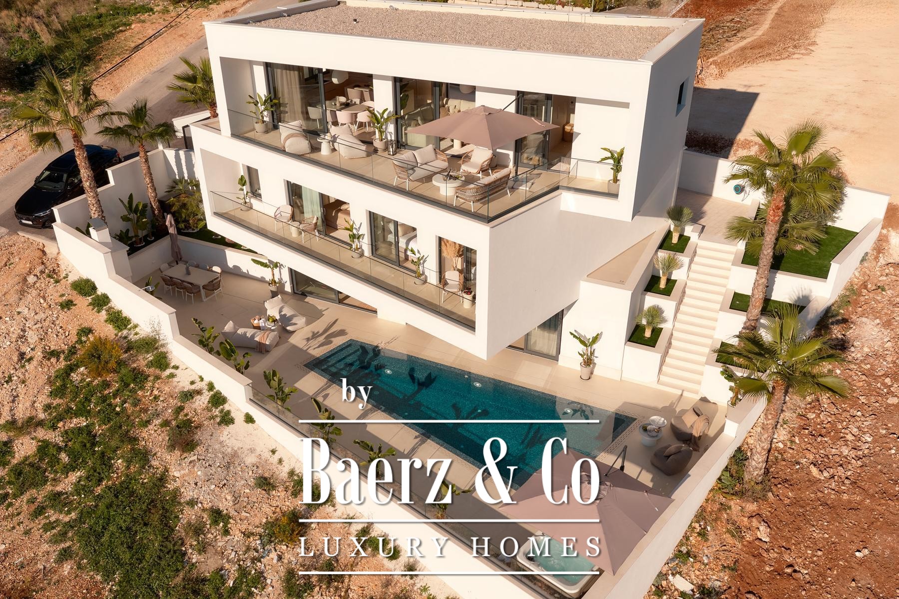 Three bedrooms with en suite bathrooms on the ground floor enjoy direct access to an 18.8 m² loggia. A private garage of 31 m², features electric vehicle charging. The first floor introduces a voluminous 52 m² living area, complemented by a fourth bedroom, additional bath, and expanses of terrace, each vantage point oriented toward the shimmering horizon.