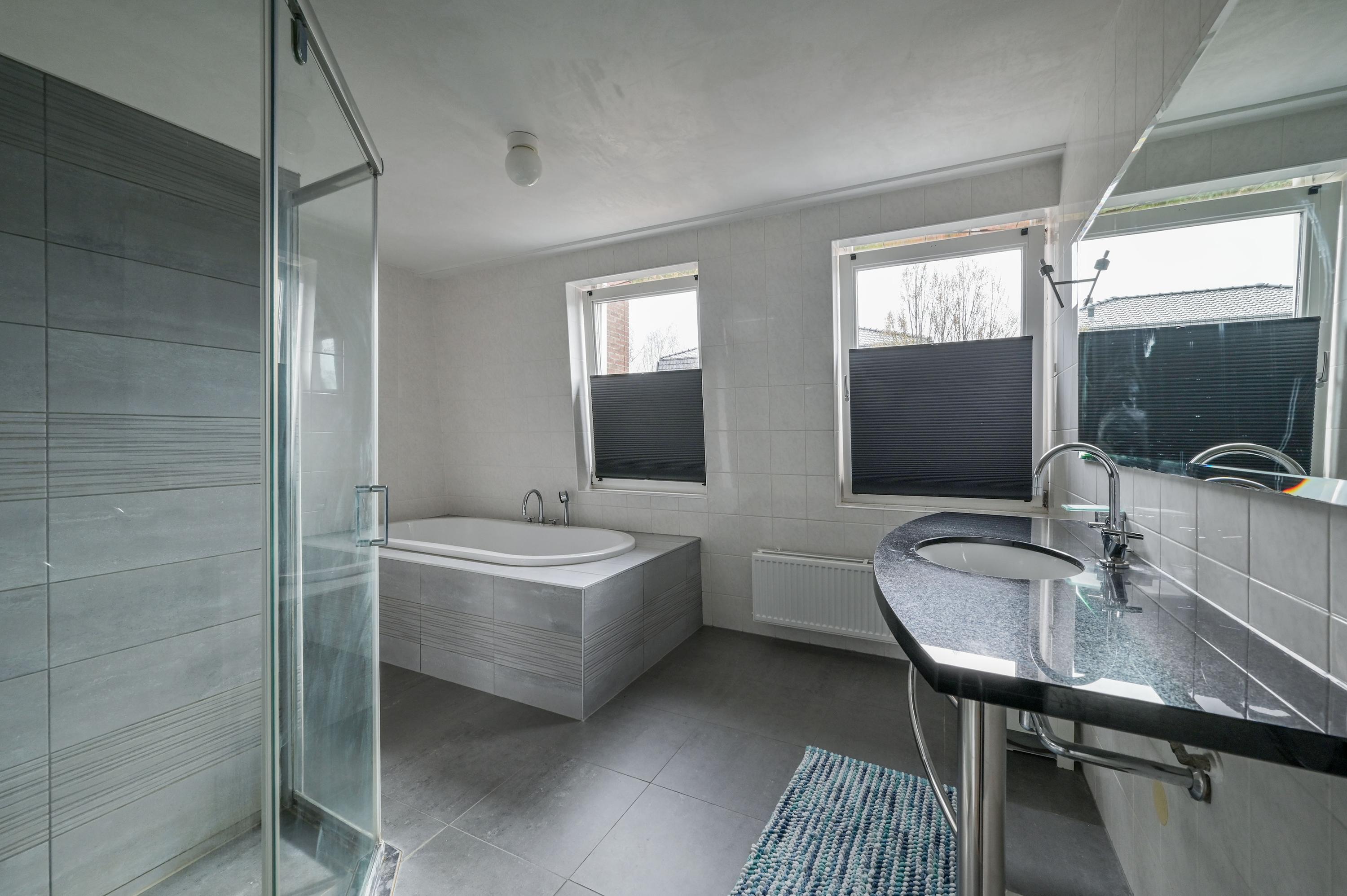 The kitchen at the front is bright and spacious, with large windows and a corner window at the dining area fitted with charming shutters – an ideal spot for cozy meals. The country-style kitchen features a central island with an induction hob and practical drawers on both sides, complemented by an elegant wine rack. The L-shaped countertop provides ample space and is equipped with luxury built-in appliances, including a grill plate, fryer with extractor hood, and built-in food processor. At the window side, there is the sink area with a double sink, Quooker, and dishwasher. A large cabinet wall with a combination microwave, additional oven on the other side of the kitchen, and space for a large double fridge/freezer with ice machine (available for takeover) completes the setup. Under the stairs, there is also a convenient cupboard for coats and extra storage.