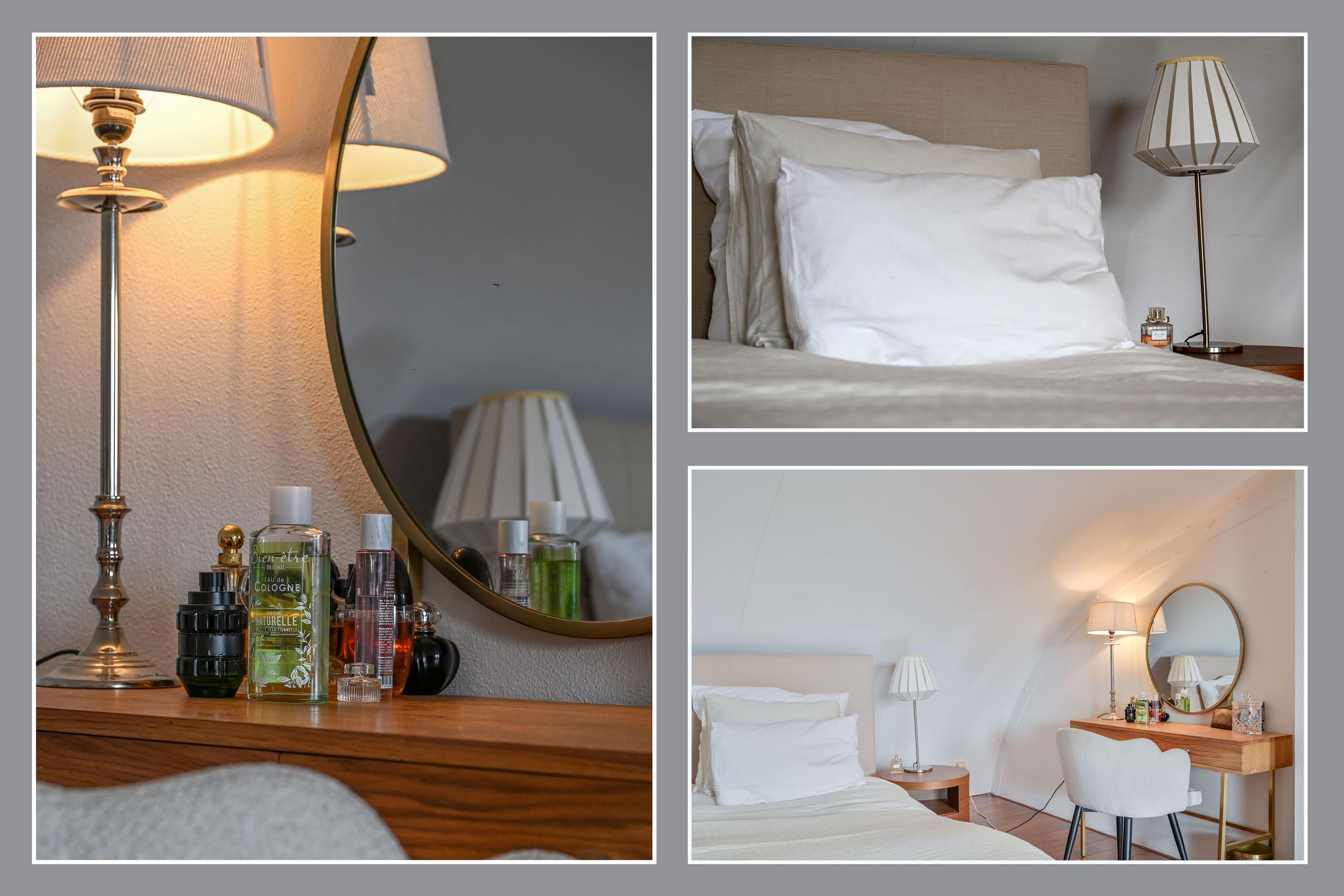 The spacious first-floor hall provides access to three large bedrooms, the stylish bathroom, and the practical laundry room. The spacious L-shaped master bedroom at the front features two large windows and a side window with garden views. The adjacent bathroom is equipped with a generous bathtub, modern shower, illuminated sink, toilet, and bidet – a space that perfectly combines luxury and functionality.