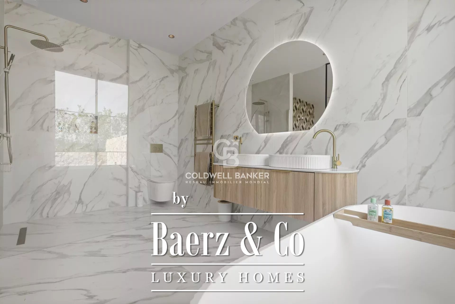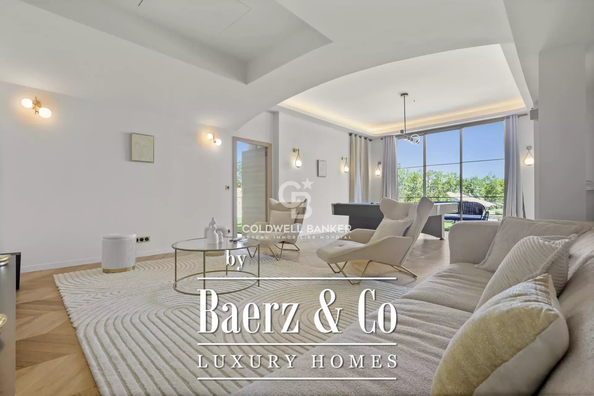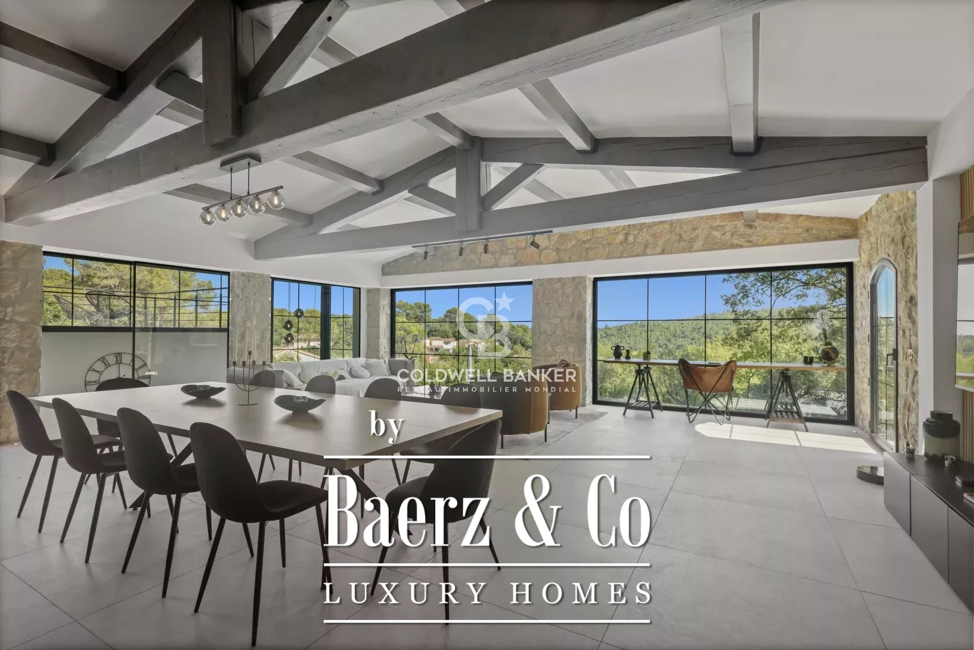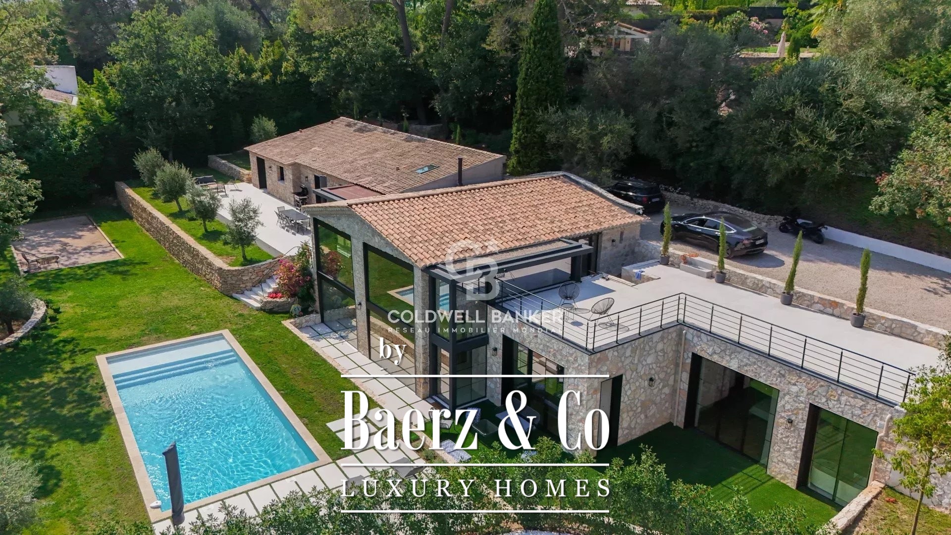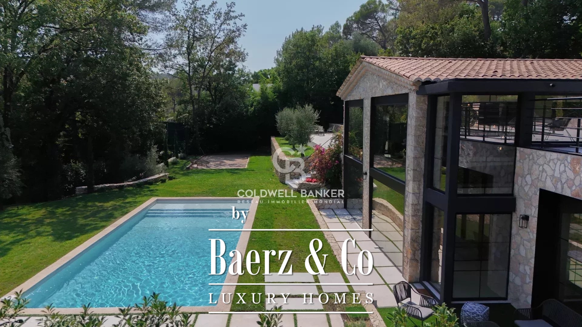 Pretty stone villa completely renovated located in a quiet area near the village of Valbonne. The house has an impressive living room with open kitchen, four bedrooms and three bathrooms/shower on the ground floor. On the garden level, the house also has a nice living room (converted into a screening room and