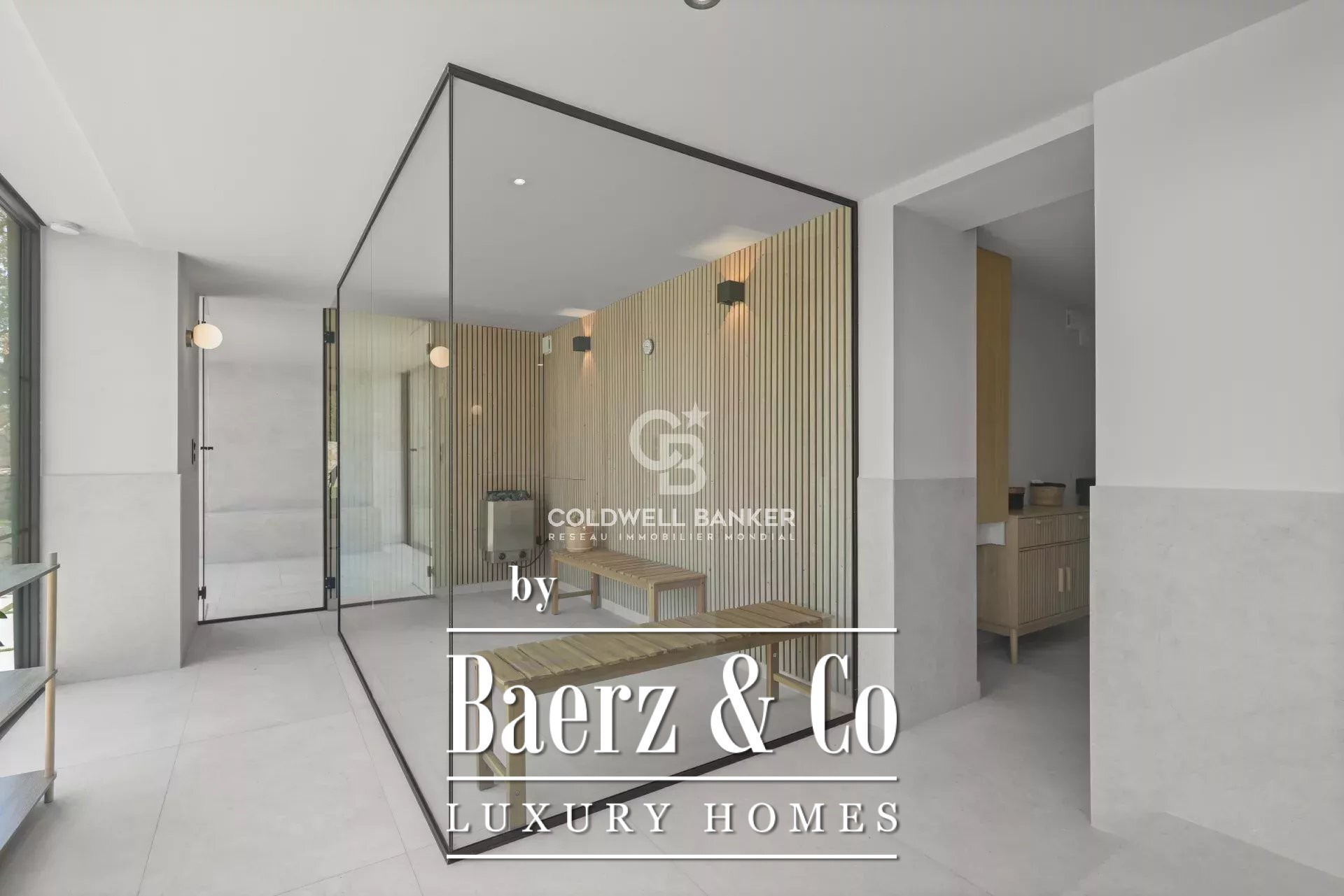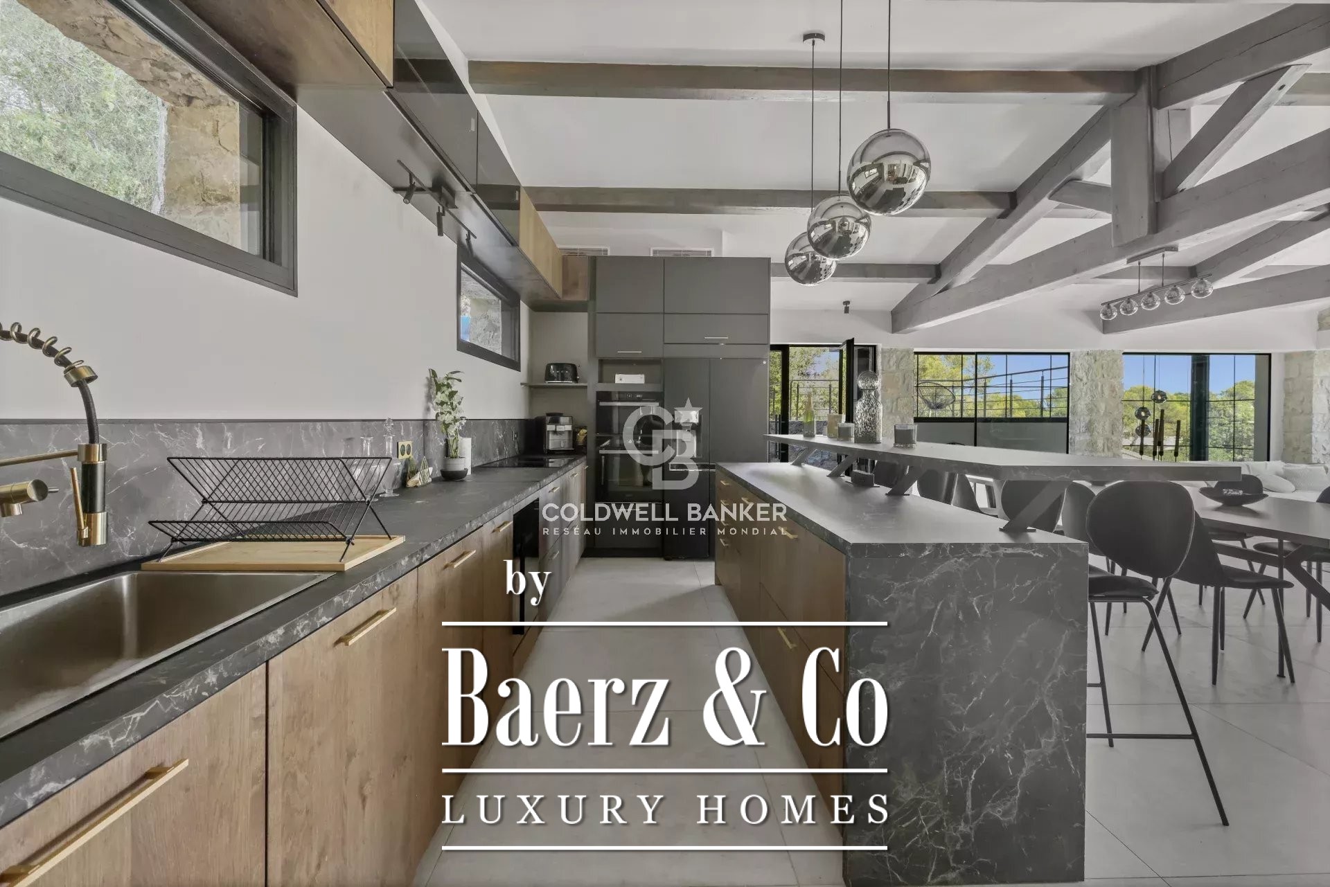 billiard room), a fifth suite, a sauna and a hammam. The property has many terraces to make the most of the outdoor spaces and panoramic views of the hills and the forest. Beautiful flat land of 2500 m2 with swimming pool and pétanque. Direct access to many walks. Several parking spaces. Very quiet.