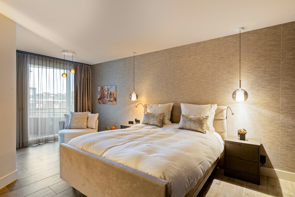 The apartment features several generously sized (bed)rooms. The master bedroom feels like a luxury hotel suite, complete with bespoke wardrobes, and both bedrooms offer direct access to a covered balcony where you can also enjoy the evening sun. The stylish bathroom is spacious and equipped with a rain shower with sunshower function, a vanity unit with double taps, illuminated mirror, wall-mounted toilet, and high-quality finishes down to the finest detail.