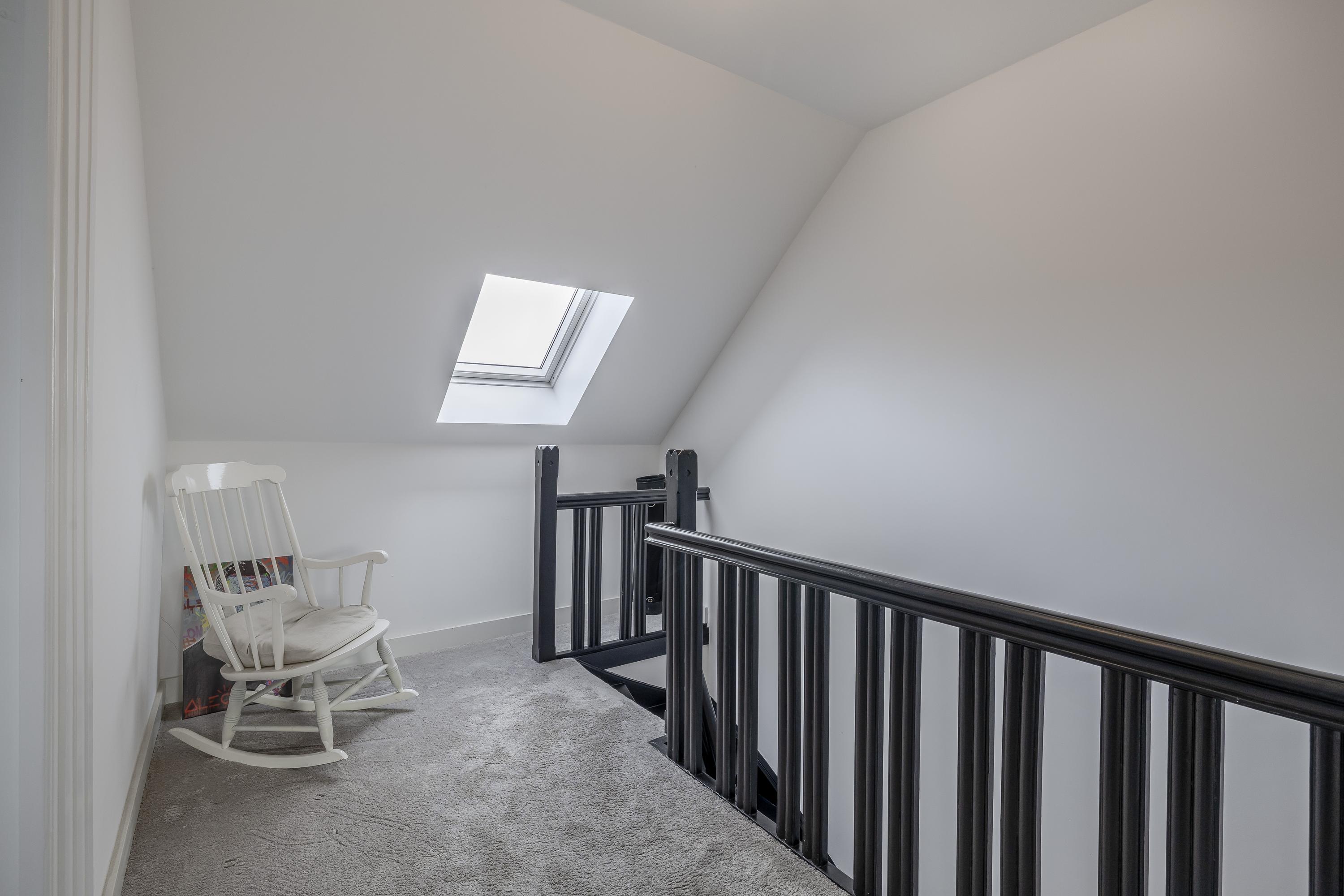 The second floor is reached via a fixed staircase. The landing has carpet and a Velux roof window with screen.