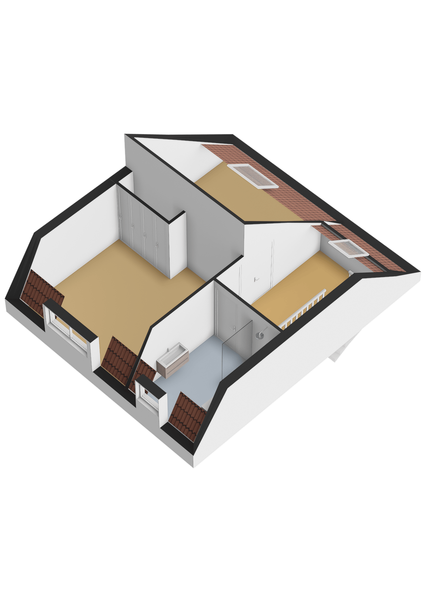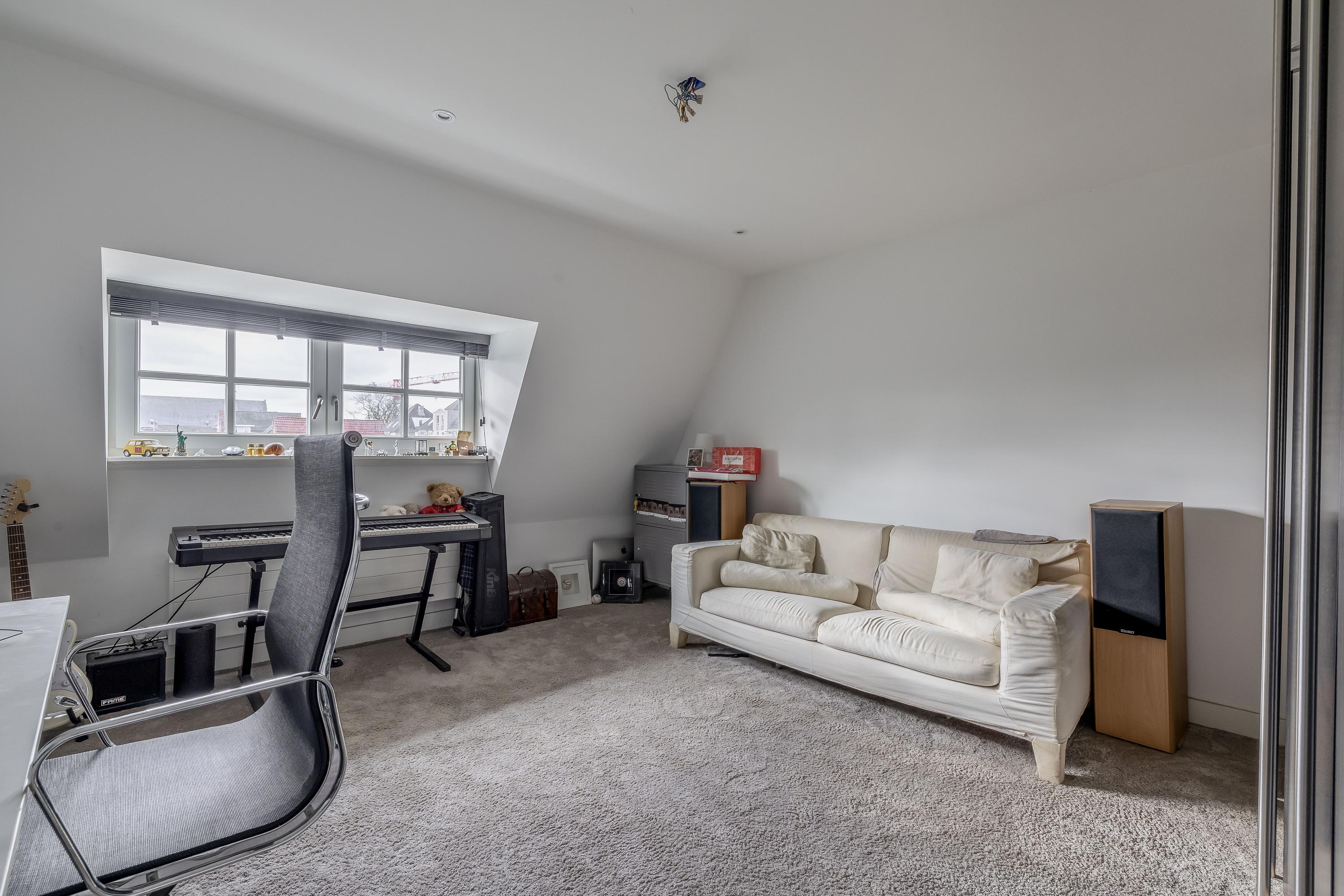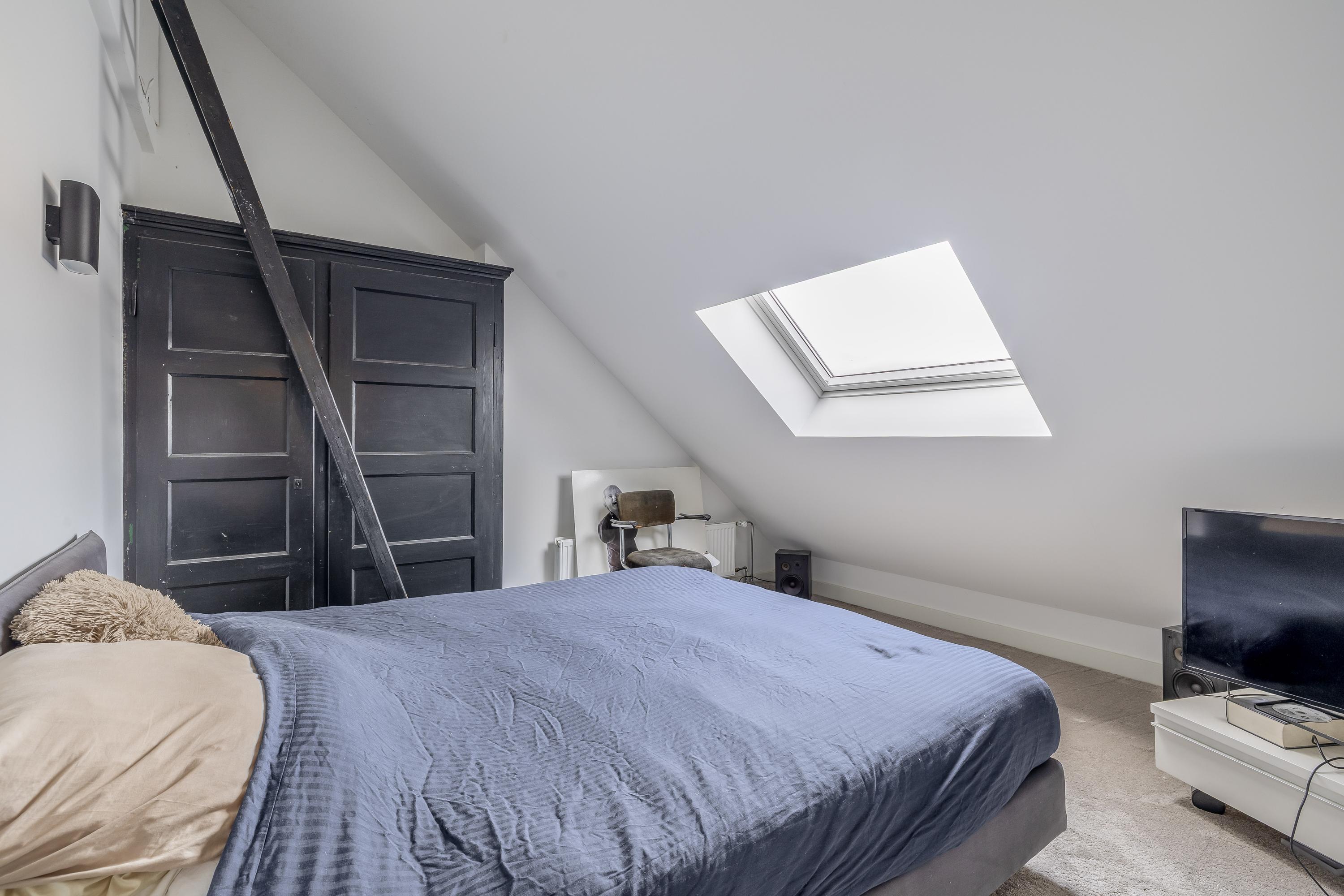 The third bedroom is equipped with air conditioning, carpet flooring and a Velux roof window with screen. A loft above offers additional storage space. The fourth bedroom features carpet flooring and a dormer window.