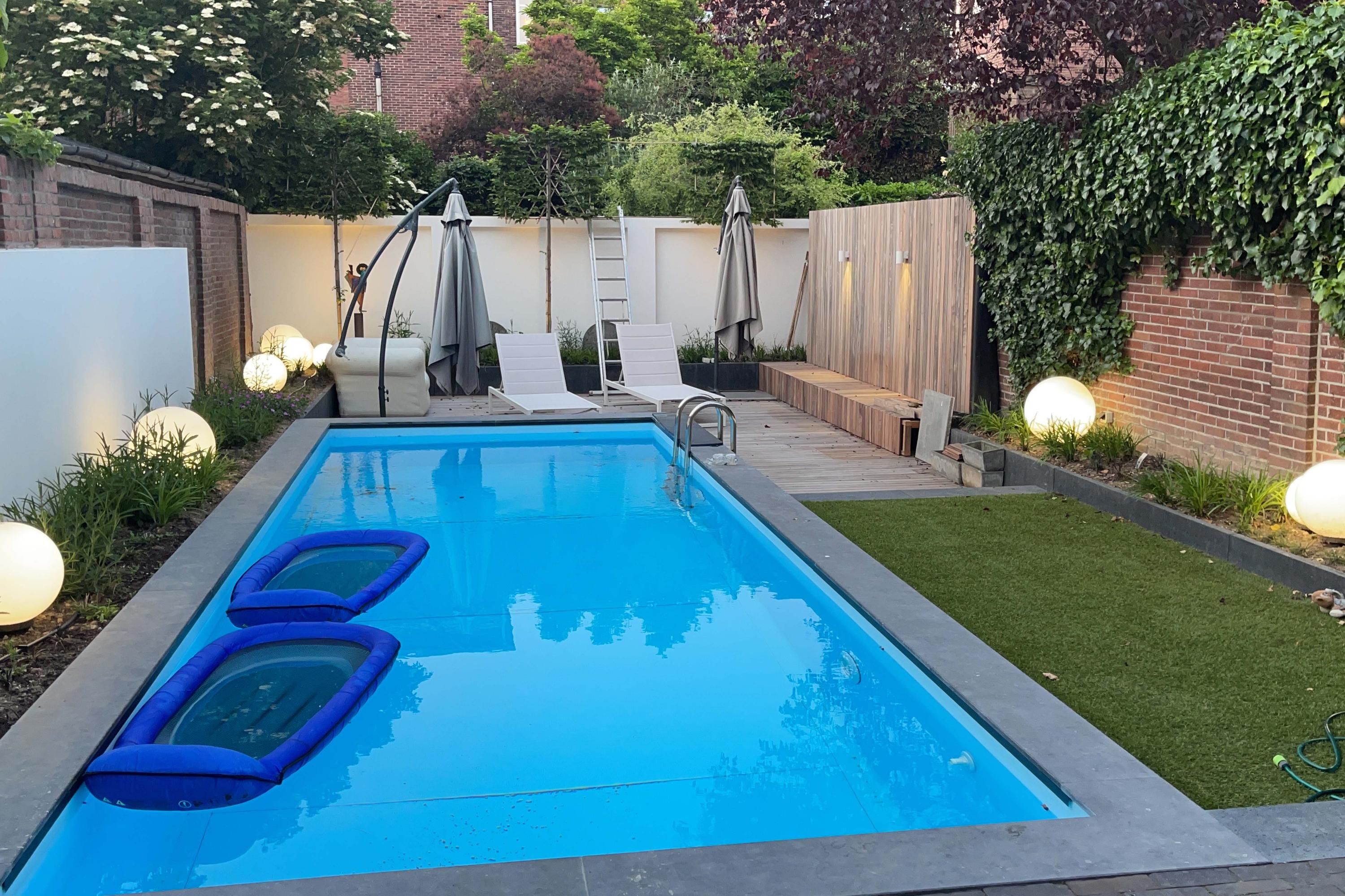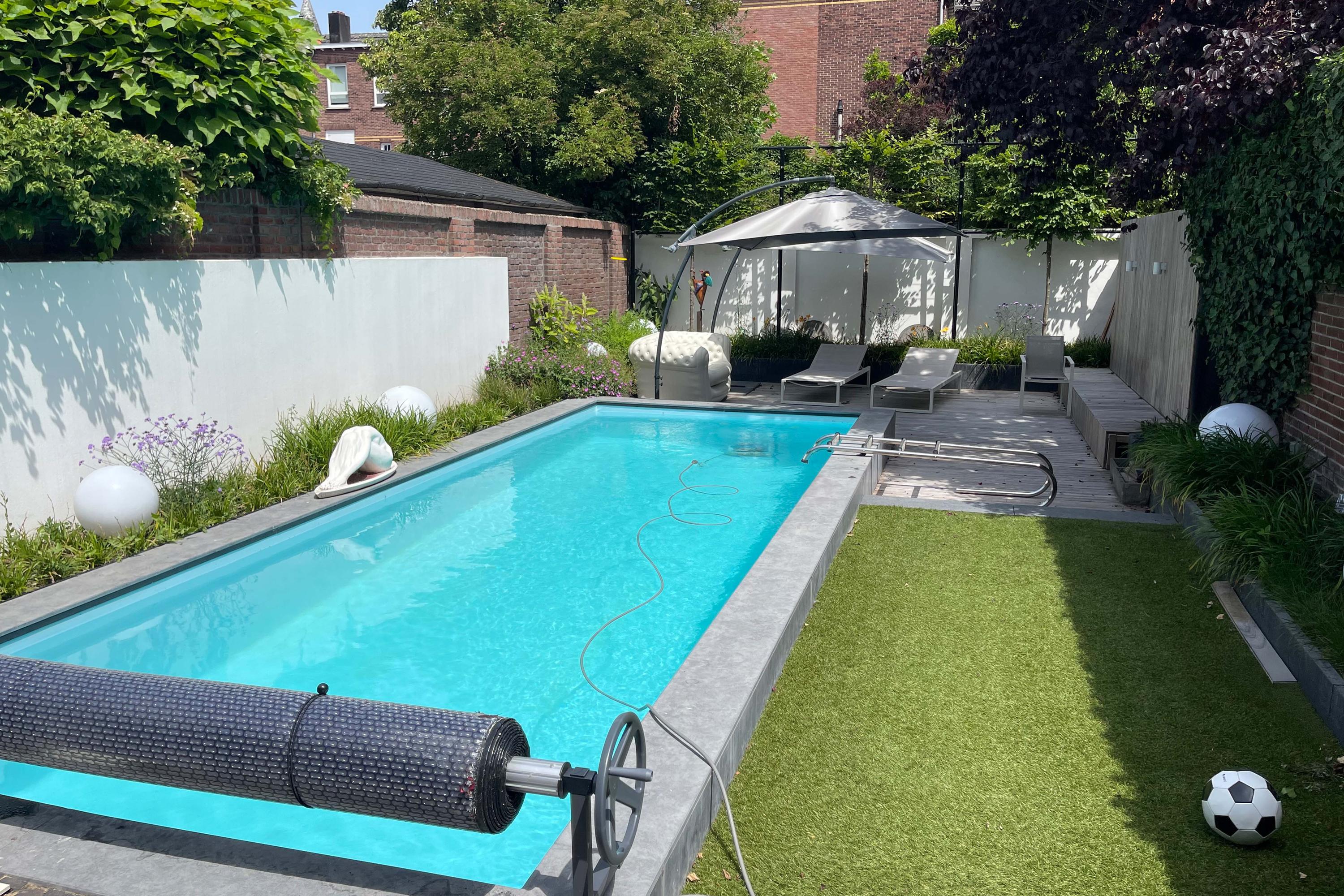 The architect-designed rear garden is wonderfully deep and, thanks to its multiple levels, offers excellent privacy. The garden includes a paved terrace, artificial grass and padauk wooden decking. It is fully walled, ensuring tranquillity despite being just steps away from Venlo’s city centre. The large garden features a heated swimming pool (with heat pump), outdoor electricity points and garden lighting.