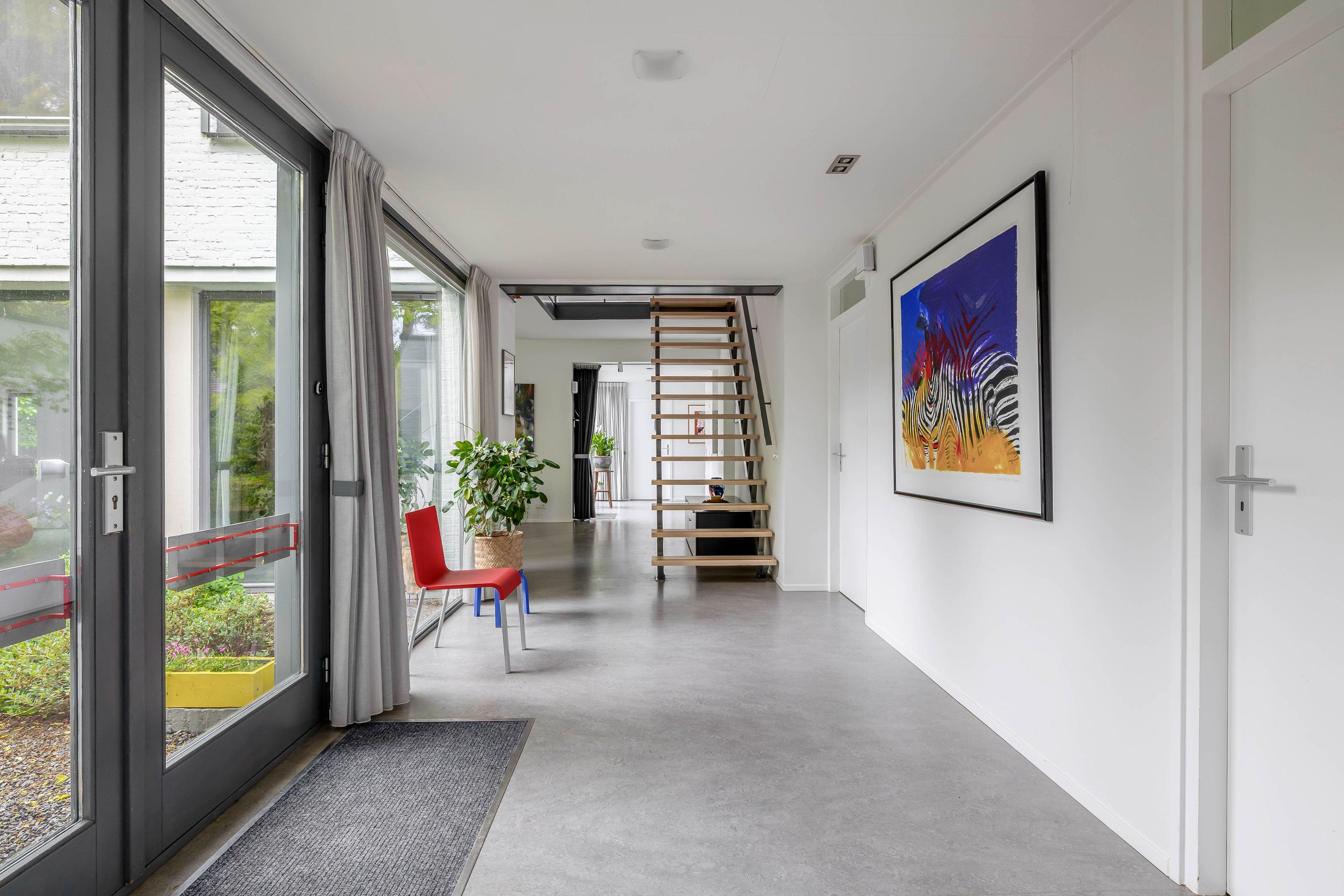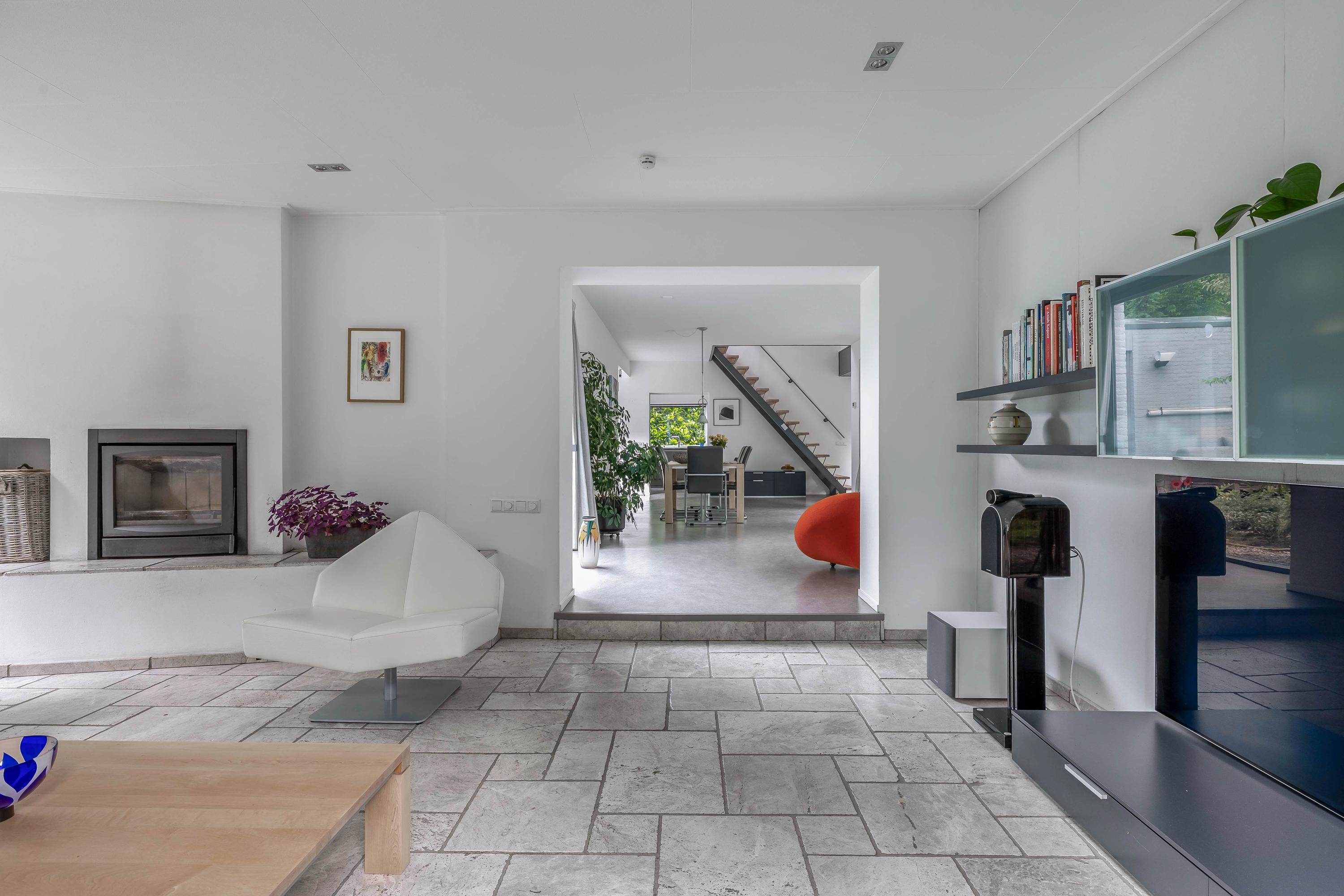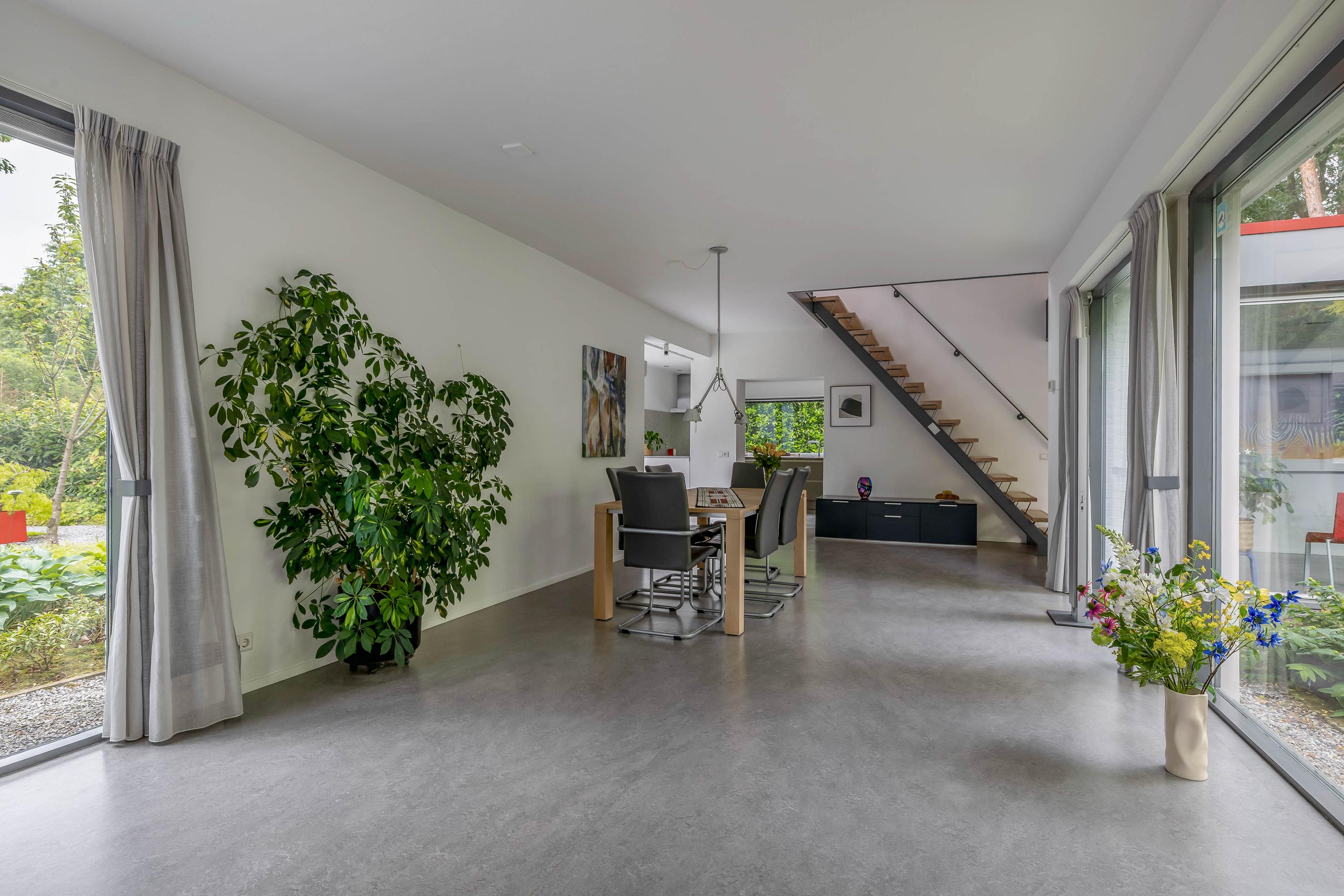 The open passageway from the entrance hall leads you to the bright and spacious living room. This is finished with sleek stucco on the walls and the large windows to floor level offer a view of the patio garden. The floors are equipped with underfloor heating and cooling, ensuring a pleasant climate in every season. An eye-catcher in the living room is the open staircase made of maple wood and steel leading to the upper floor.