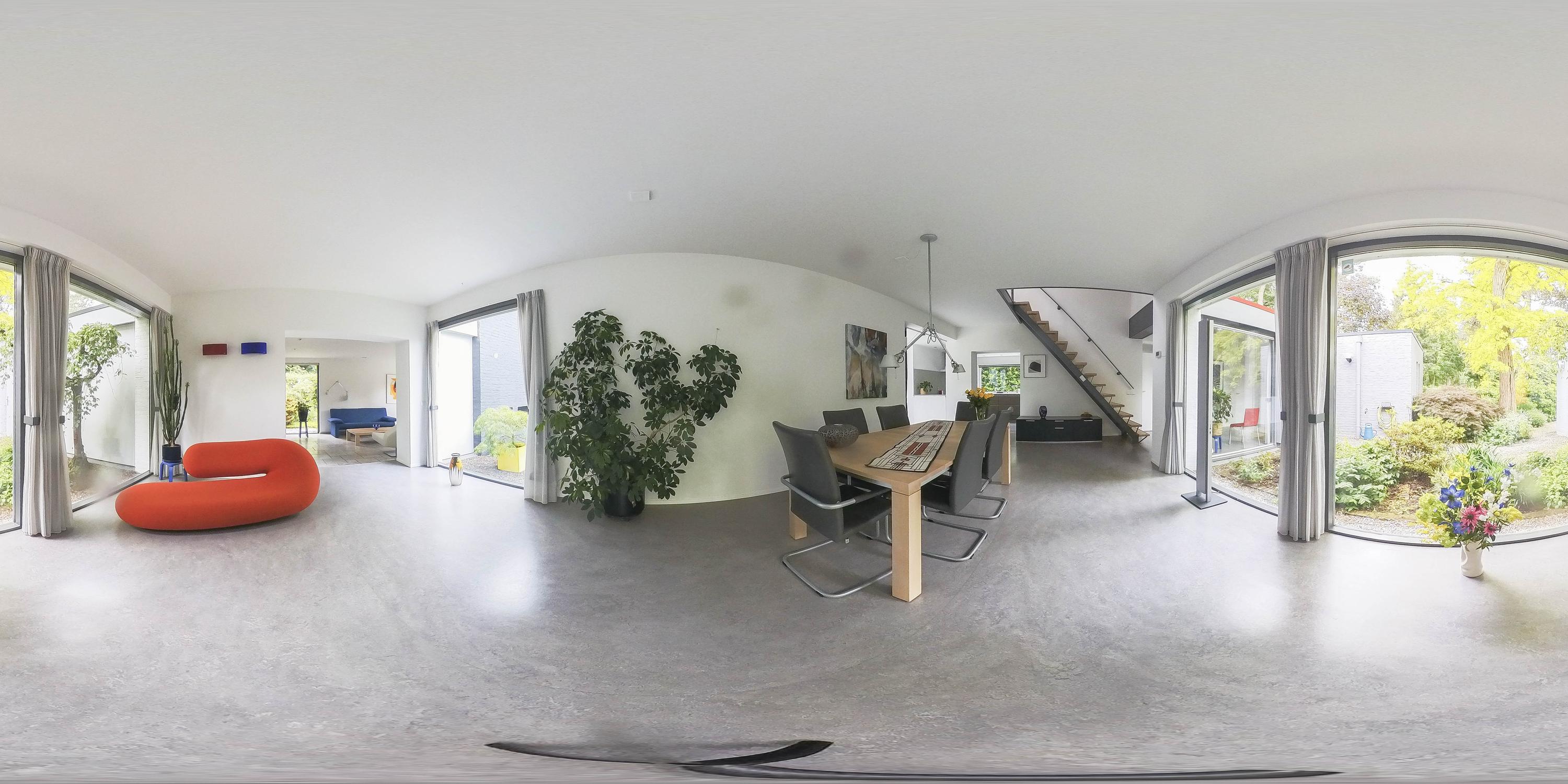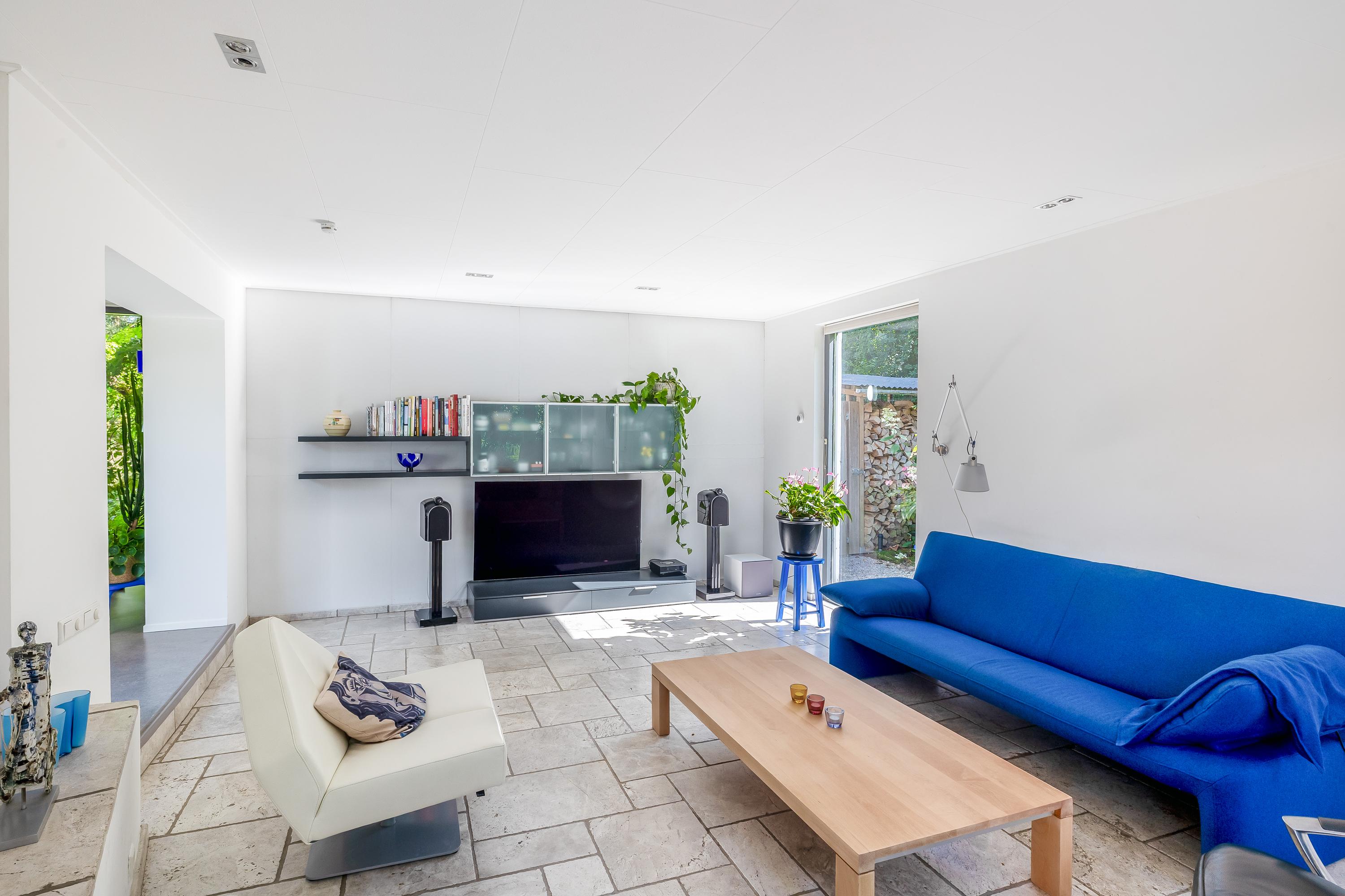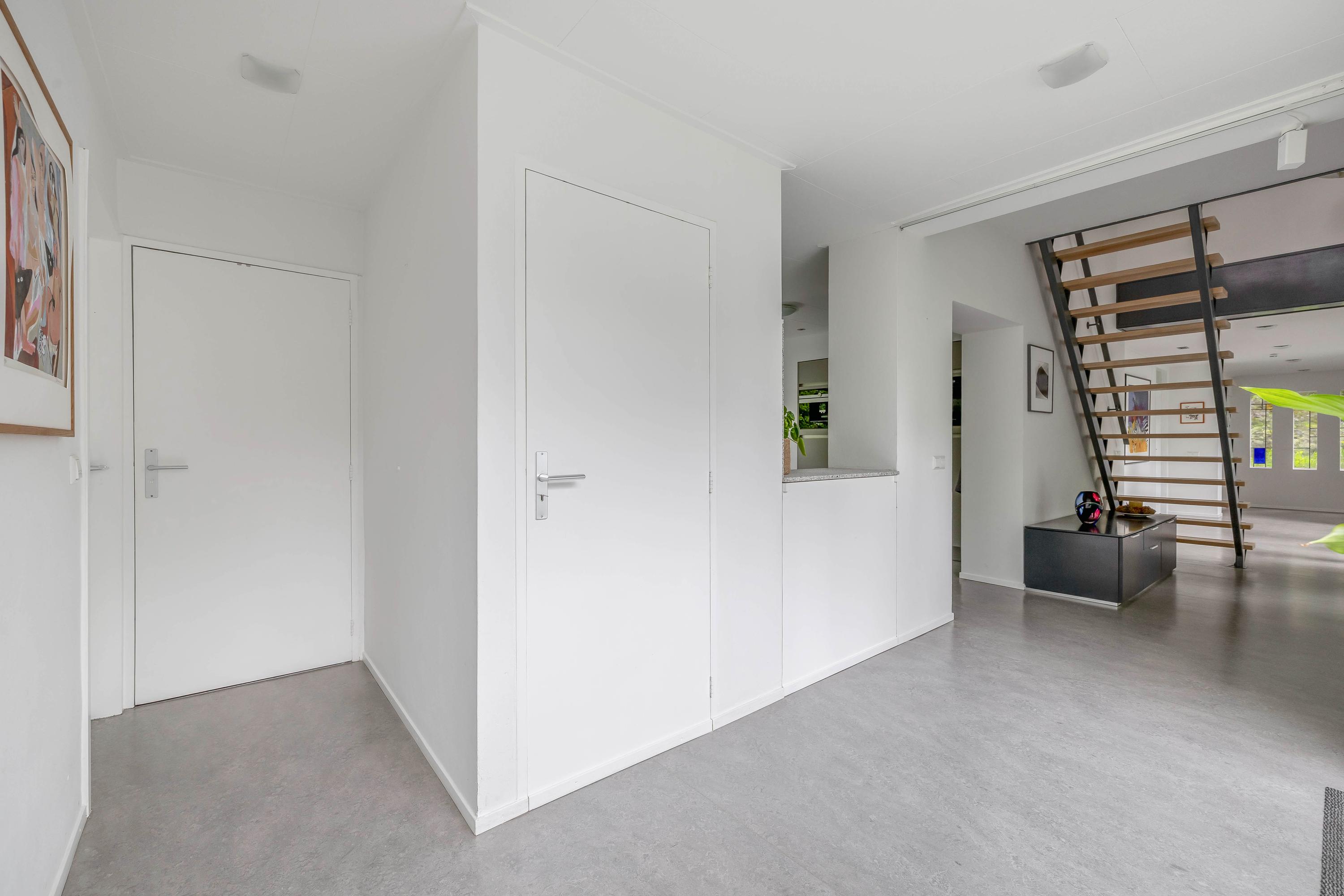 The open passageway from the entrance hall leads you to the bright and spacious living room. This is finished with sleek stucco on the walls and the large windows to floor level offer a view of the patio garden. The floors are equipped with underfloor heating and cooling, ensuring a pleasant climate in every season. An eye-catcher in the living room is the open staircase made of maple wood and steel leading to the upper floor.