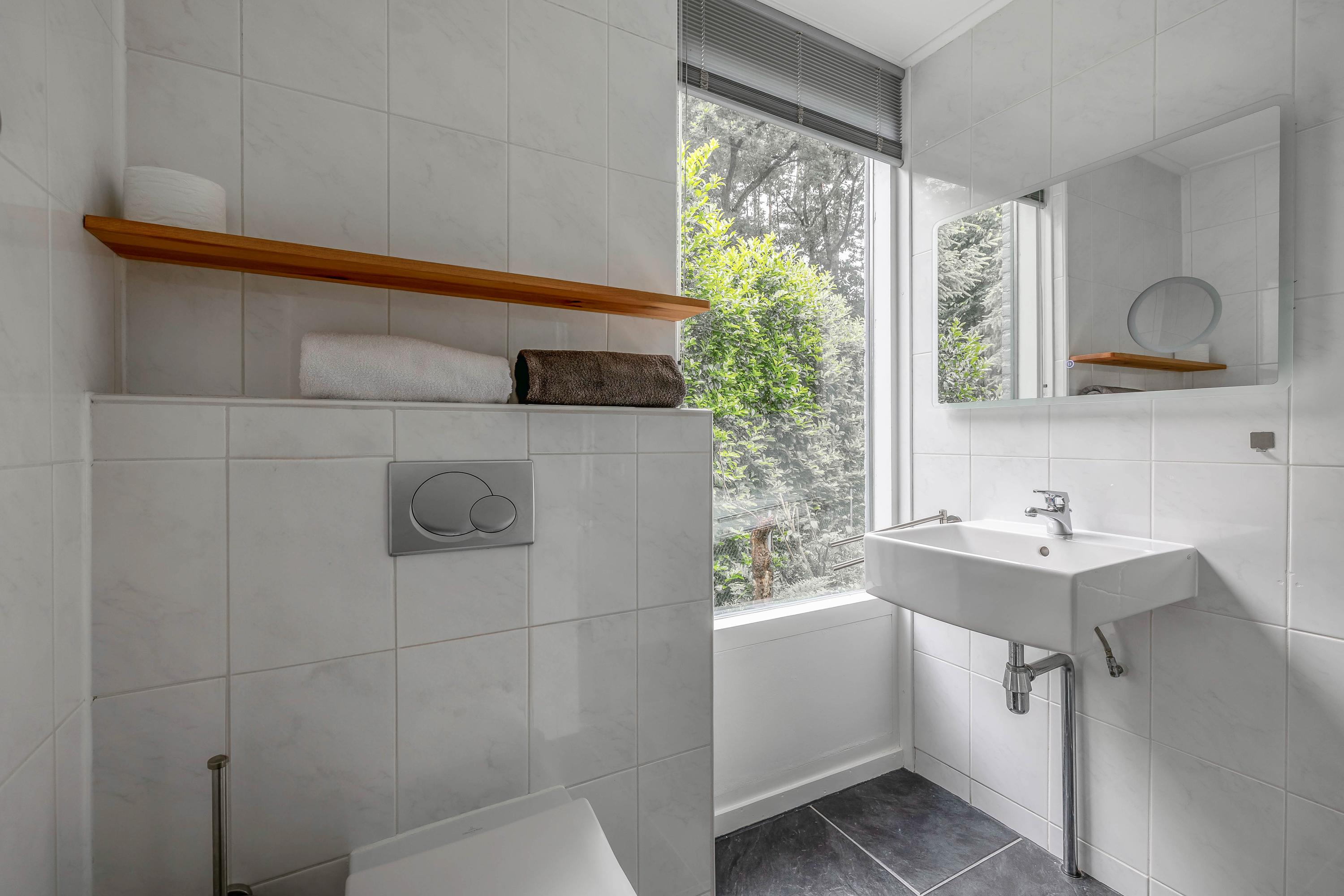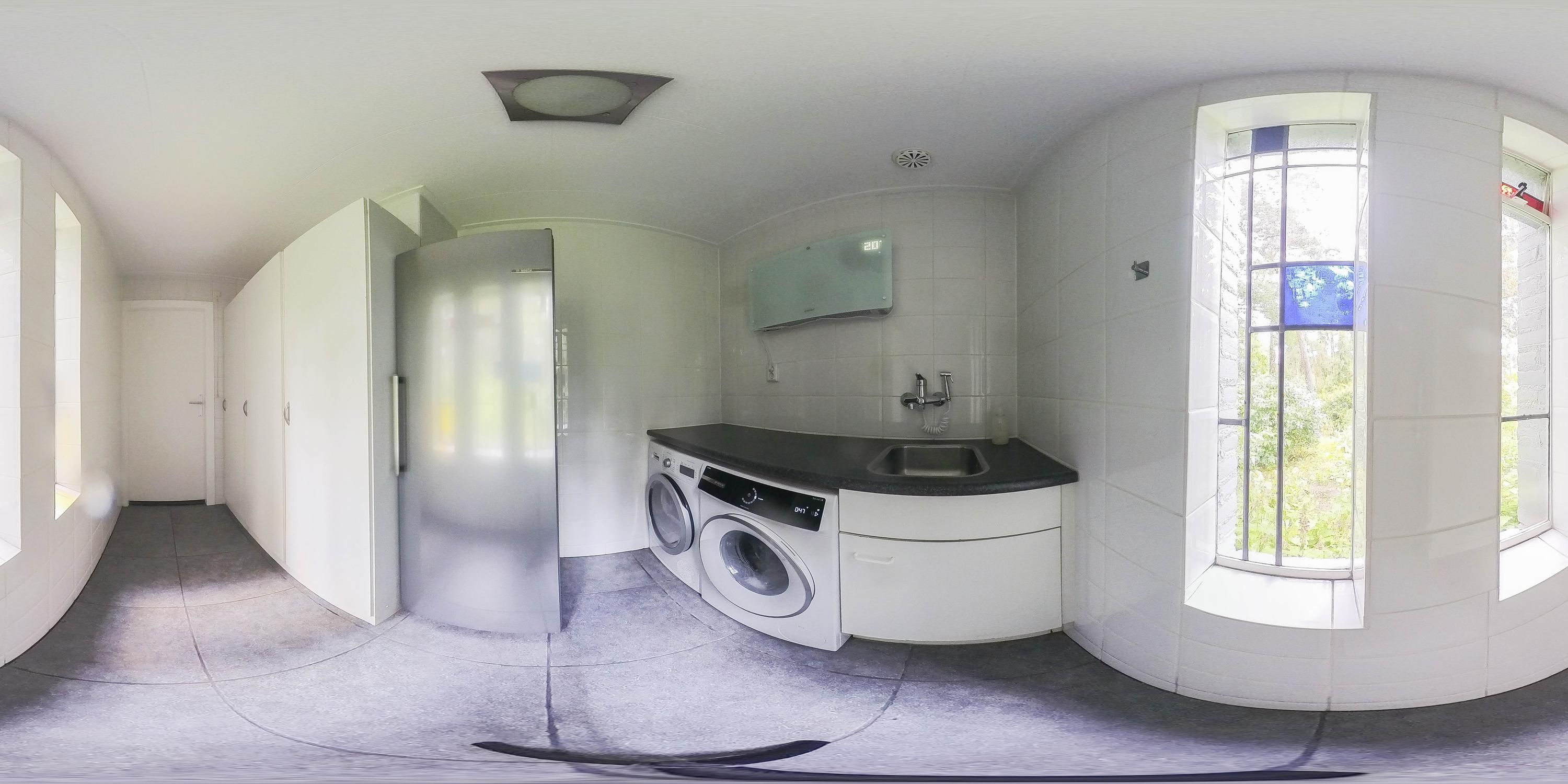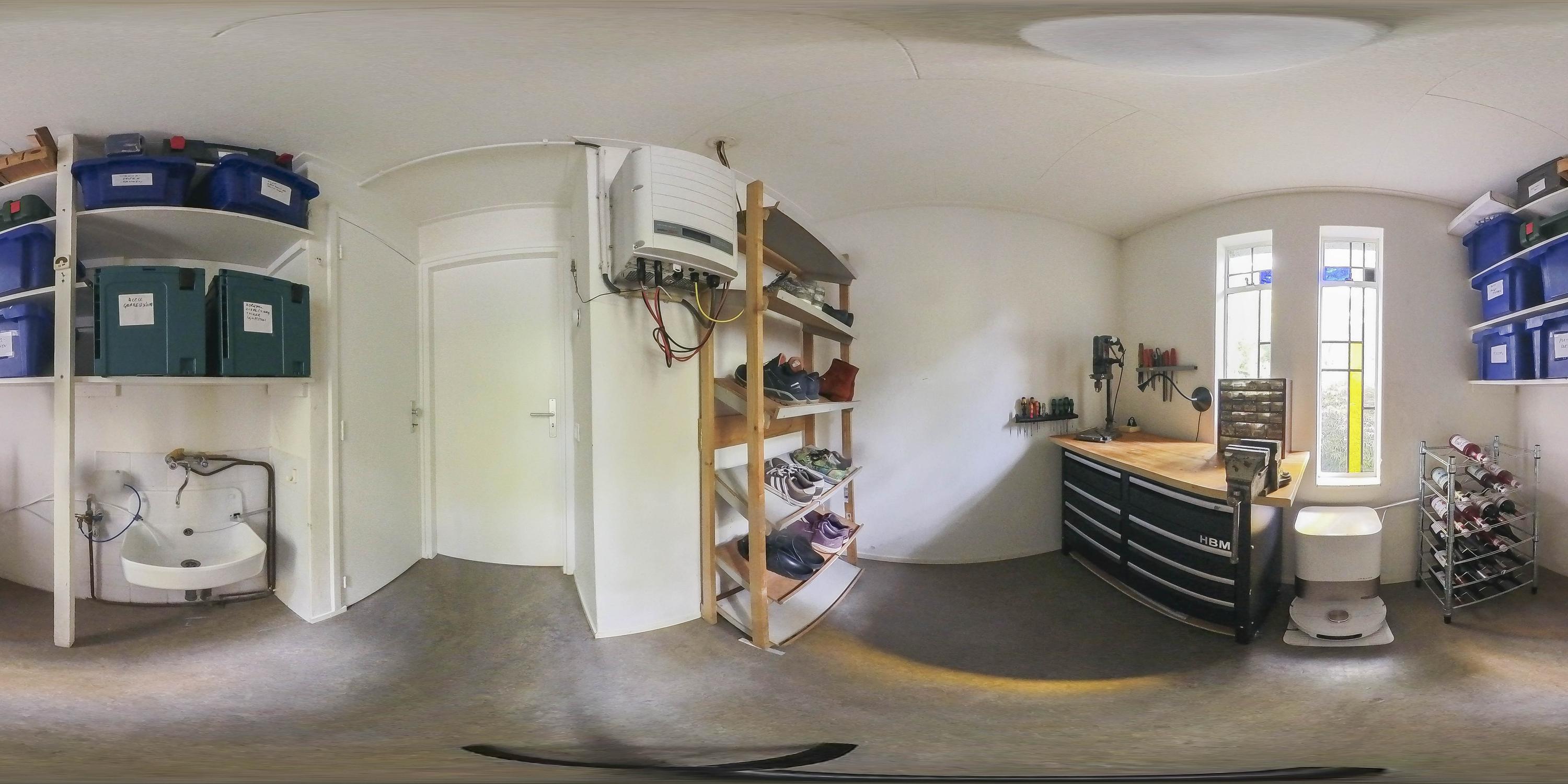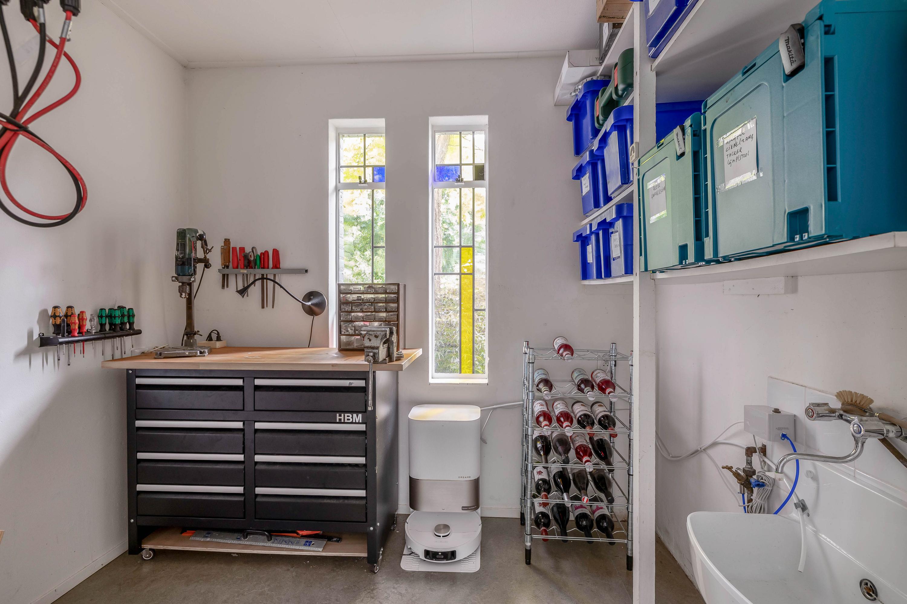 Here you will find not only a handy storage room with a renewed meter cupboard 3x25A and 12 groups, a sink, and the inverter for the solar panels, but also a laundry room with a sink, space for a washing machine and dryer, storage cupboards, and a fully tiled toilet with a washbasin and mechanical ventilation.