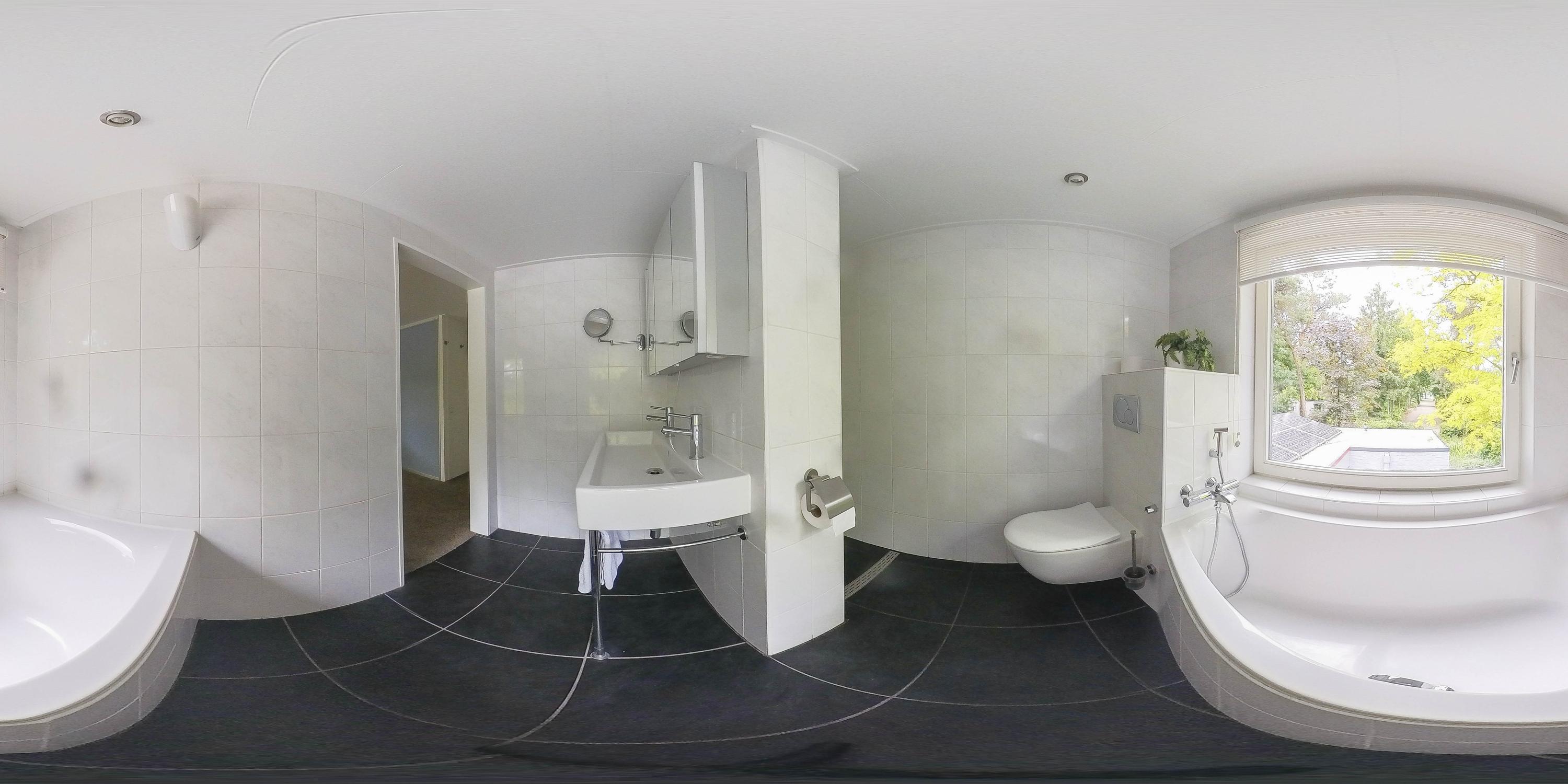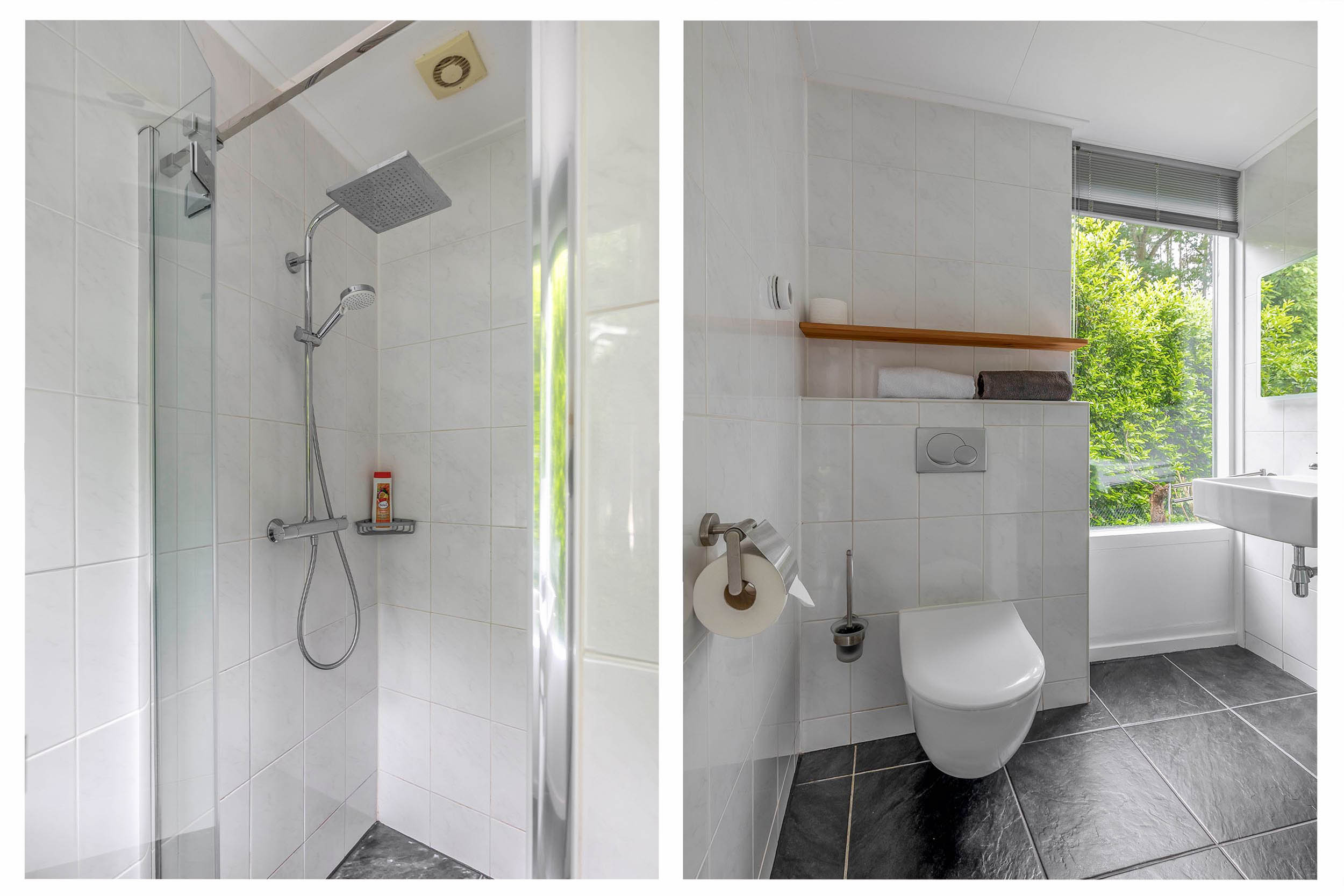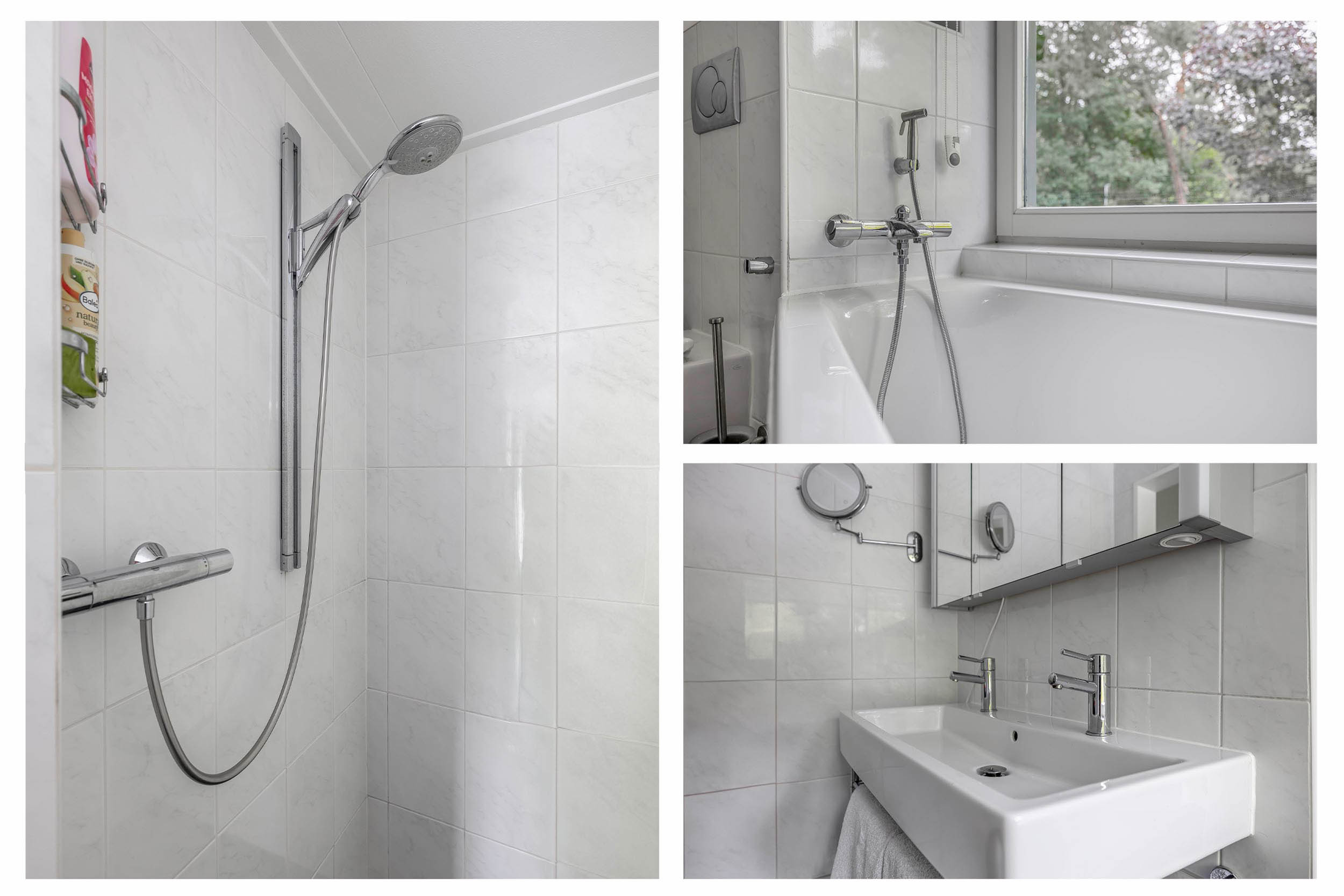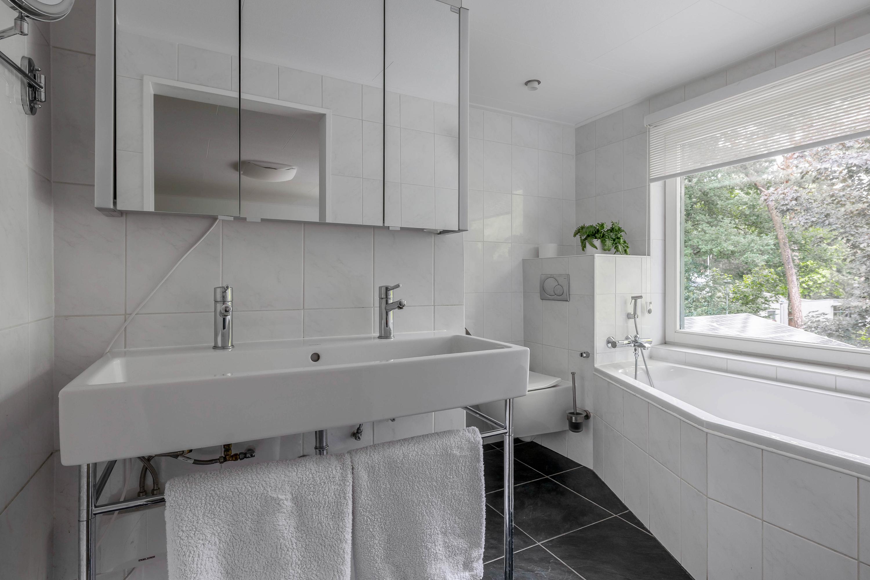 The second fully tiled bathroom, adjacent to bedroom 2, is fully equipped with a walk-in shower, a lovely bathtub, a thermostatic tap, a double sink with mixer tap, and a flow-through boiler.