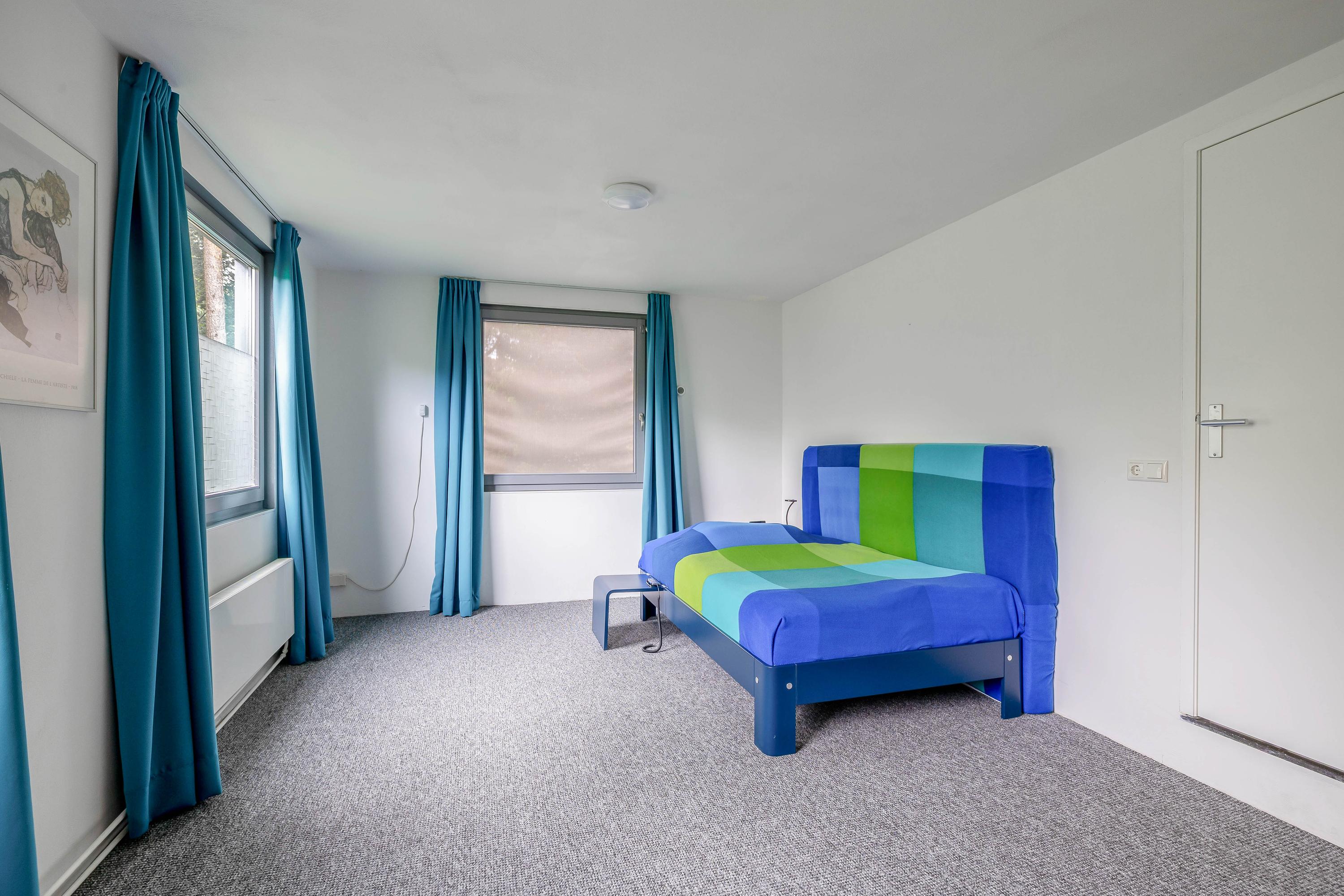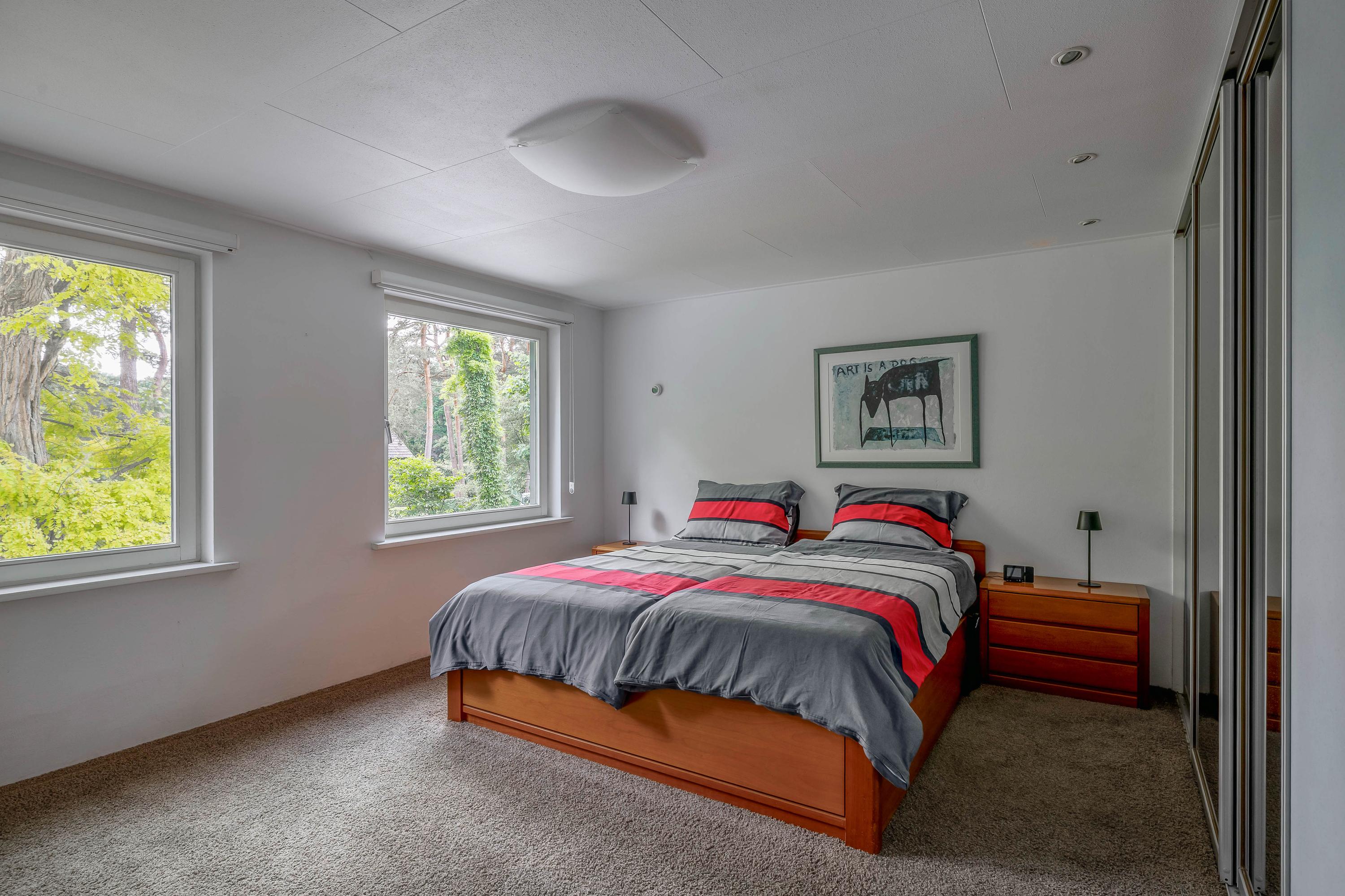 The spacious bedroom 1 is finished with stucco walls and ceiling and carpeted flooring. Thanks to the tilt and turn windows, natural light flows in abundantly here; some windows are equipped with insect screens and/or