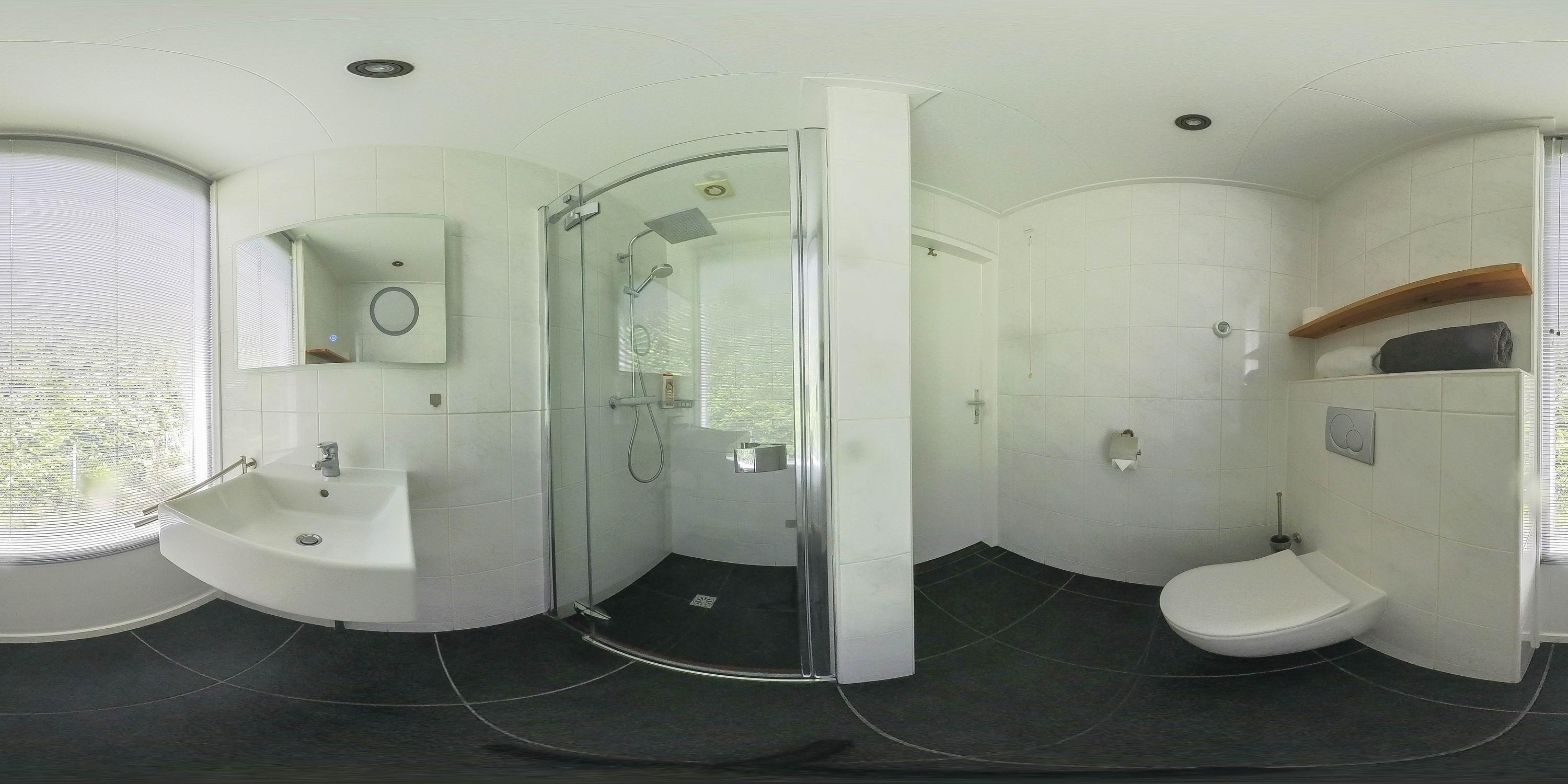 Adjacent is the fully tiled bathroom. Here you can enjoy a spacious shower room with glass door, rain shower with thermostat, mechanical ventilation, sink with illuminated and heated mirror, and a toilet.