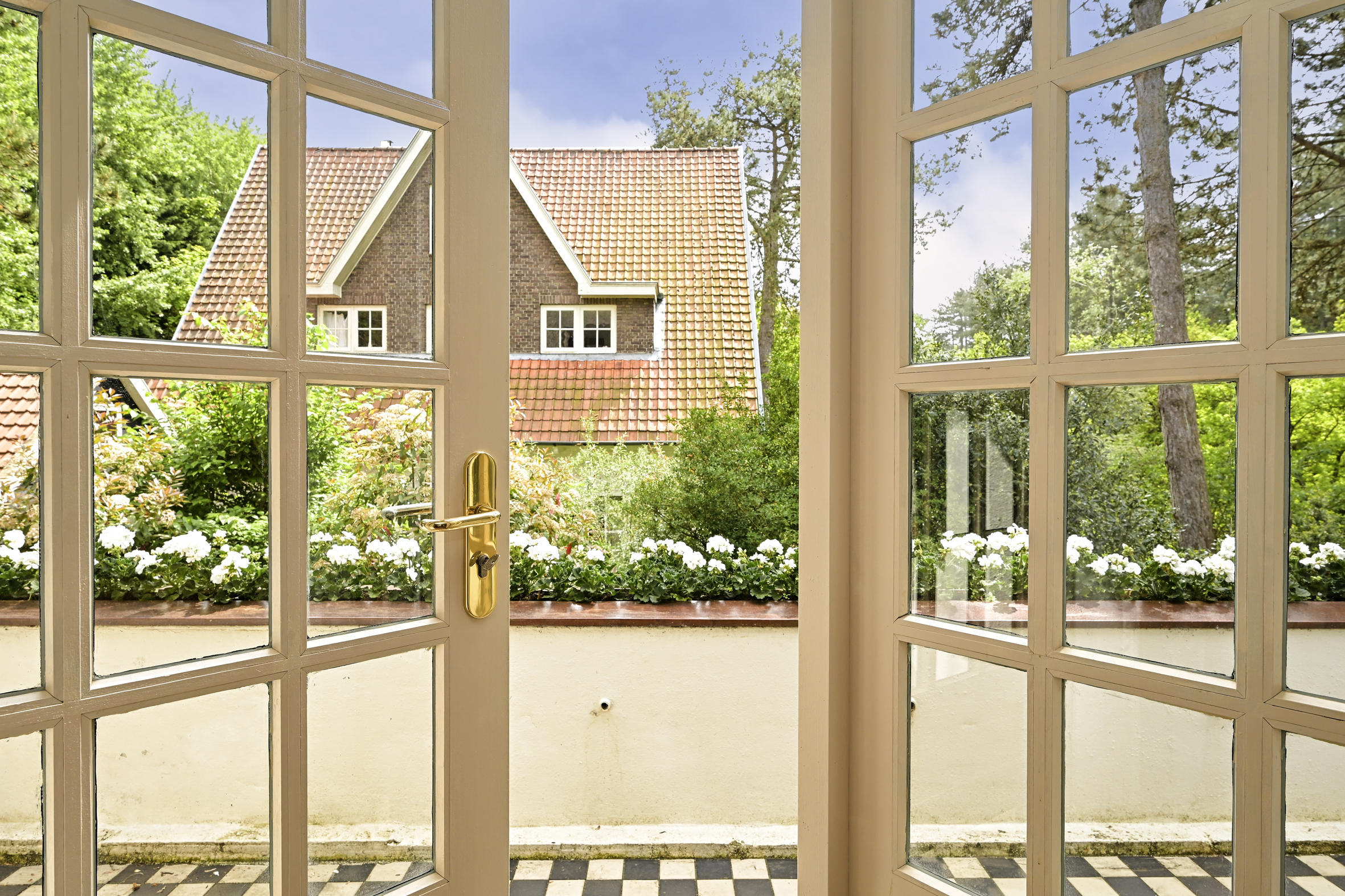 The garden wraps halfway around the house and is very sunny due to its free and open setting. In addition to the original garage, which was once connected to the dining room and could easily be reintegrated into the house, a newer, large garage has been added to the plot. This garage is suitable for many purposes, has an automatic overhead door, and provides passage to the back garden.