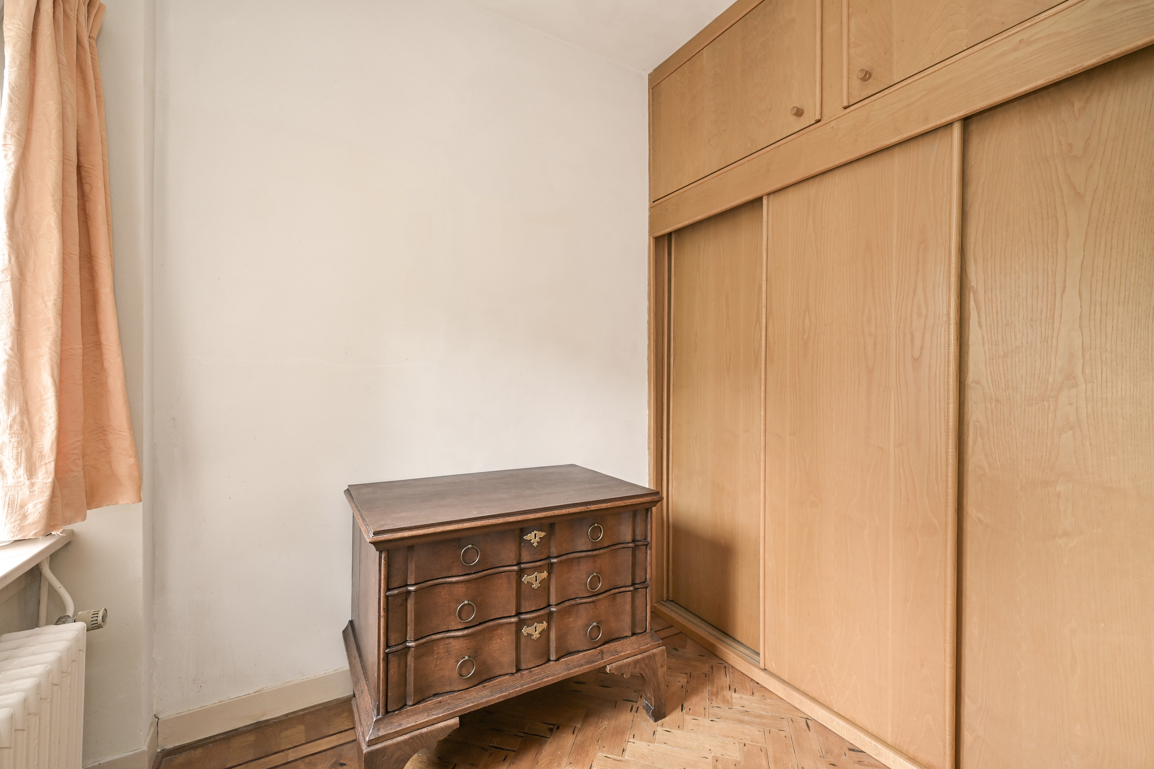 A spacious hall welcomes you with mosaic flooring, leading to an elegant living and dining area with stained glass sliding doors, fireplace, and marble windowsills. This flowing space opens directly to the garden, inviting natural light and outdoor ambiance. The kitchen, set with a semi-open plan and direct garden access, adjoins a practical utility room as well as a cellar of 23 m² arranged in three rooms.