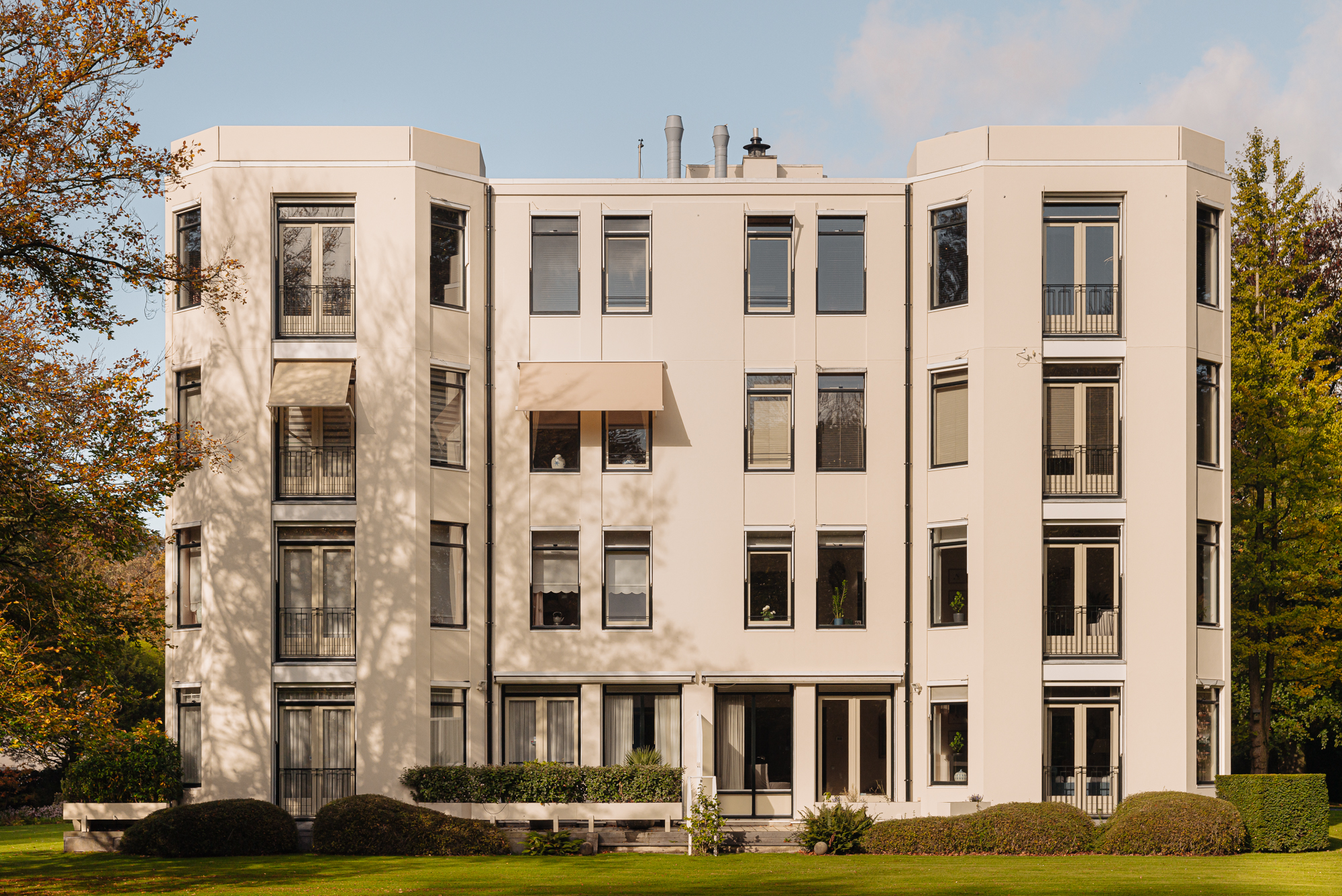 Beautifully situated 4-room penthouse (approx. 265 m² living space) with large balconies on the third floor of a small apartment complex on the Rust en Vreugd Estate. Originally two apartments, it was completely renovated and redesigned in 2009. You will find high-quality materials and luxurious details, including a custom-made interior and air conditioning. There are also two parking spaces and a storage unit in the basement.