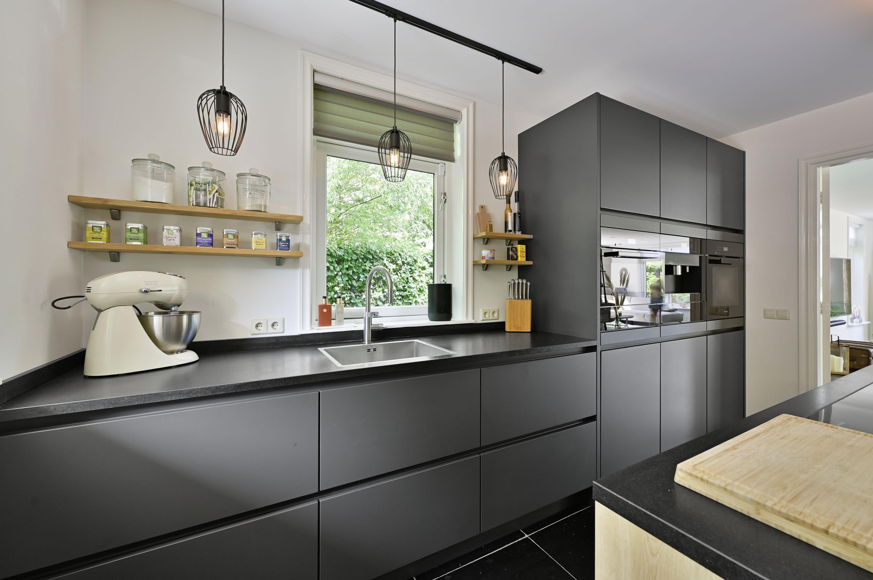 Upon entering the house, the spacious and tall staircase immediately catches the eye. Thanks to the large skylight above the stairwell, this central and highly representative hallway is remarkably bright. The hall offers a practical cloakroom, the meter cupboard, and a spacious toilet with a washbasin. From the hall, you enter the living room. This L-shaped living room is located at the front of the house and offers beautiful views of the front and side garden through the many low windows. A charming wood-burning stove (Dick Geurts) forms the cosy heart of the room. To the side is a delightful bay window with double doors leading to a decked terrace by the water — a perfect place to unwind.