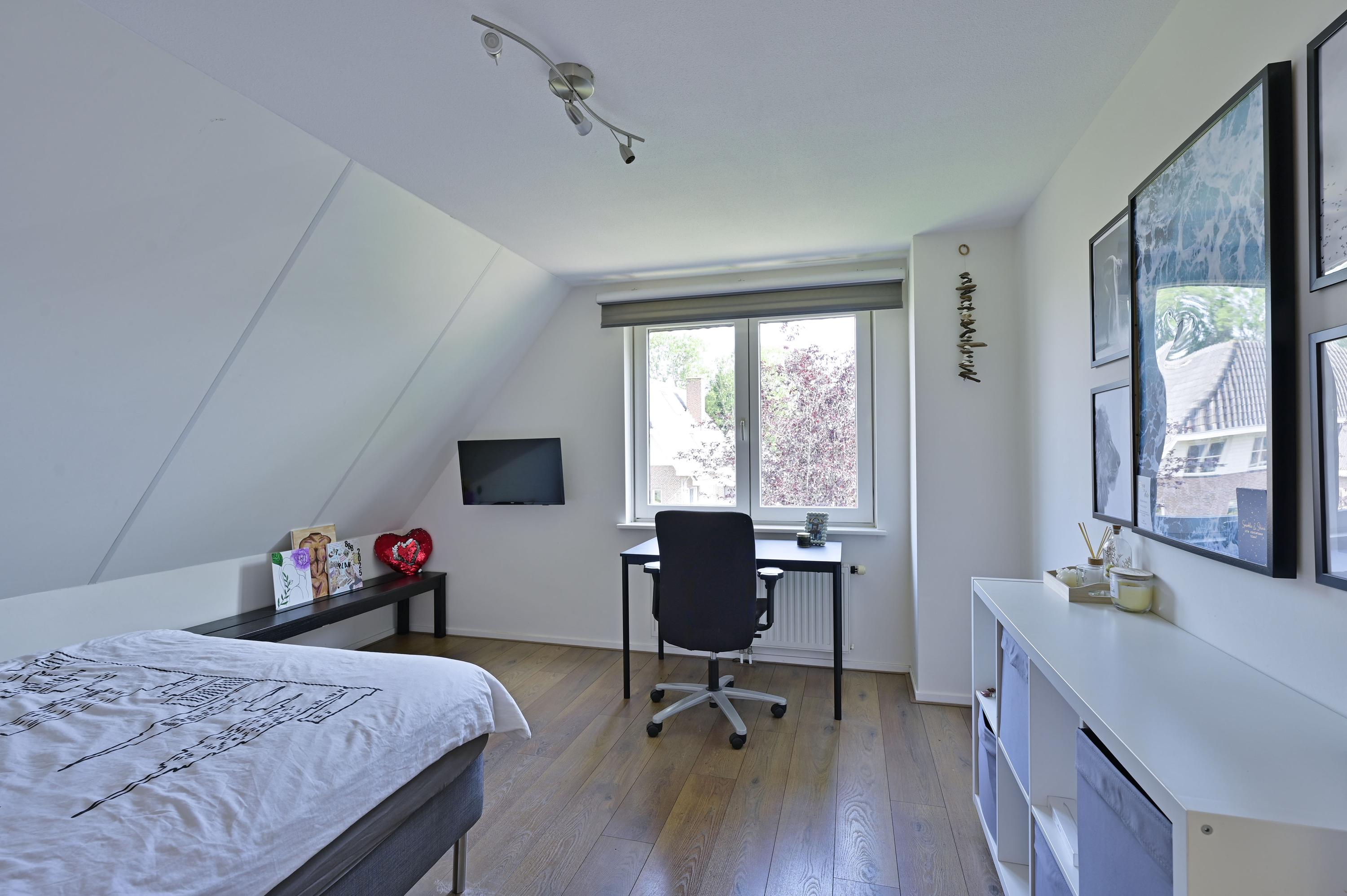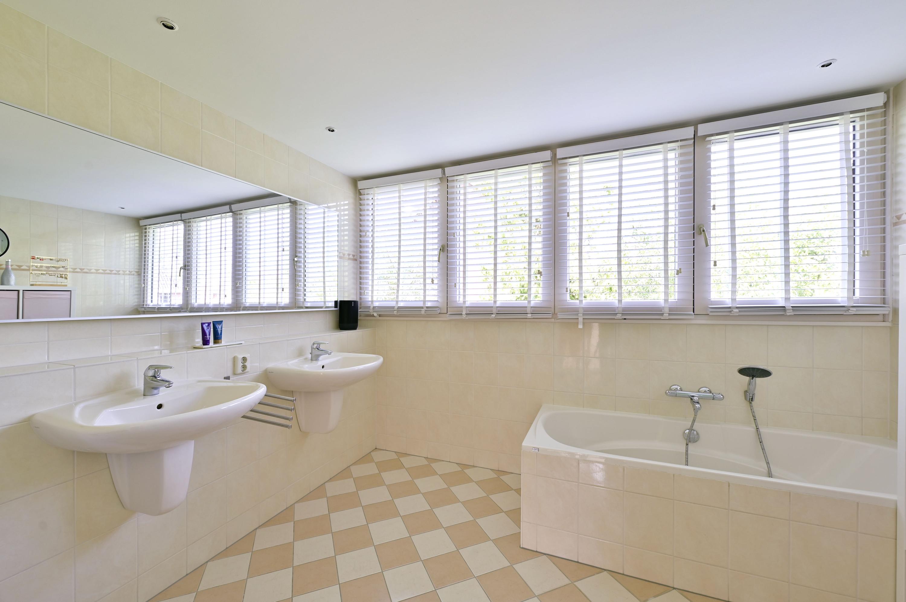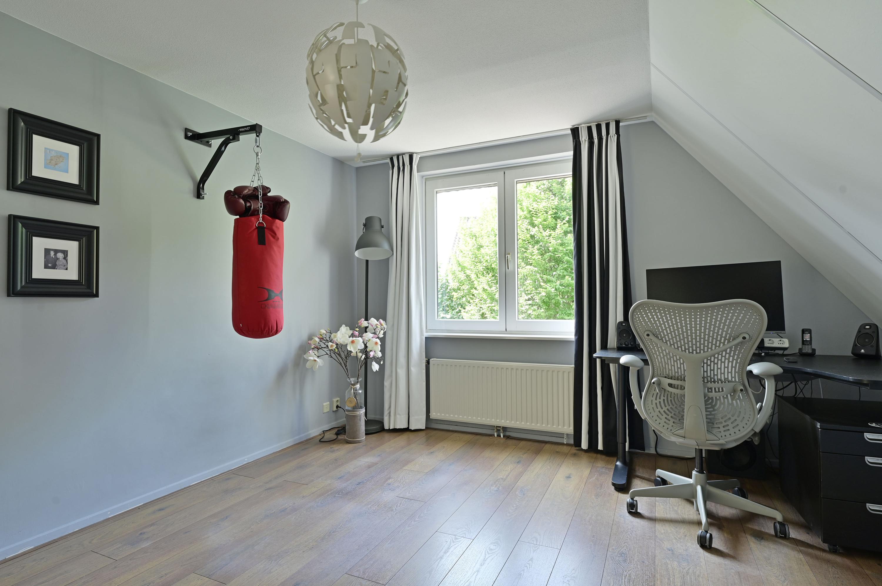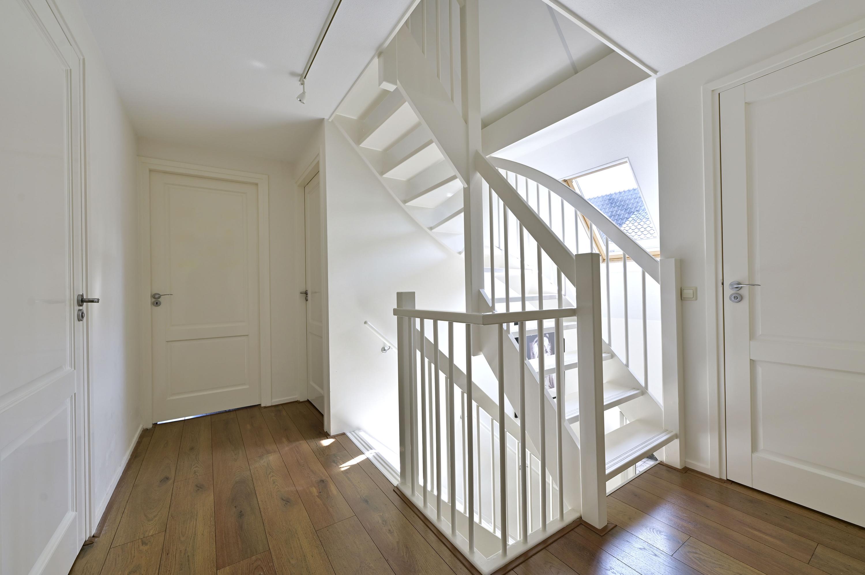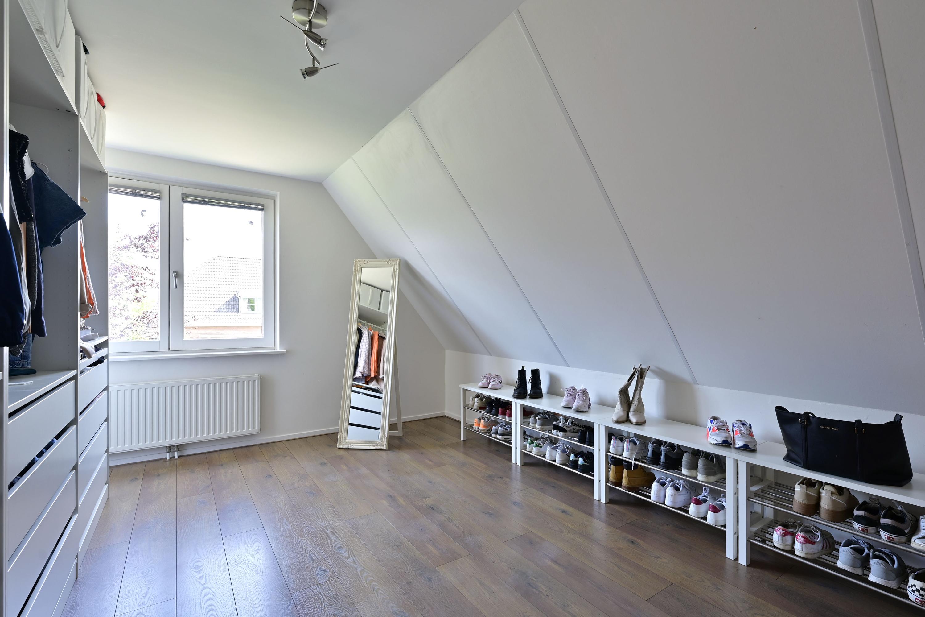A spacious landing provides access to four generously sized bedrooms, all bright thanks to large windows. A separate toilet is also located on this floor. The luxurious bathroom features a broad dormer window and offers comfort with a bathtub, walk-in shower with glass screen, rain shower, hand shower, double washbasin, and underfloor heating.