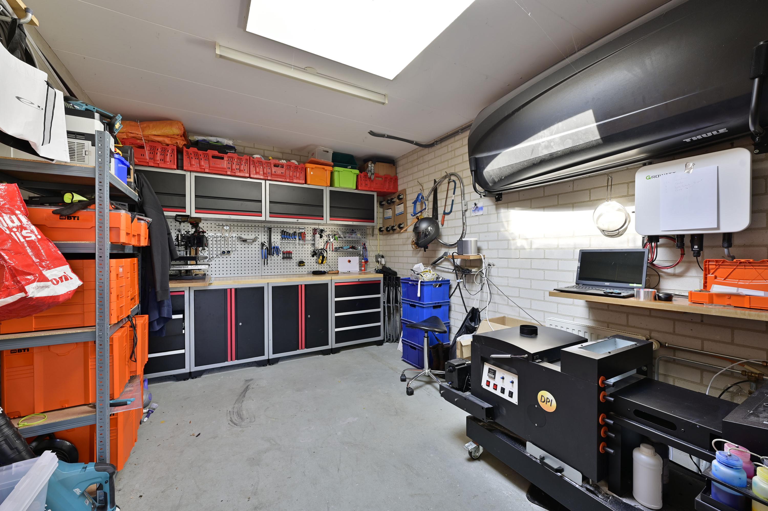 A private, wide bridge provides access to the underpinned driveway with parking space for four cars. The entrance features a covered porch by both the front door and the garage, allowing you to enter the house dry and sheltered. The attached garage is equipped with electricity, heating, and a skylight for additional natural light — ideal as a hobby space or workshop.
