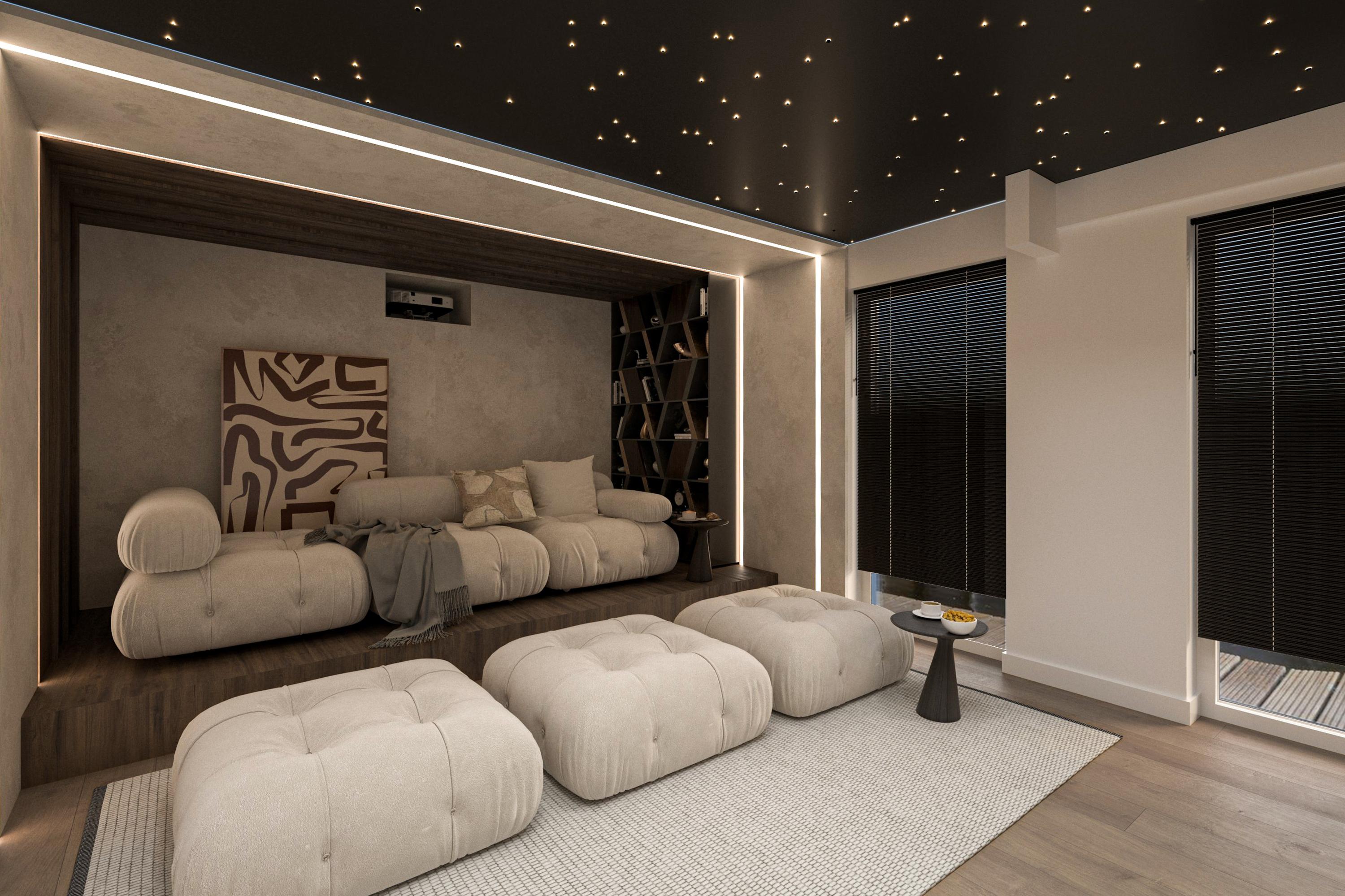 On the left side, directly adjacent to the boathouse, are two generous rooms. One is pre-equipped as a home cinema, with all connections already in place, while the other is ideally suited as a study or hobby room.