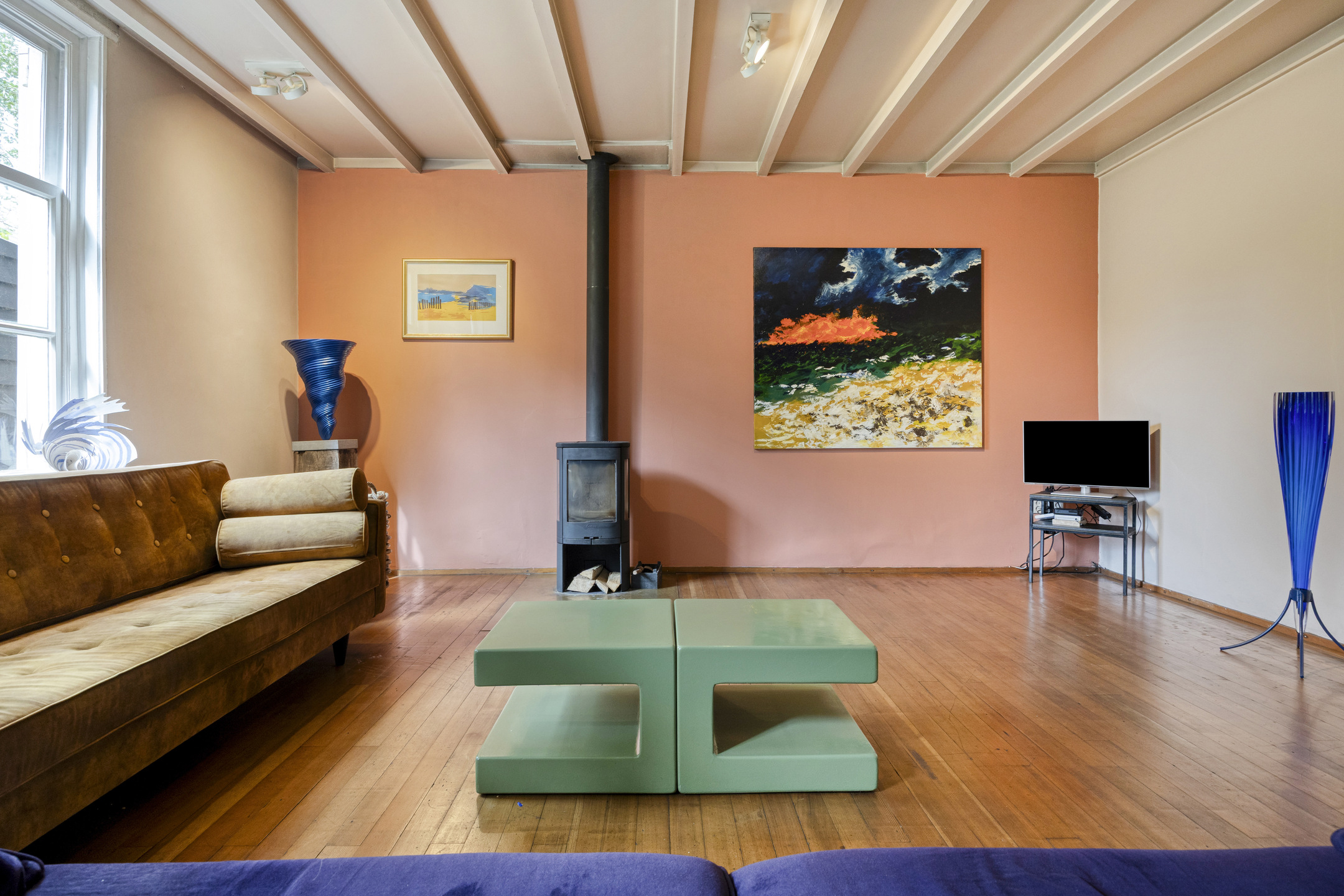 Living room with wood-burning fireplace and double-walled flue; plastered walls, solid wooden floor laid over tiled flooring (monastery tiles), exposed beam ceiling;