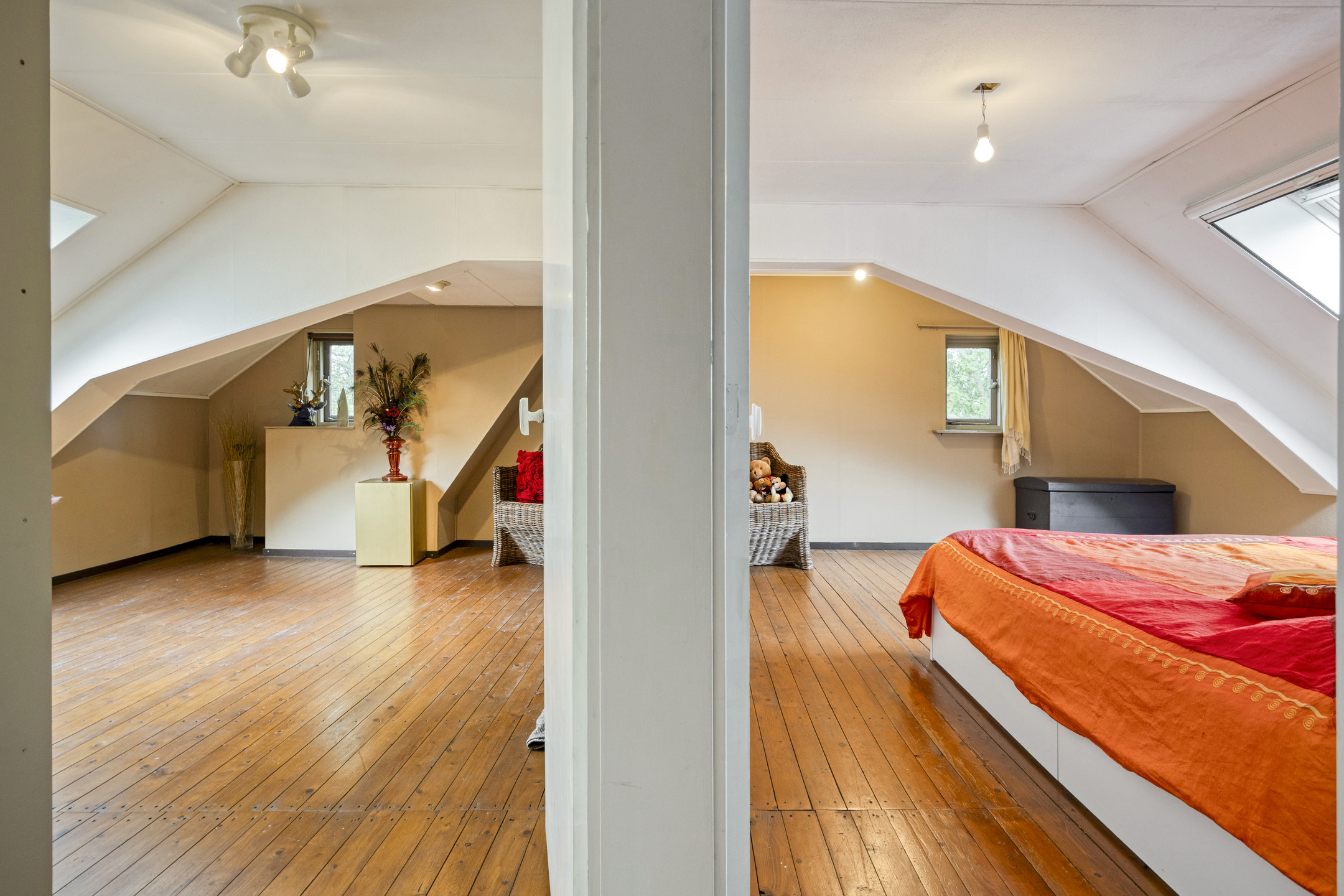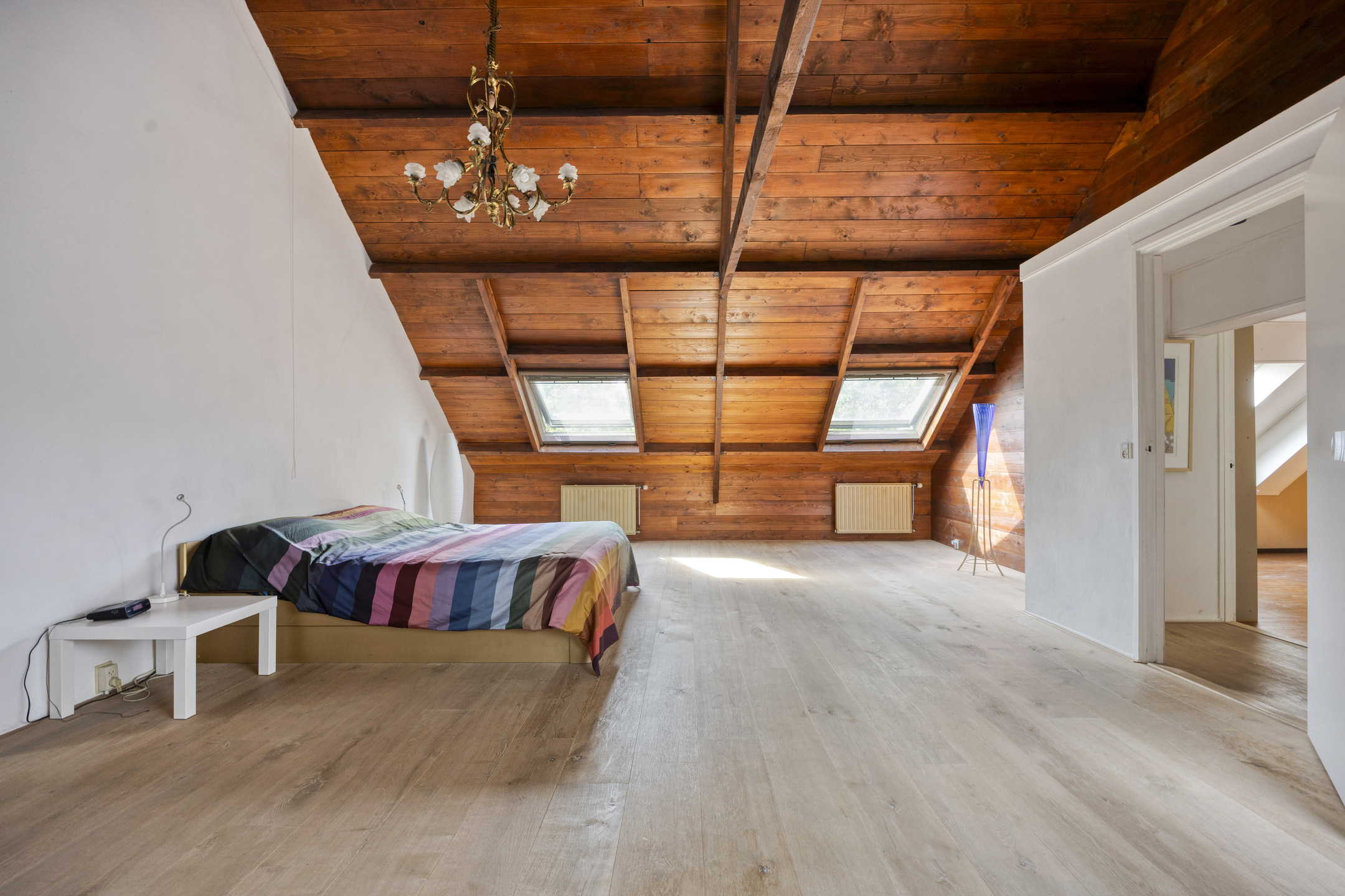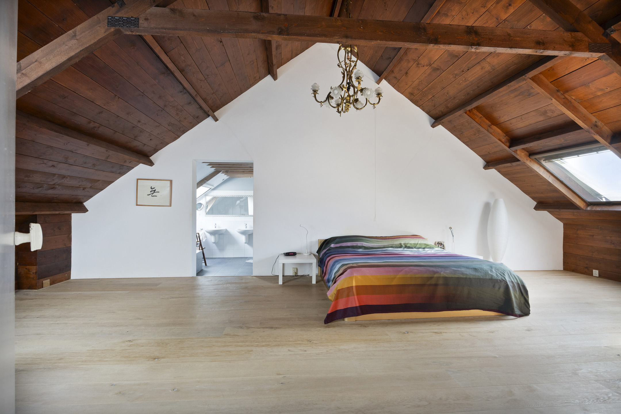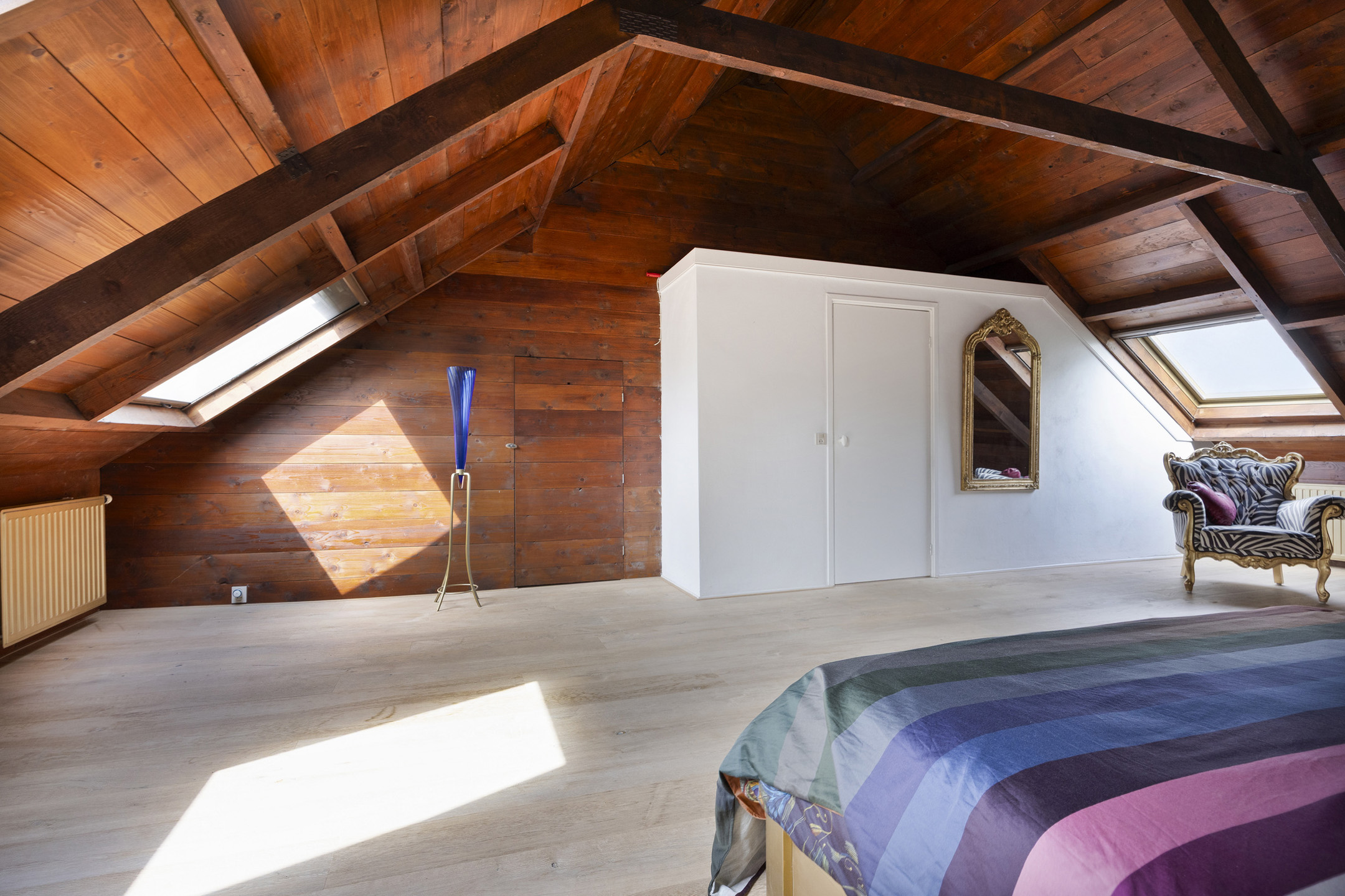 Master bedroom with three roof windows, plastered walls, laminate flooring with oak top layer, beautiful view of the wooden beam structure, walk-in closet with inverter and roof window;