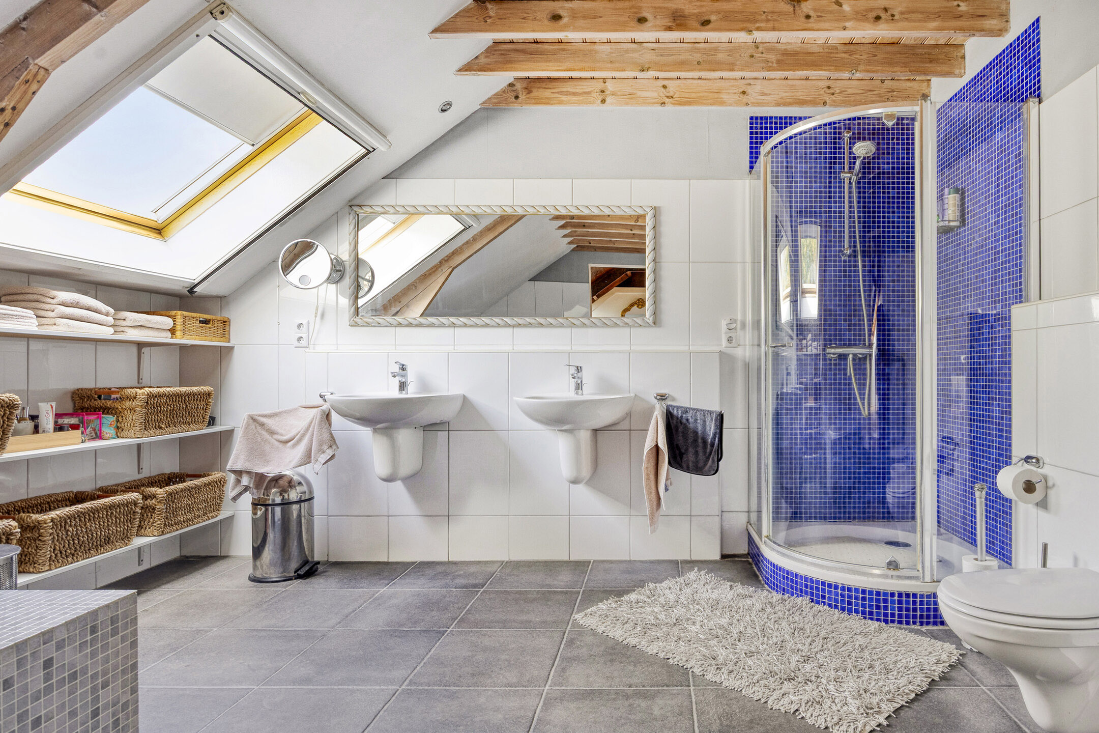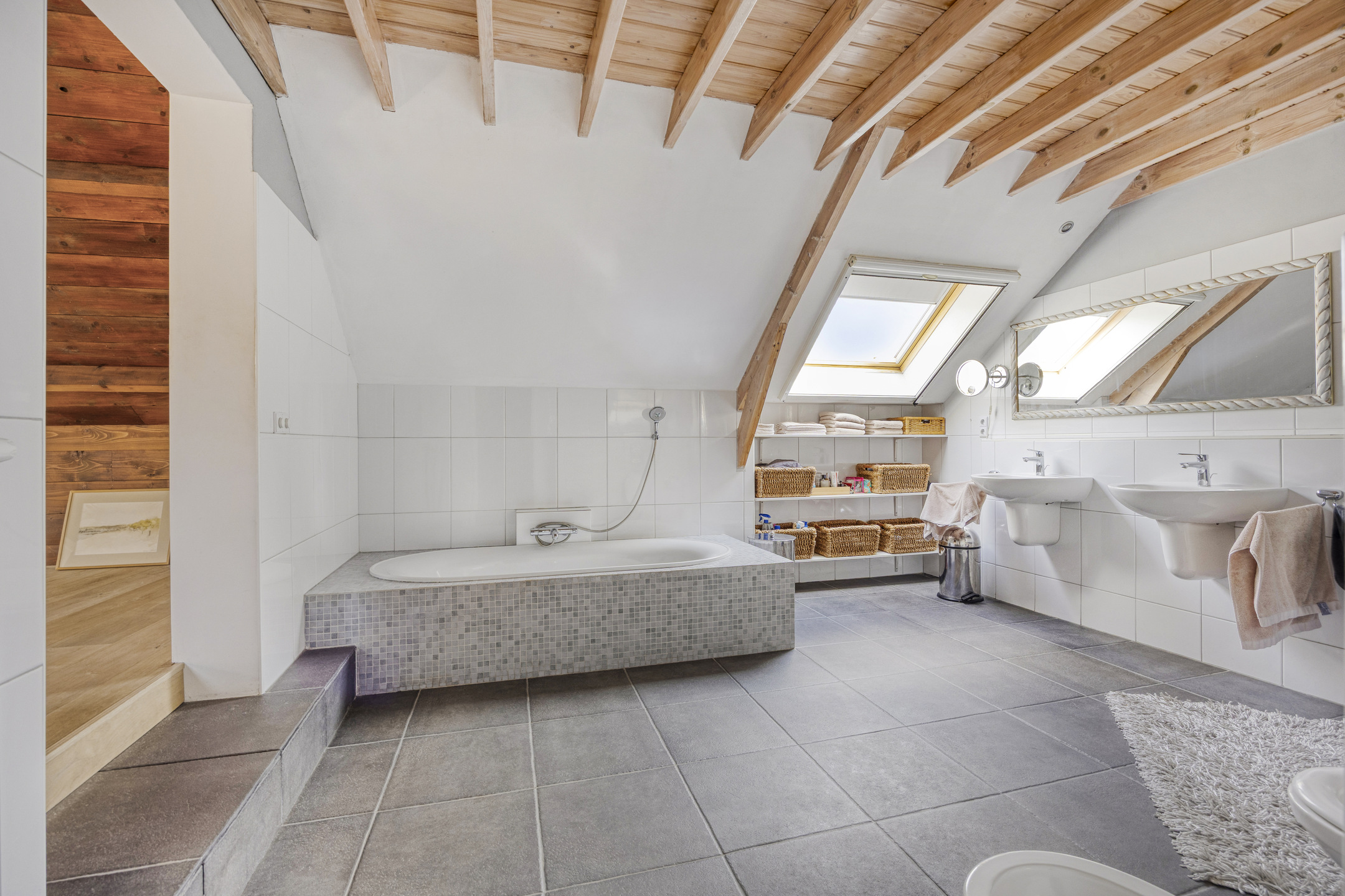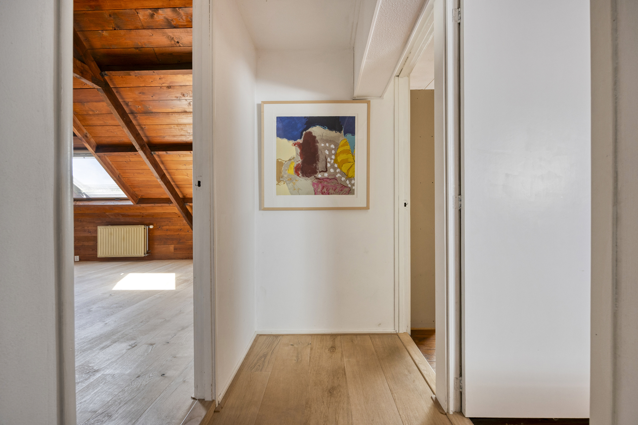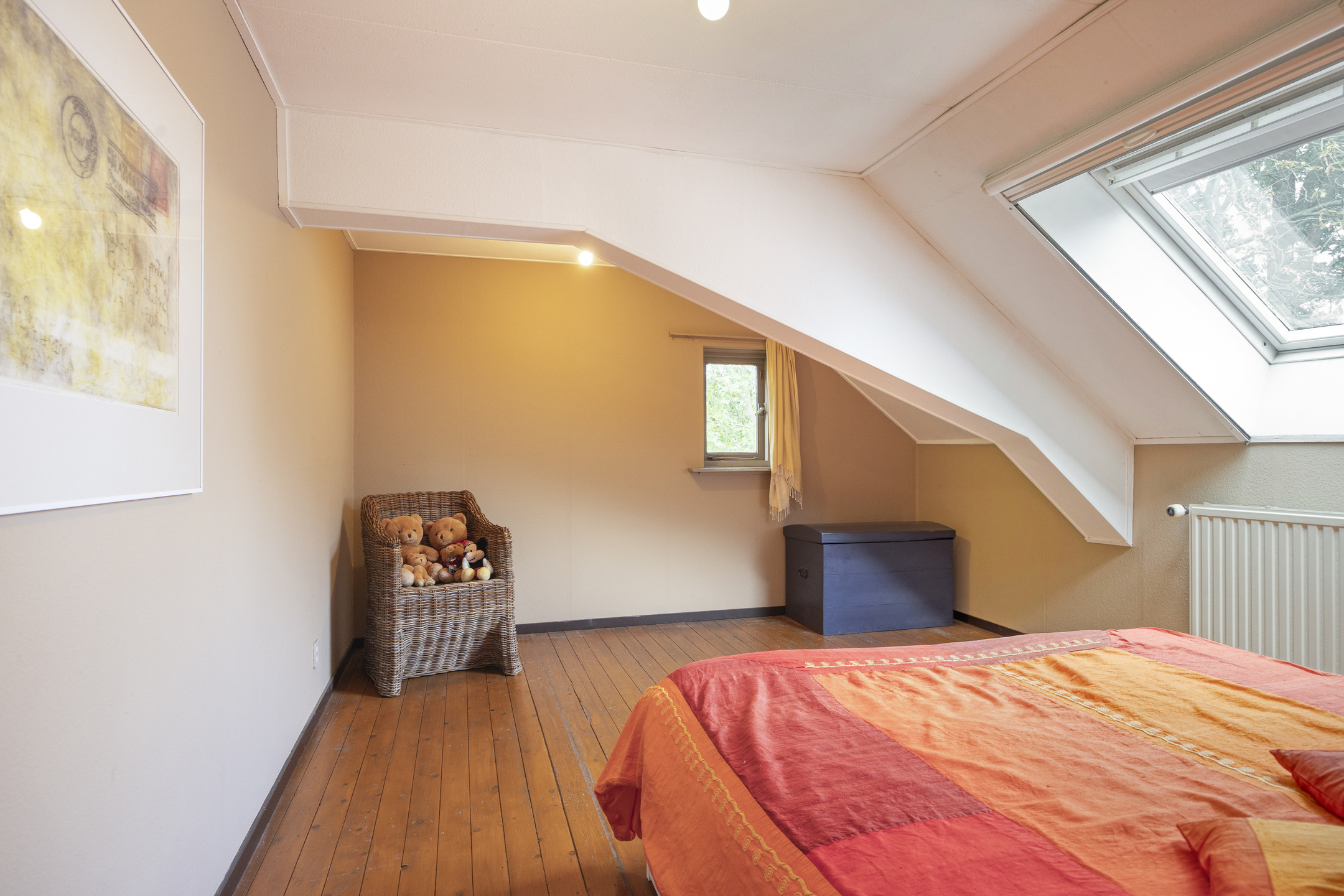 Master bedroom with three roof windows, plastered walls, laminate flooring with oak top layer, beautiful view of the wooden beam structure, walk-in closet with inverter and roof window;