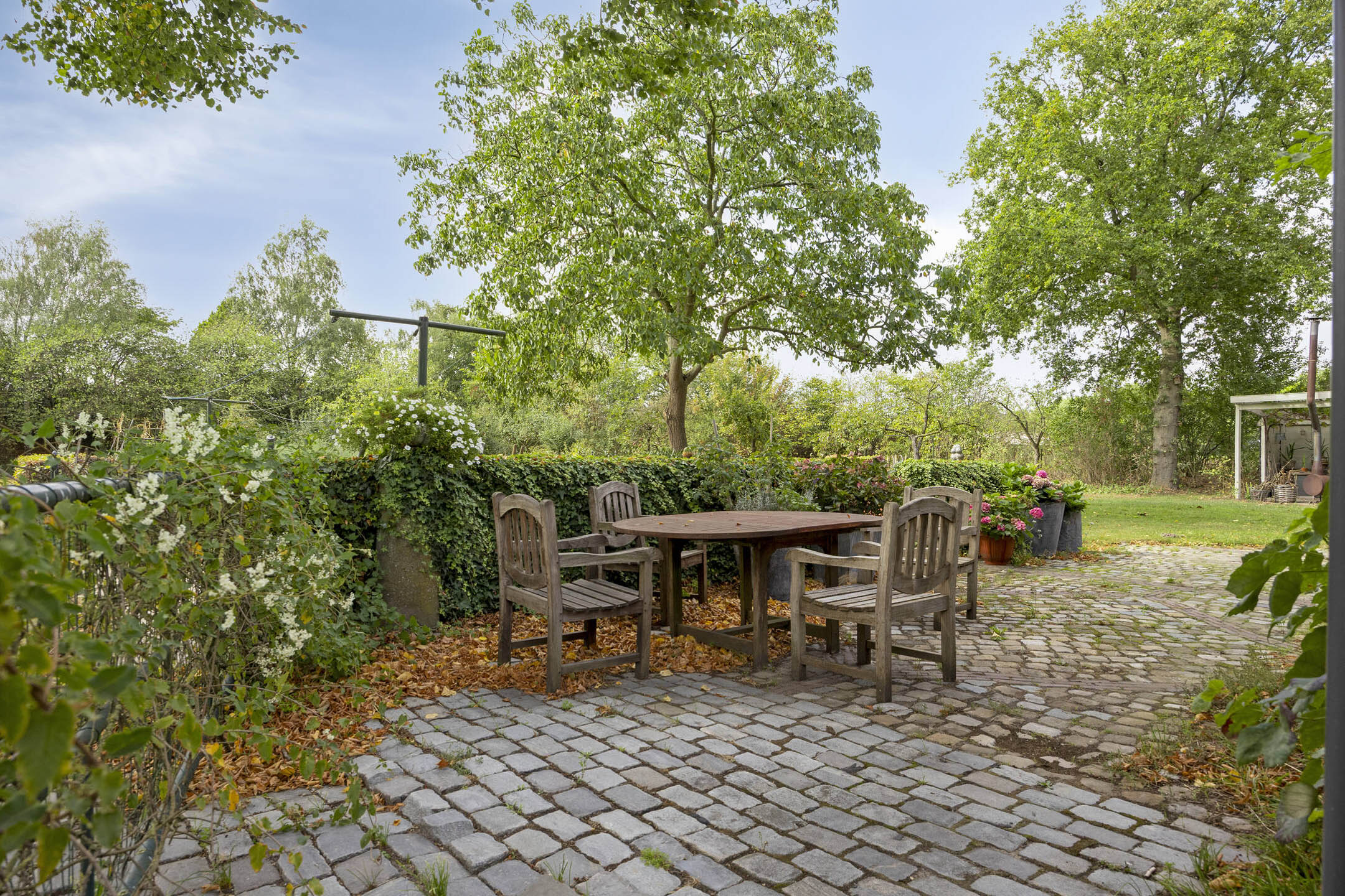 Landscaped grounds surrounding the property, including pasture, orchard, vegetable garden, wooden veranda, spacious driveway, terrace paved with traditional baked bricks, and a driveway laid with cobblestones.