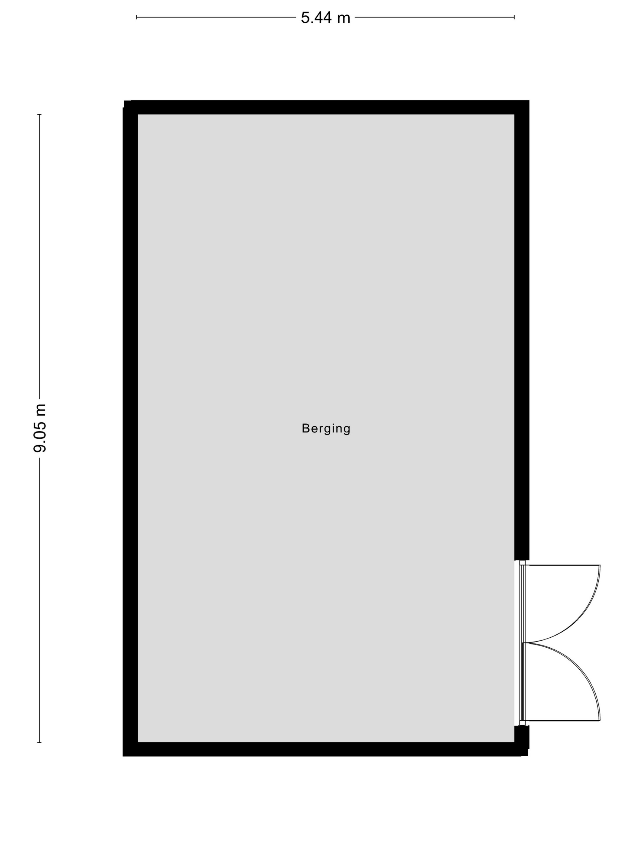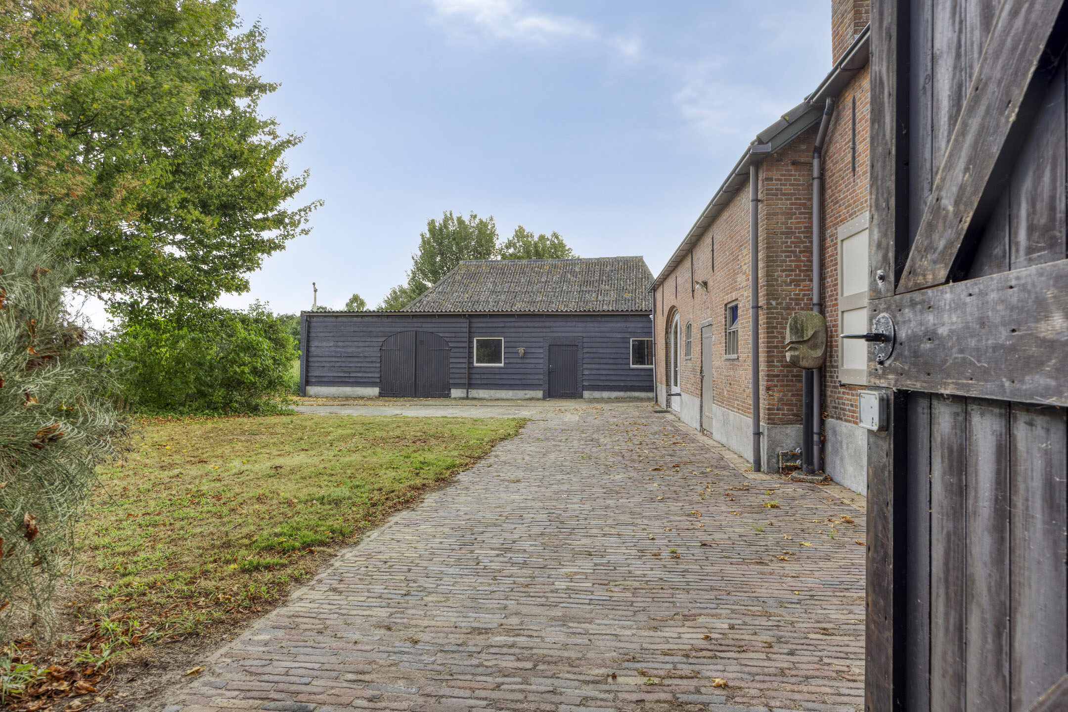 Barn I (approx. 49 m²), located at the rear right of the plot, featuring a brick base with timber cladding, double doors opening to the driveway/garden;