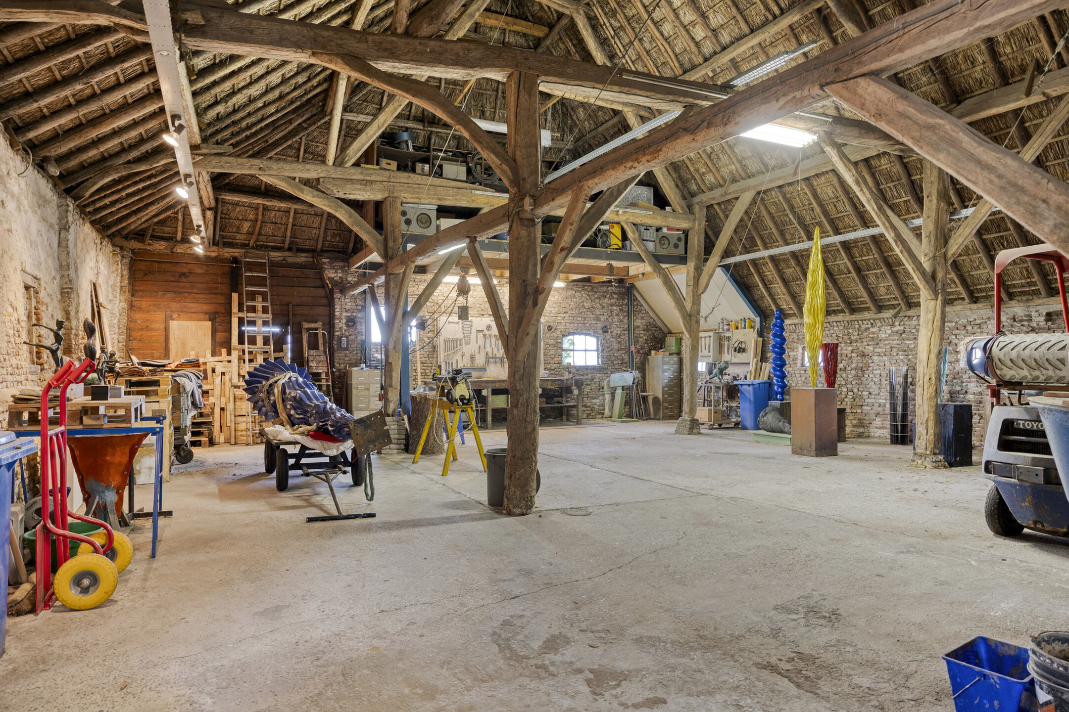 Outdoors, there are two spacious barns of approximately 302 m² and 49 m² respectively. The larger barn still showcases much of its original roof structure, with the full wooden framework visible—an impressively robust and characterful space, ideal for working but also perfect for hosting the occasional celebration.