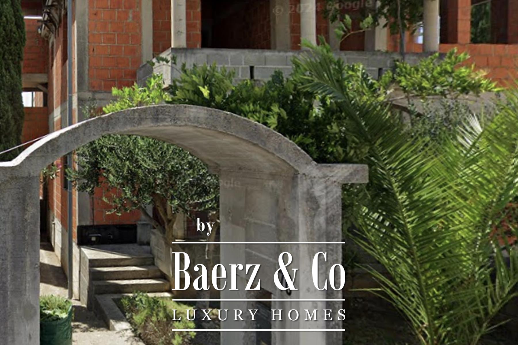 The basement offers a completed one-bedroom apartment of approximately 70 m², opening to the landscaped and fenced yard, shaded by eight mature cypress trees. The remaining 40 m² at this level provide potential for additional accommodation or storage, with a separate entrance for flexibility. Both the elevated ground floor and first floor, each measuring about 167 m², are designed for either two separate apartments per floor or expansive open-plan residences, each enjoying vistas of the sea from the very first level. The second floor presents a 48 m² studio with a private terrace and panoramic outlook.