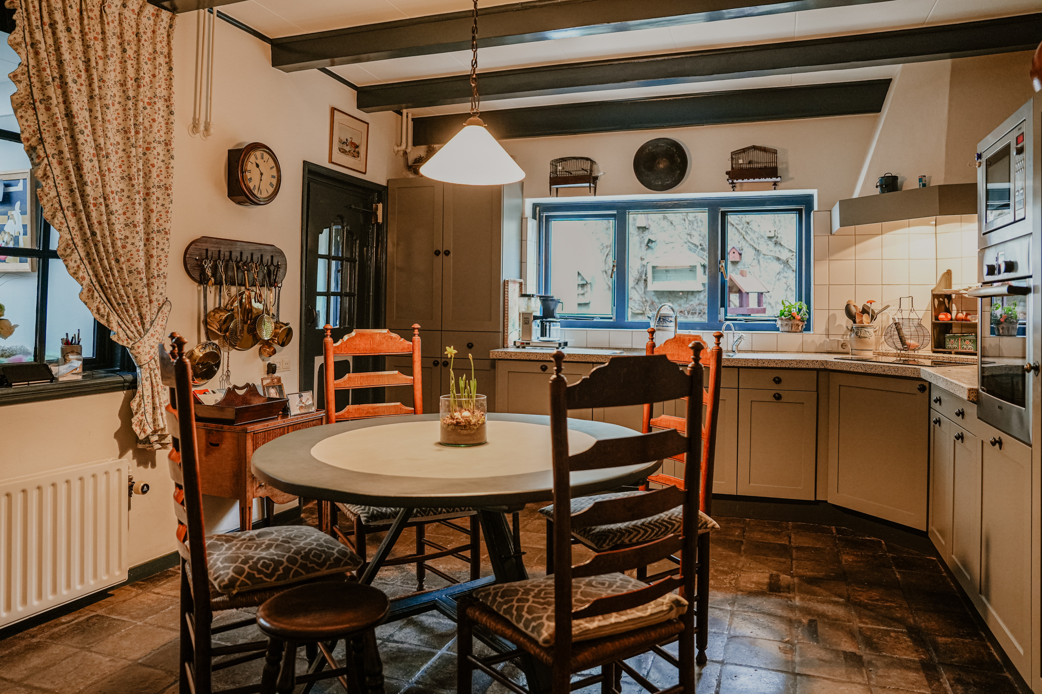 Adjoining the hallway are the cellar, utility room, and dining kitchen. A glass panel in the cellar floor reveals the historic water well below. The utility room occupies the former outdoor space of what was once the western house when the property consisted of two separate homes. The hallway retains the original 18th-century pump with a stone basin and brass taps. The dining kitchen is furnished with a classic kitchen unit featuring built-in appliances and a terrazzo countertop. From the kitchen, there is a pleasant view of the garden.