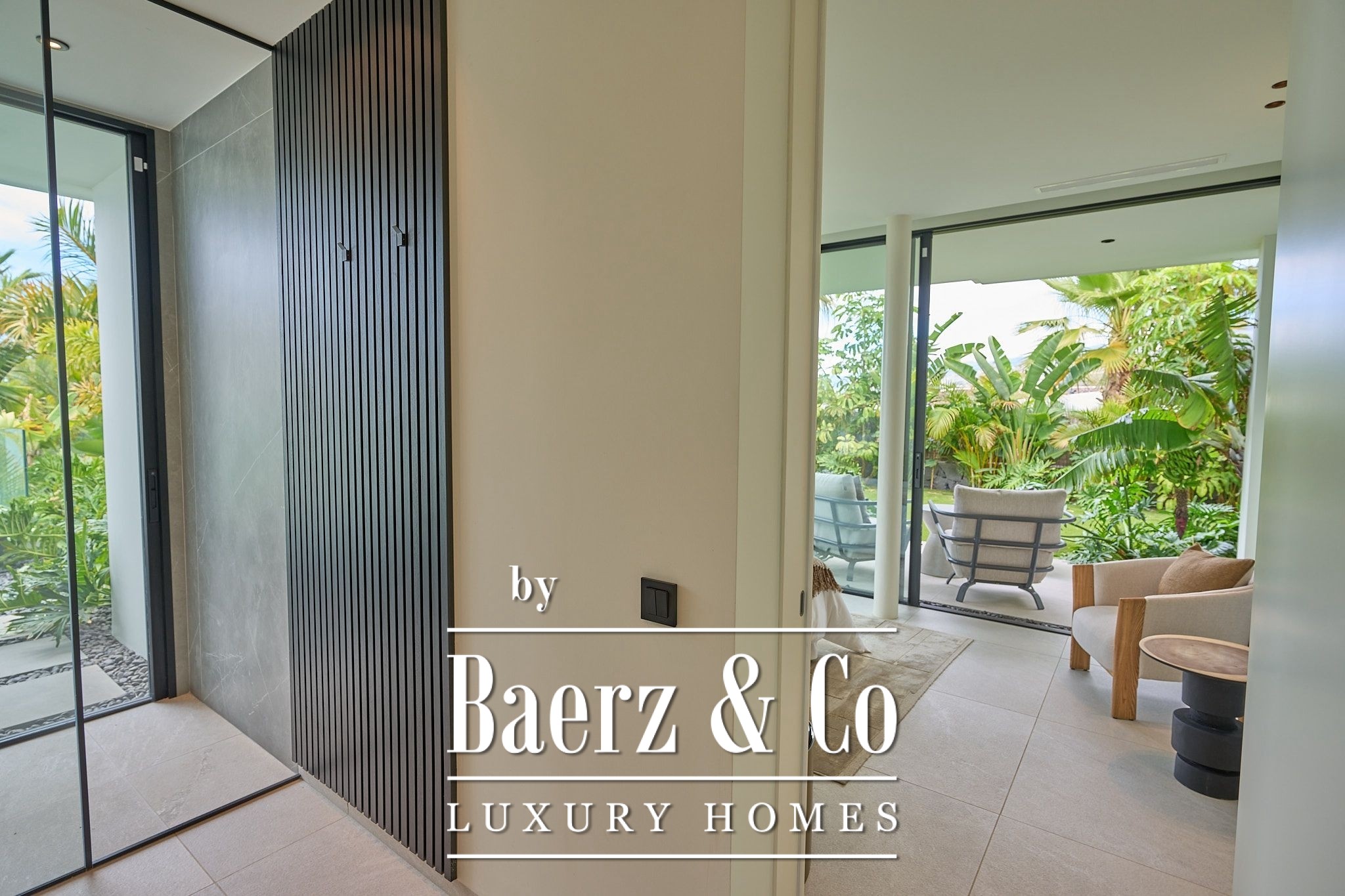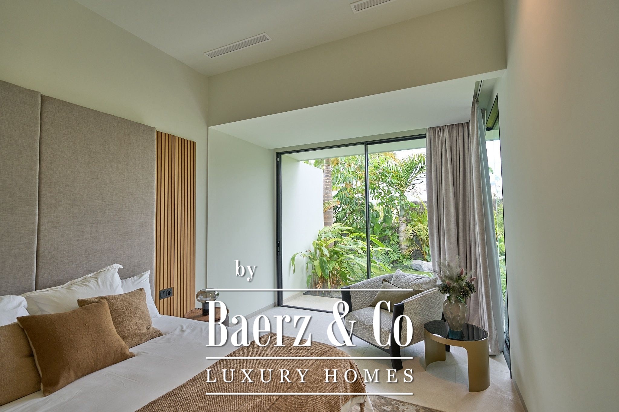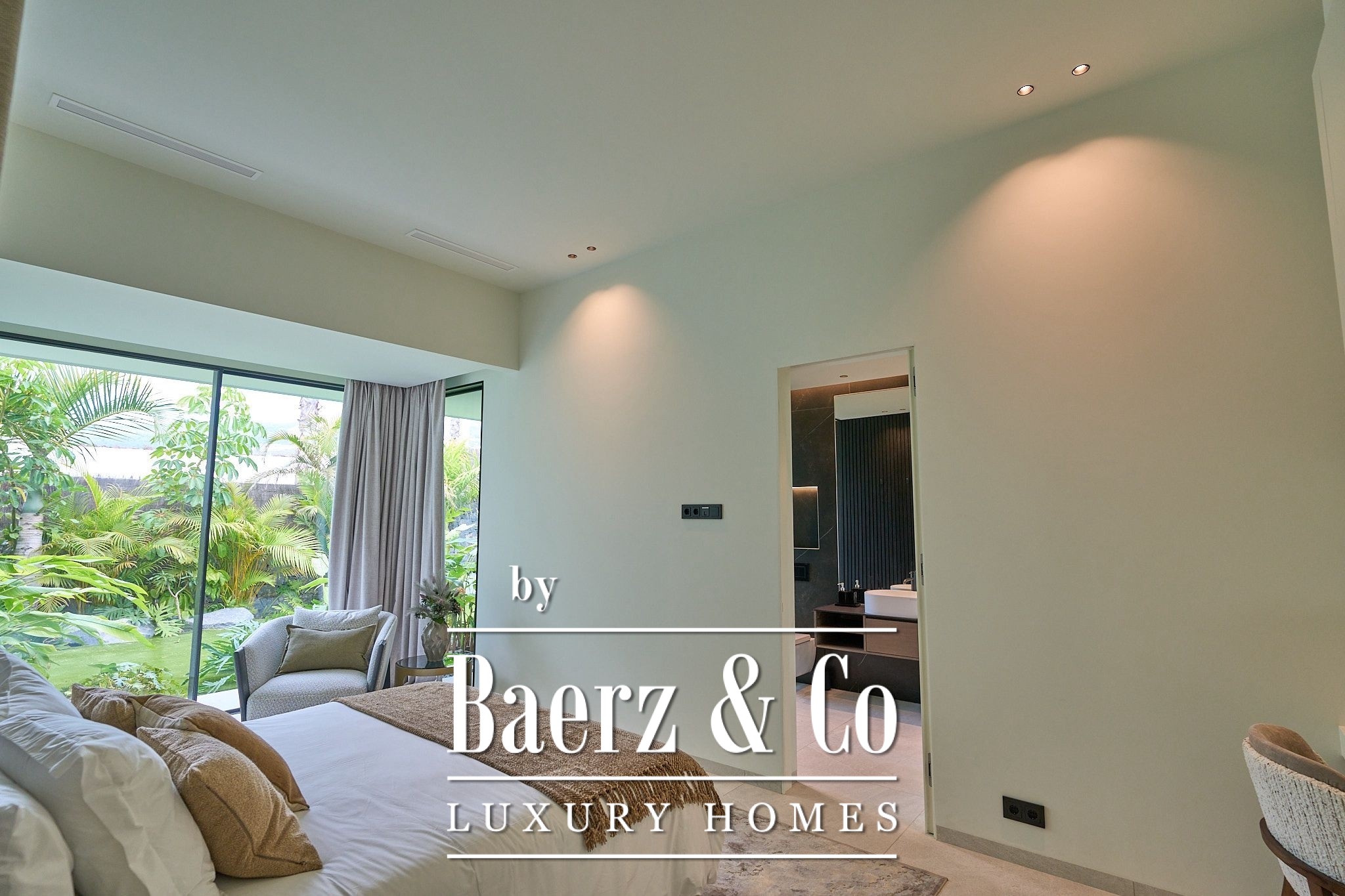De villa beschikt over vier elegante slaapkamers met eigen badkamer, elk met inbouwkasten en directe toegang tot de tropische tuin, wat zorgt voor een intieme en ontspannen sfeer. Op de bovenverdieping bevindt zich een ruime woon- en eetkamer die uitkomt op een volledig uitgeruste moderne keuken, inclusief een wijnkelder – perfect voor wijnliefhebbers.