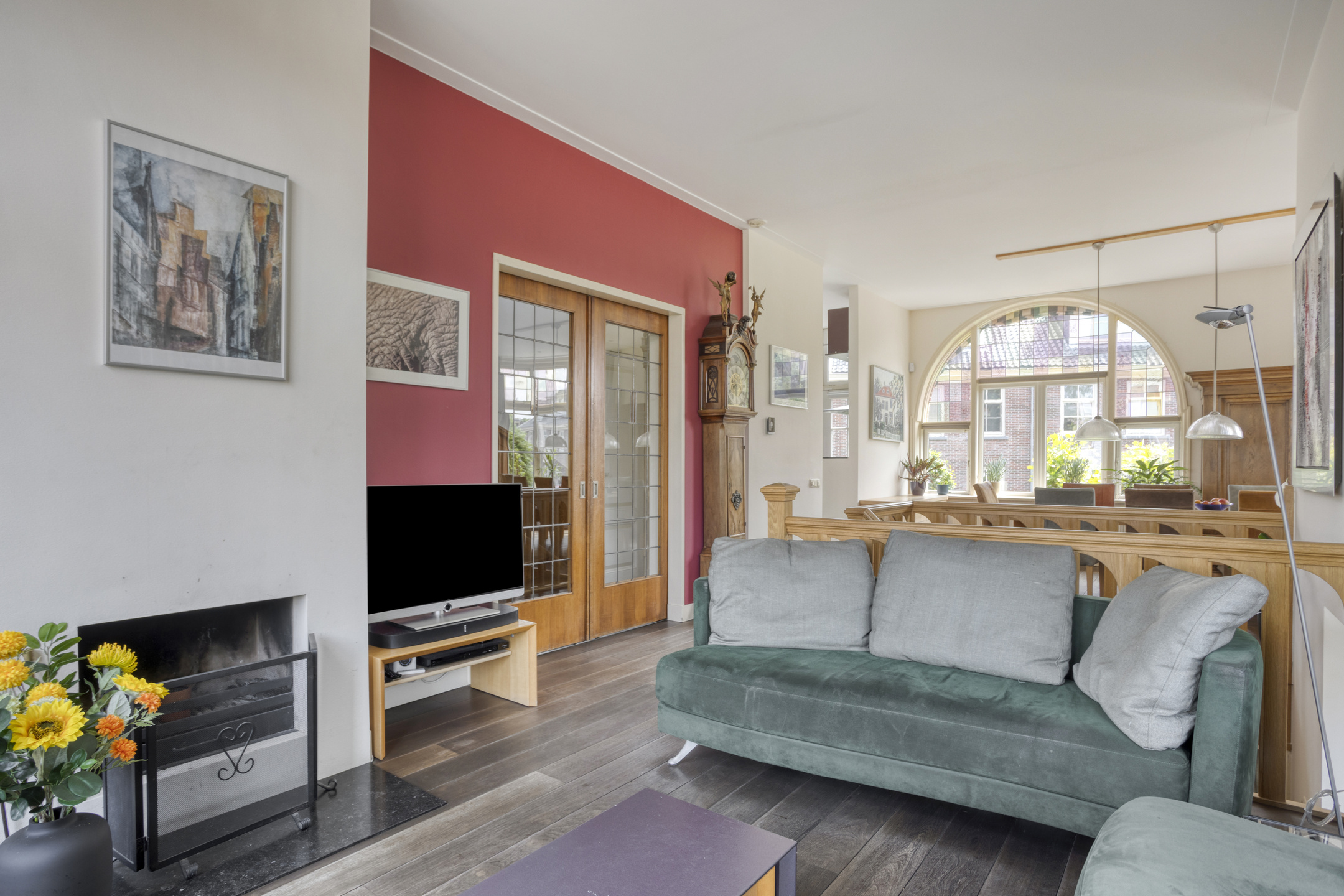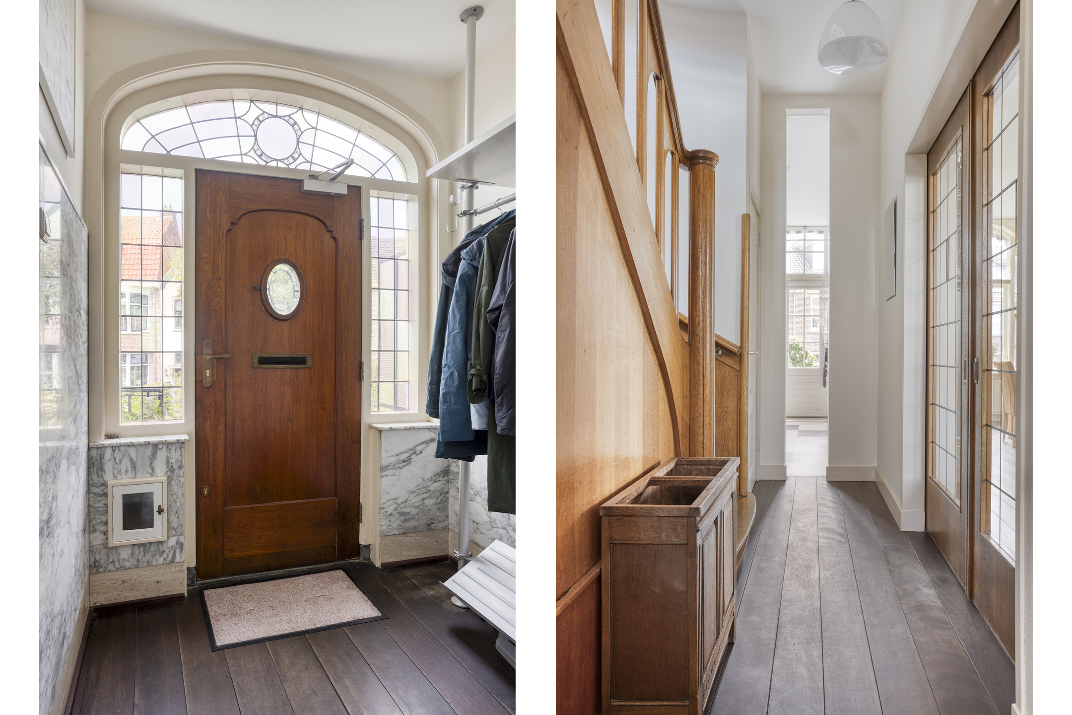 Via de trap met originele balustrade bereikt u de entree. U komt binnen in het tochtportaal met originele wandbekleding, die direct de historische sfeer van het huis voelbaar maakt. De hal biedt toegang tot een net toilet met fontein en de woonvertrekken. De woonkamer is uitzonderlijk royaal en beschikt over een prachtige Purpleheart houten vloer, strak gestucte wanden en plafonds voorzien van inbouwspotjes. De karakteristieke erker, open haard, hoge plafonds en indrukwekkende glas-in-loodramen maken deze ruimte helemaal af.