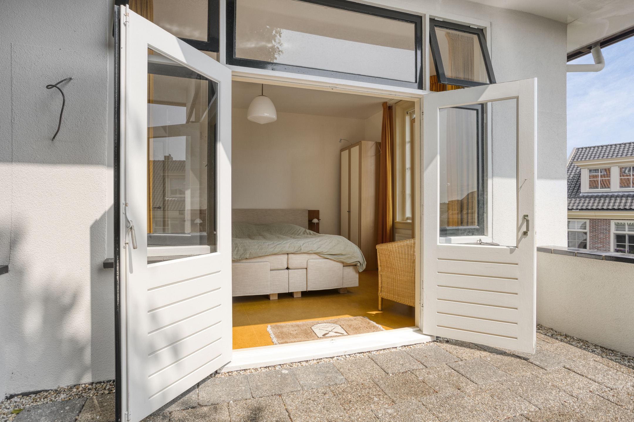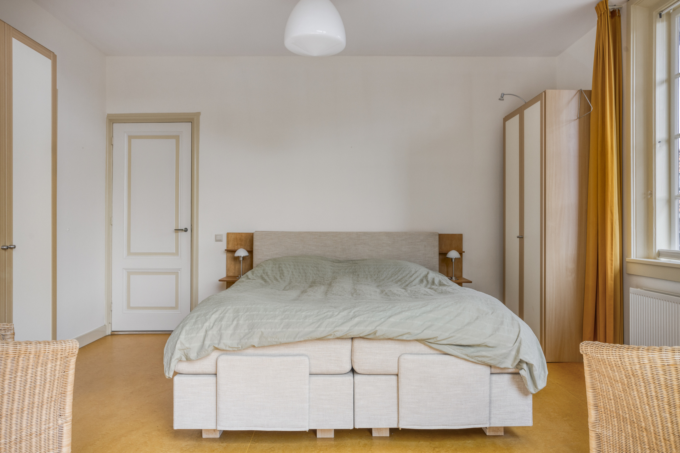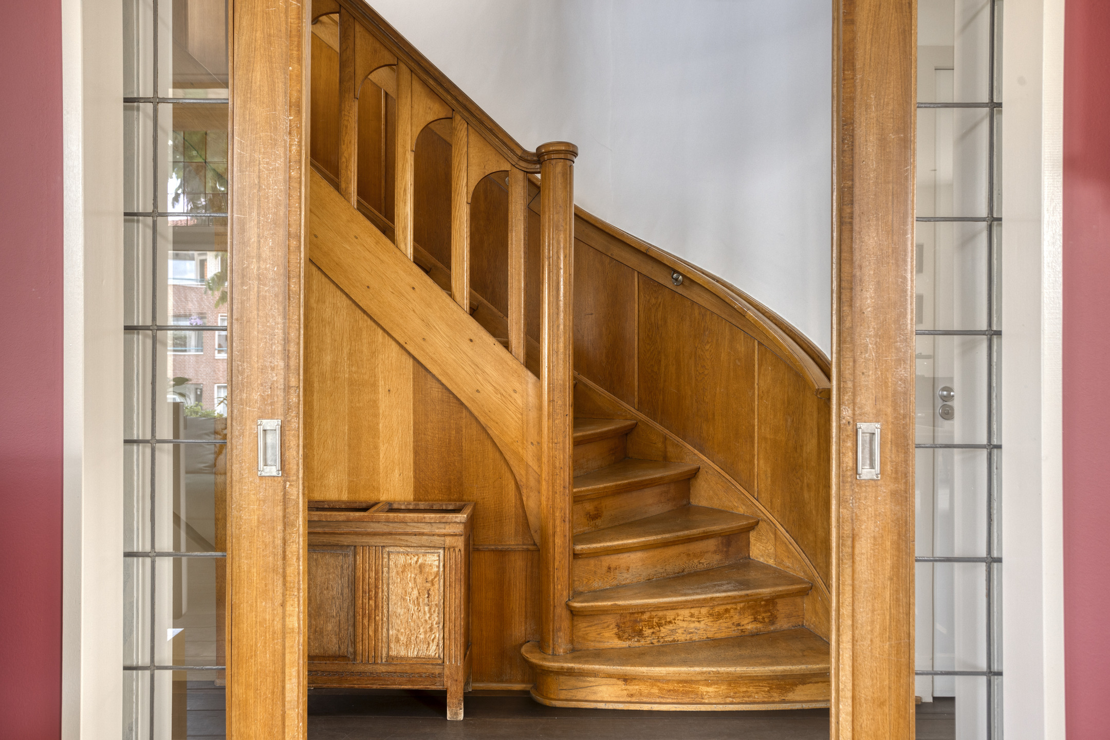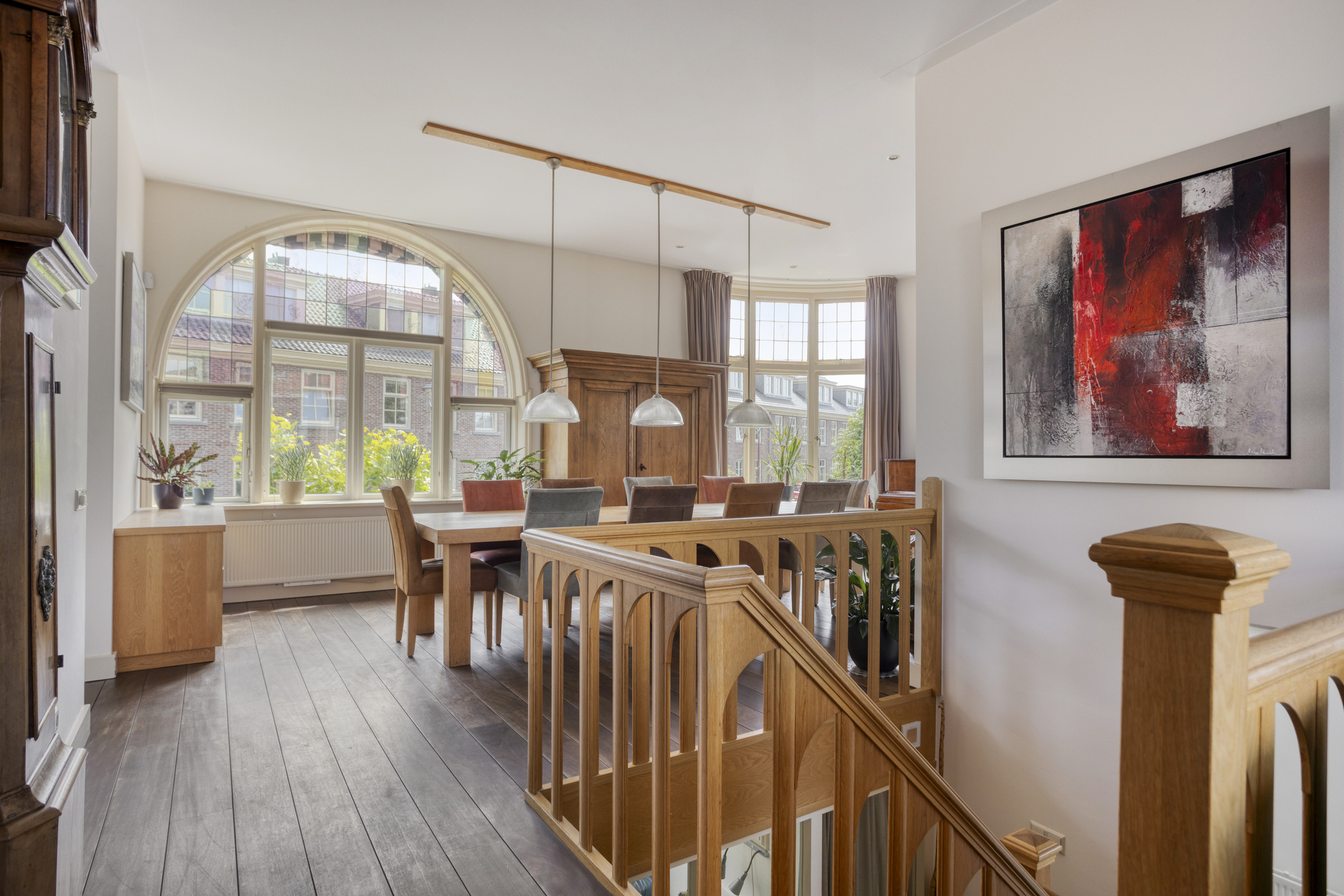 Via de prachtige monumentale trap bereikt u de eerste verdieping, ook wel de ‘gele verdieping’ genoemd vanwege de gele details. Hier vindt u drie slaapkamers, waarvan twee ruim bemeten en één perfect als kinderkamer of inloopkast. De grote slaapkamer aan de achterzijde beschikt over openslaande deuren naar het dakterras op het zuidwesten, een heerlijke plek voor de middag- en avondzon. De badkamer is voorzien van een toilet, elektrische vloerverwarming, inloopdouche en wastafel en is ook vanuit de slaapkamer aan de achterzijde te bereiken. Ook op deze verdieping zorgen hoge plafonds en grote raampartijen voor een prachtig lichtinval.