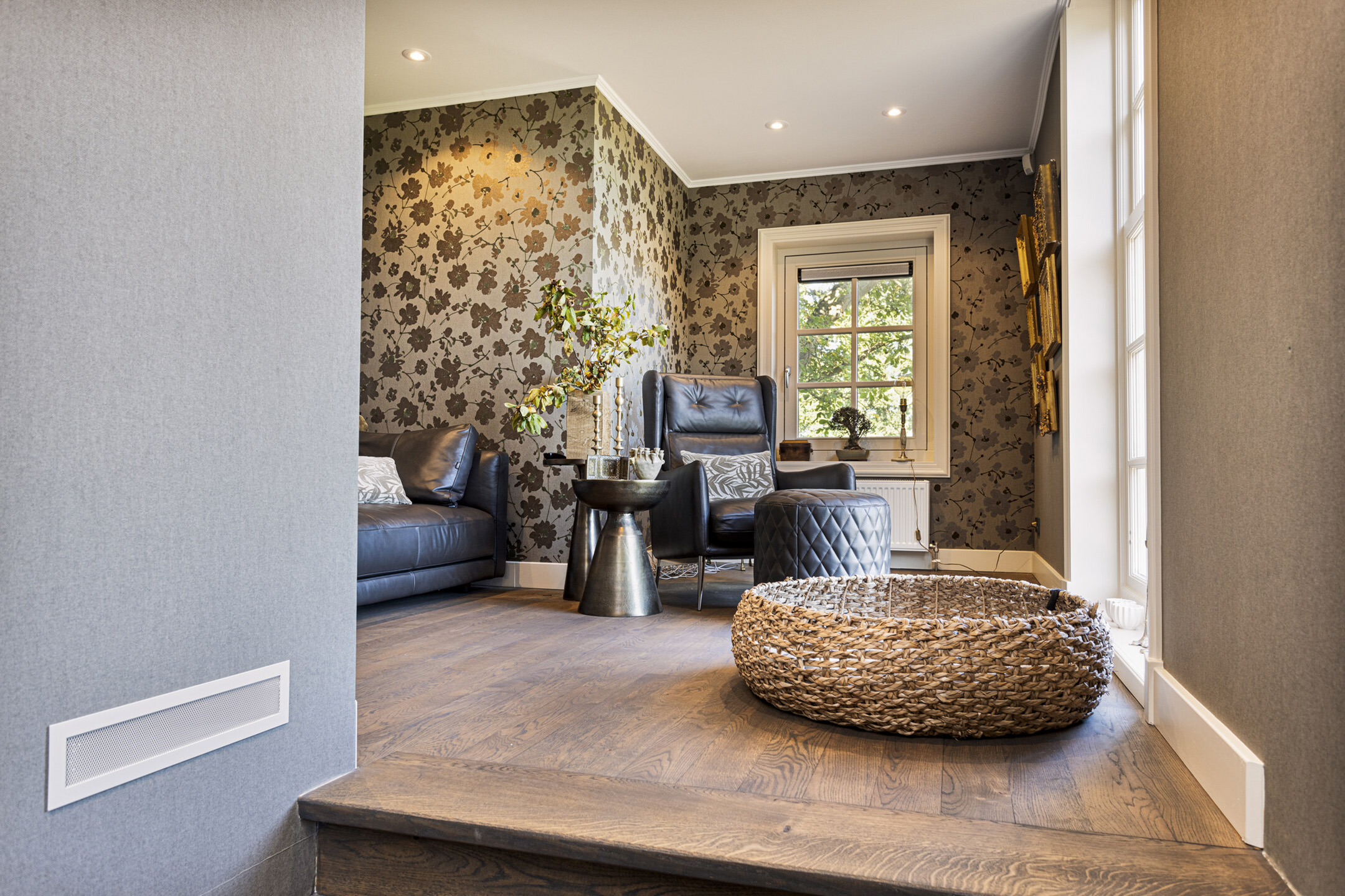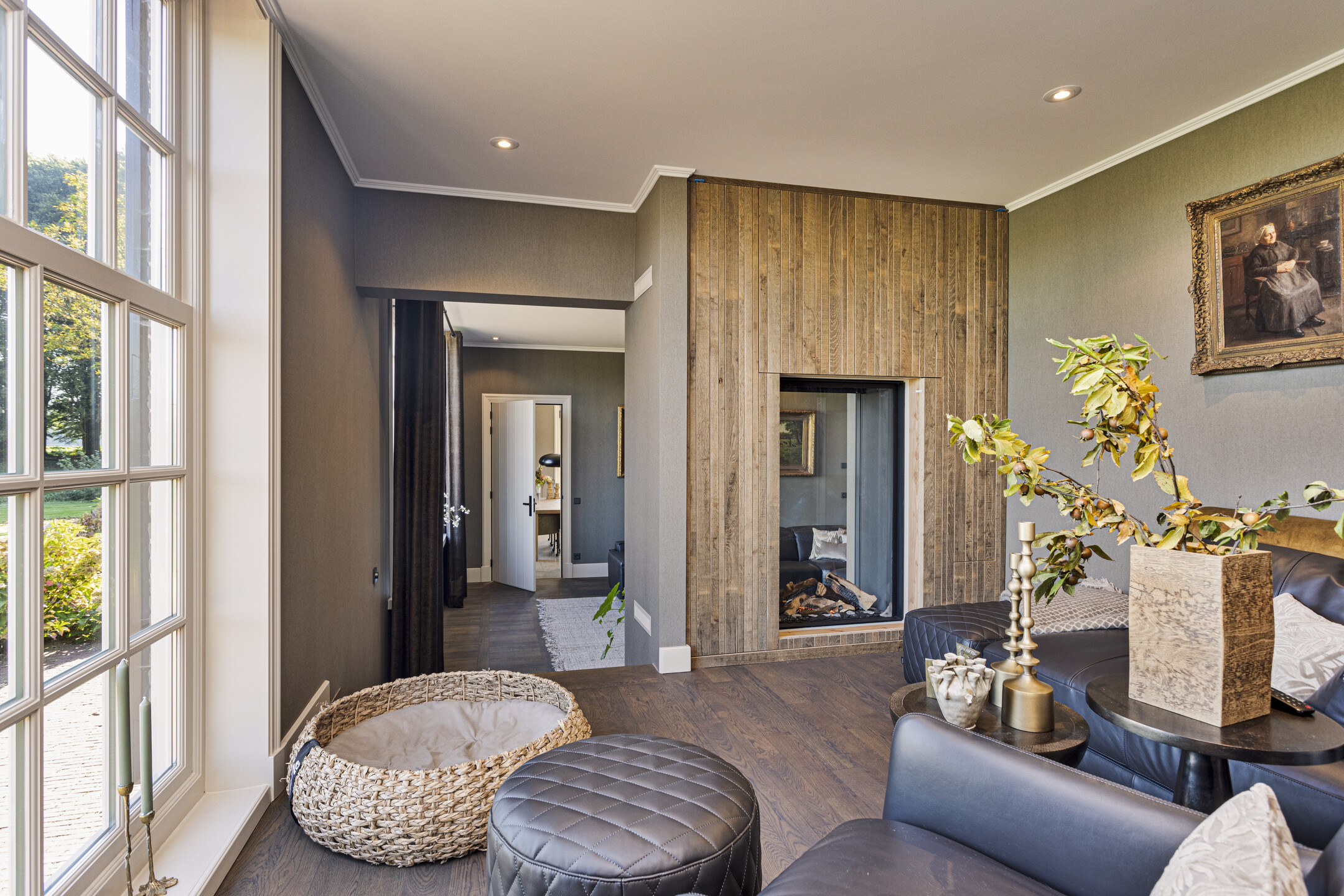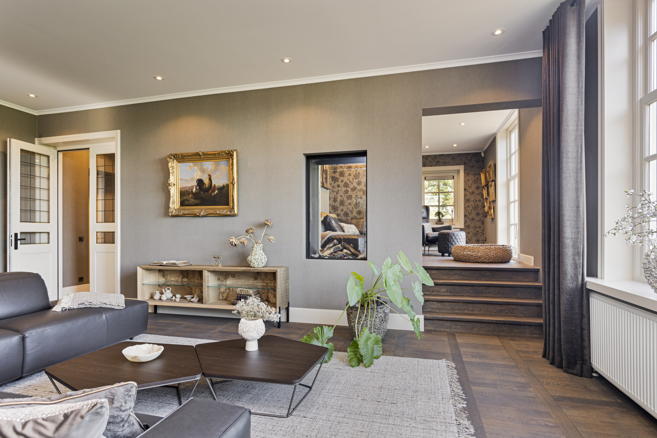 De living heeft een schitterende vloer; het is een oude kasteelvloer uit het Franse chateau van de vorige eigenaars. De huidige bewoners hebben hem mooi laten opschuren en gecoat met een verfijnde grijze vloerolie, waardoor ze naadloos in het eigentijdse interieur passen. De muziekkamer is een ruimte en-suite, gescheiden van de living middels schuifdeuren, en heeft nu de rol van een ouderwets kunstkabinet, maar dan wél eentje waarvan het binnenklimaat geheel naar wens aan te passen is. Heeft u nu geen Steinway of kunstcollectie om hier tentoon te stellen, dan is dit een heerlijke werkkamer, bibliotheek, bioscoop of eetkamer. Aansluitend links, met zicht op de tuin en het zijterras, de opkamer, die de gashaard deelt met de living. Een heerlijk hoekje om weg te kruipen met een goed boek.