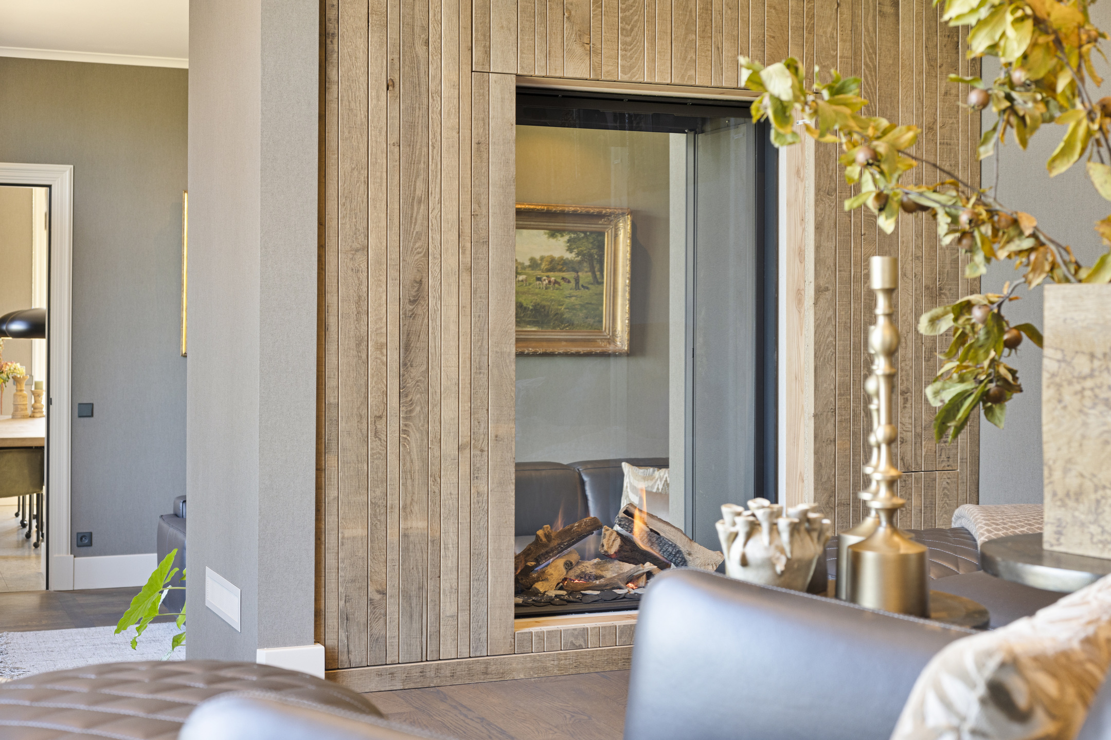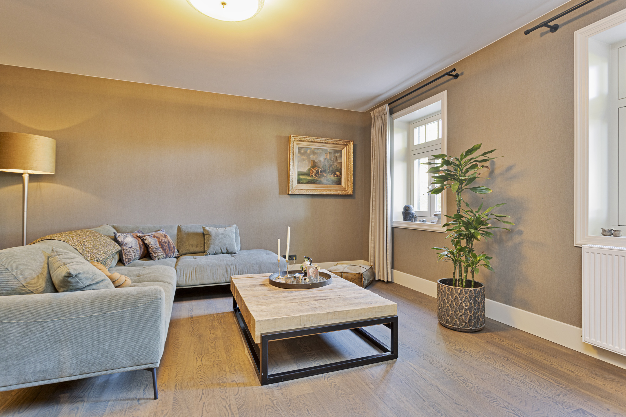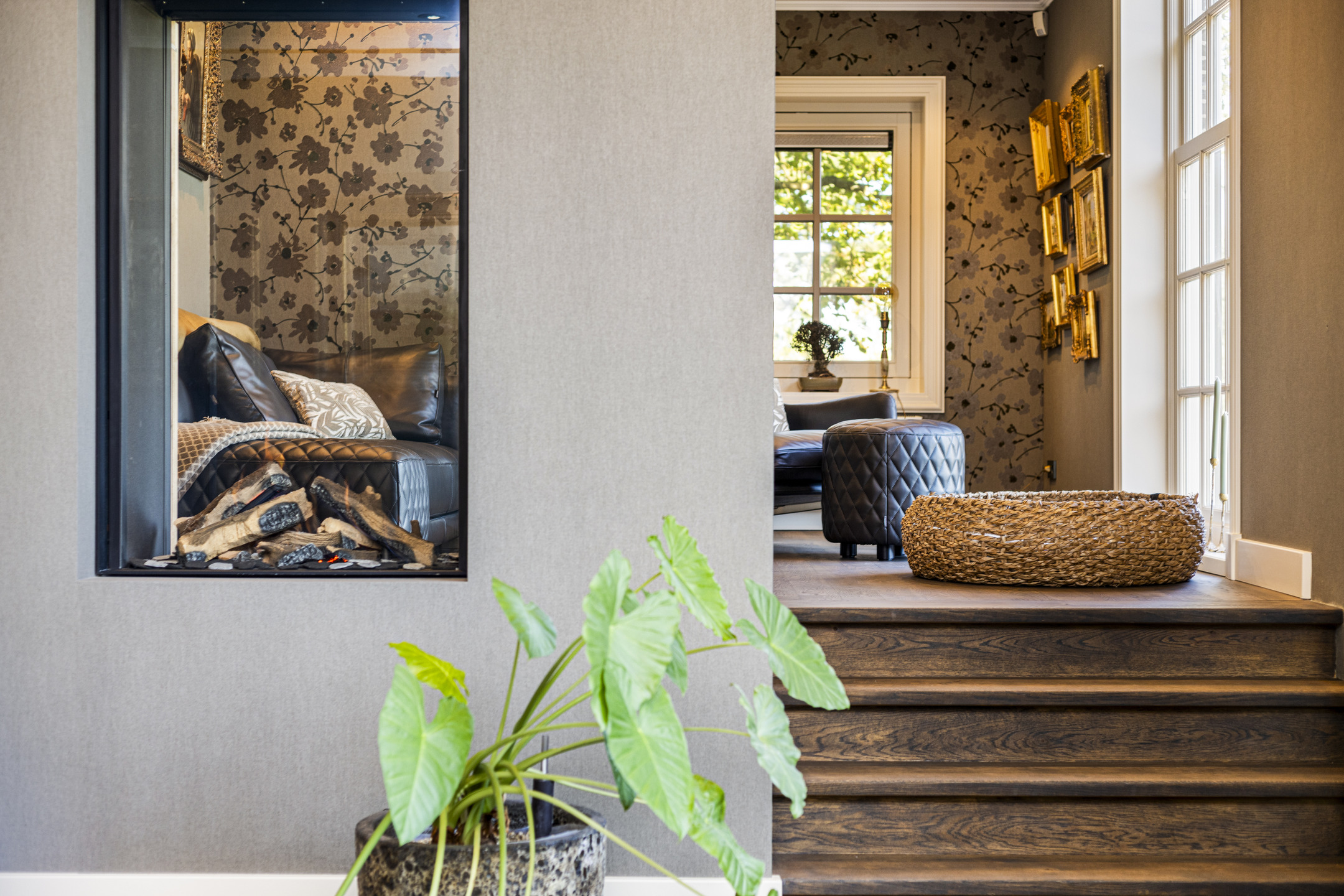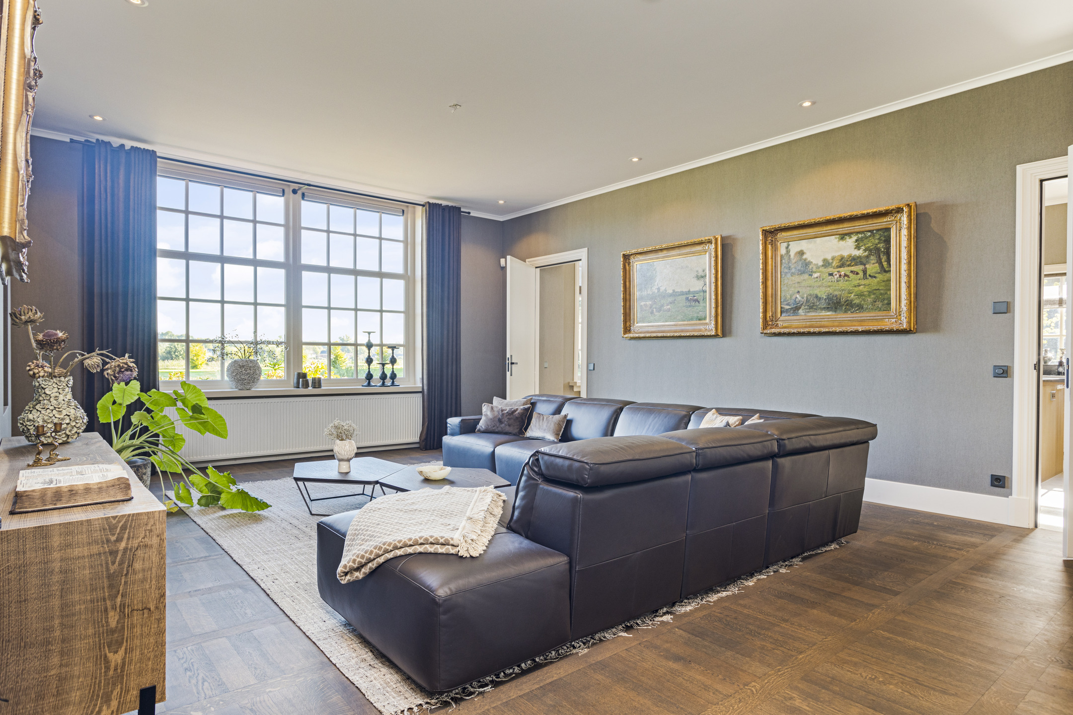 De living heeft een schitterende vloer; het is een oude kasteelvloer uit het Franse chateau van de vorige eigenaars. De huidige bewoners hebben hem mooi laten opschuren en gecoat met een verfijnde grijze vloerolie, waardoor ze naadloos in het eigentijdse interieur passen. De muziekkamer is een ruimte en-suite, gescheiden van de living middels schuifdeuren, en heeft nu de rol van een ouderwets kunstkabinet, maar dan wél eentje waarvan het binnenklimaat geheel naar wens aan te passen is. Heeft u nu geen Steinway of kunstcollectie om hier tentoon te stellen, dan is dit een heerlijke werkkamer, bibliotheek, bioscoop of eetkamer. Aansluitend links, met zicht op de tuin en het zijterras, de opkamer, die de gashaard deelt met de living. Een heerlijk hoekje om weg te kruipen met een goed boek.