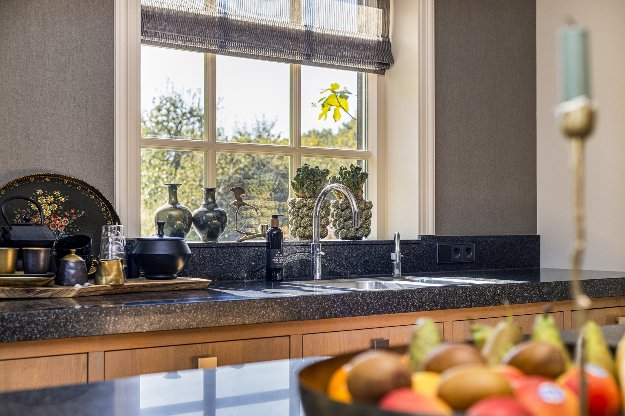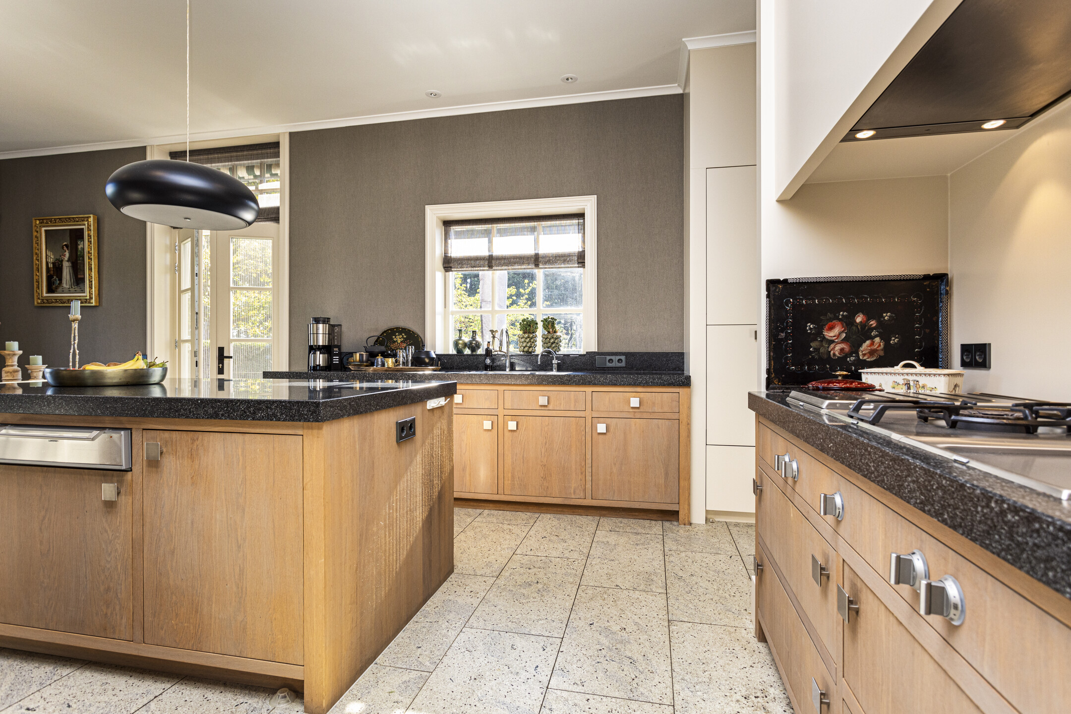De keuken is een echt uit de kunst: geheel op maat gemaakt en samengesteld door een keukenstudio. De grote keuken is voorzien van zware eikenhouten fronten en granieten werkbladen. Alle inbouwapparatuur is van Gaggenau, wat garant staat voor optimaal design en functie. Er is een apparatenwand met dubbele ijskasten en een stoom- en een heteluchtoven. Aan de andere kant, met uitzicht op het zonnige zijterras een groot werkblad met dubbele spoelbak en een vijf-in-één kokendwaterkraan. Op de kop, in de eigentijdse koof, het fornuis met wokbrander, plancha en vier grote gaspitten.