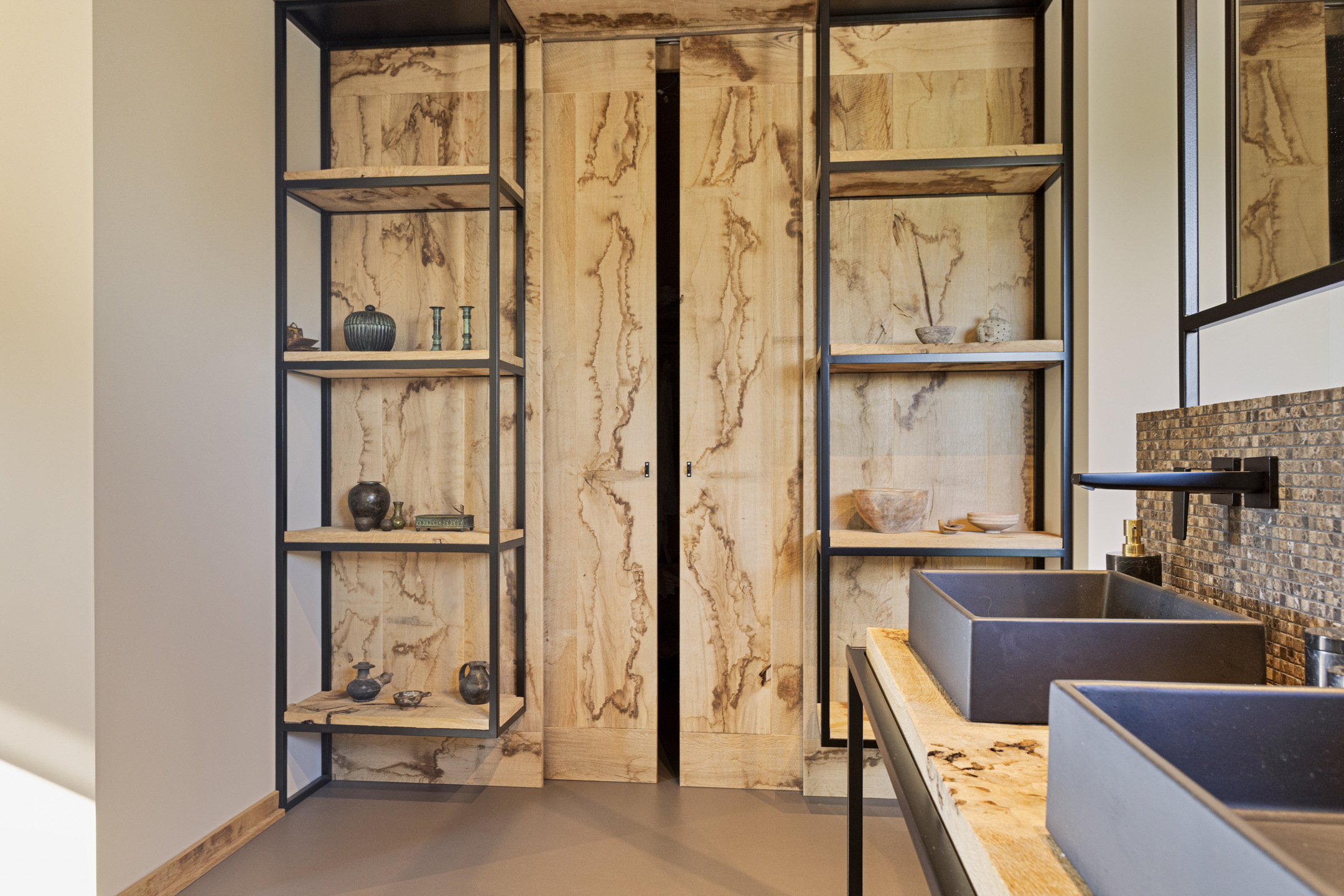 De walk-in closet heeft gevlamde houten schuifdeuren en de slaapkamer is licht door de grote raampartijen. Door de strakke vormgeving heeft deze ruimte een bijzonder serene sfeer.