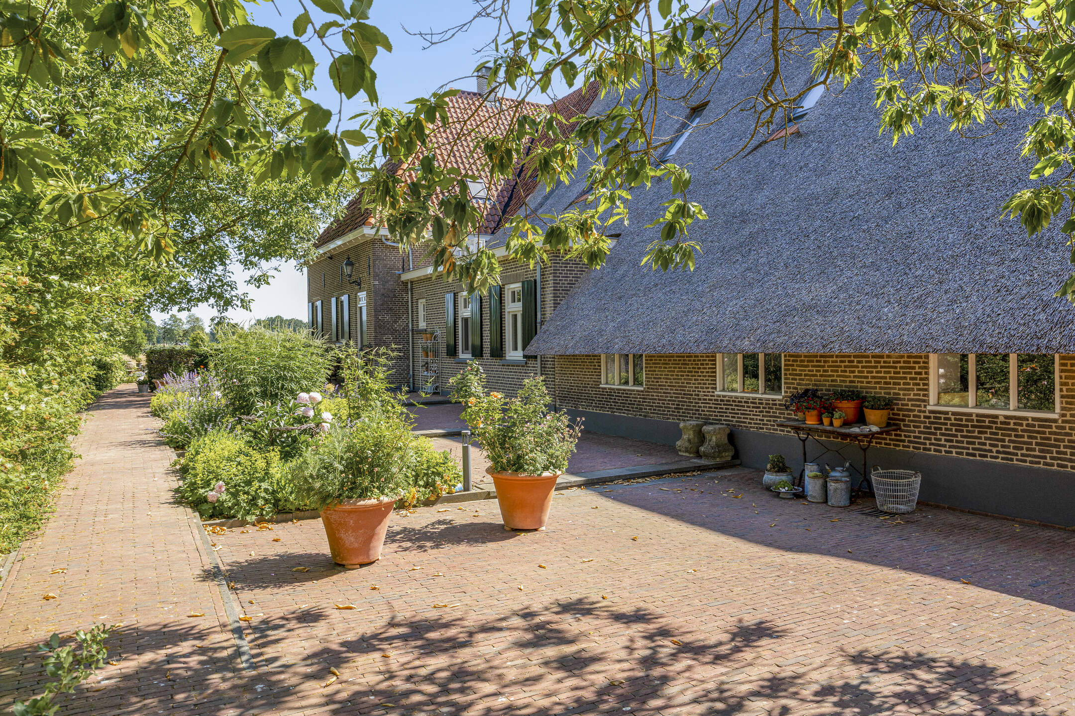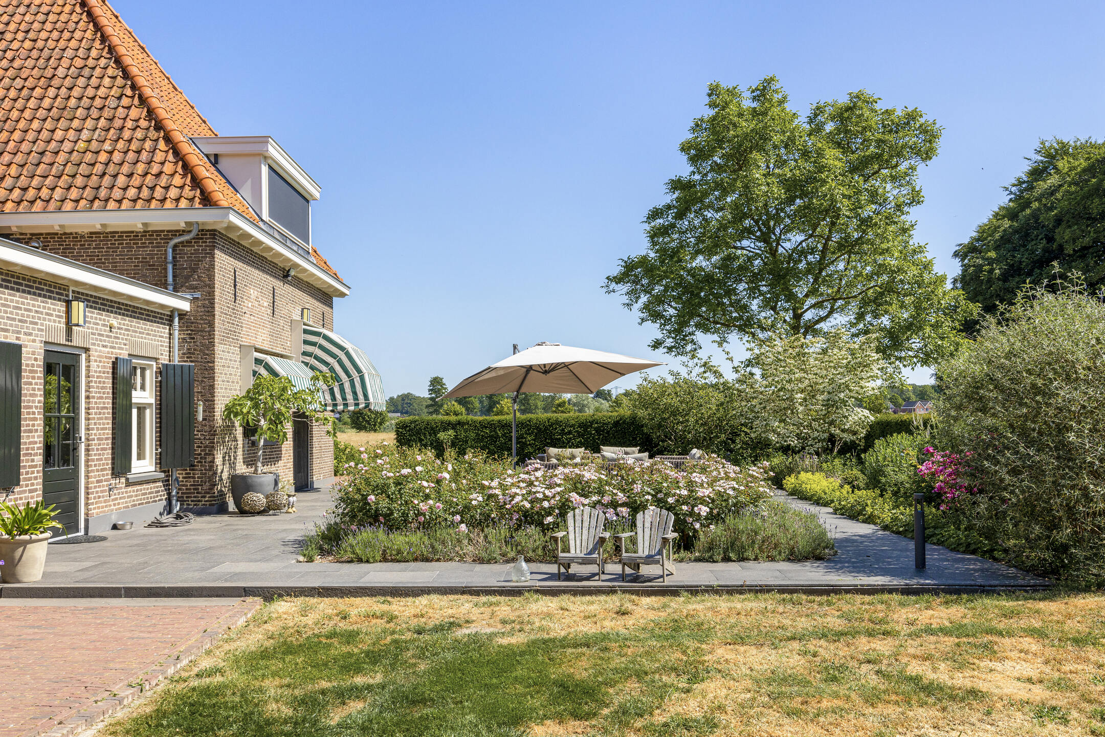 Voor de keuken ligt het heerlijke zonneterras, met rozenperk en taxushaag. Perfect voor zonnige lunches en diners, of gewoon lekker de hele dag luieren in de loungeset.