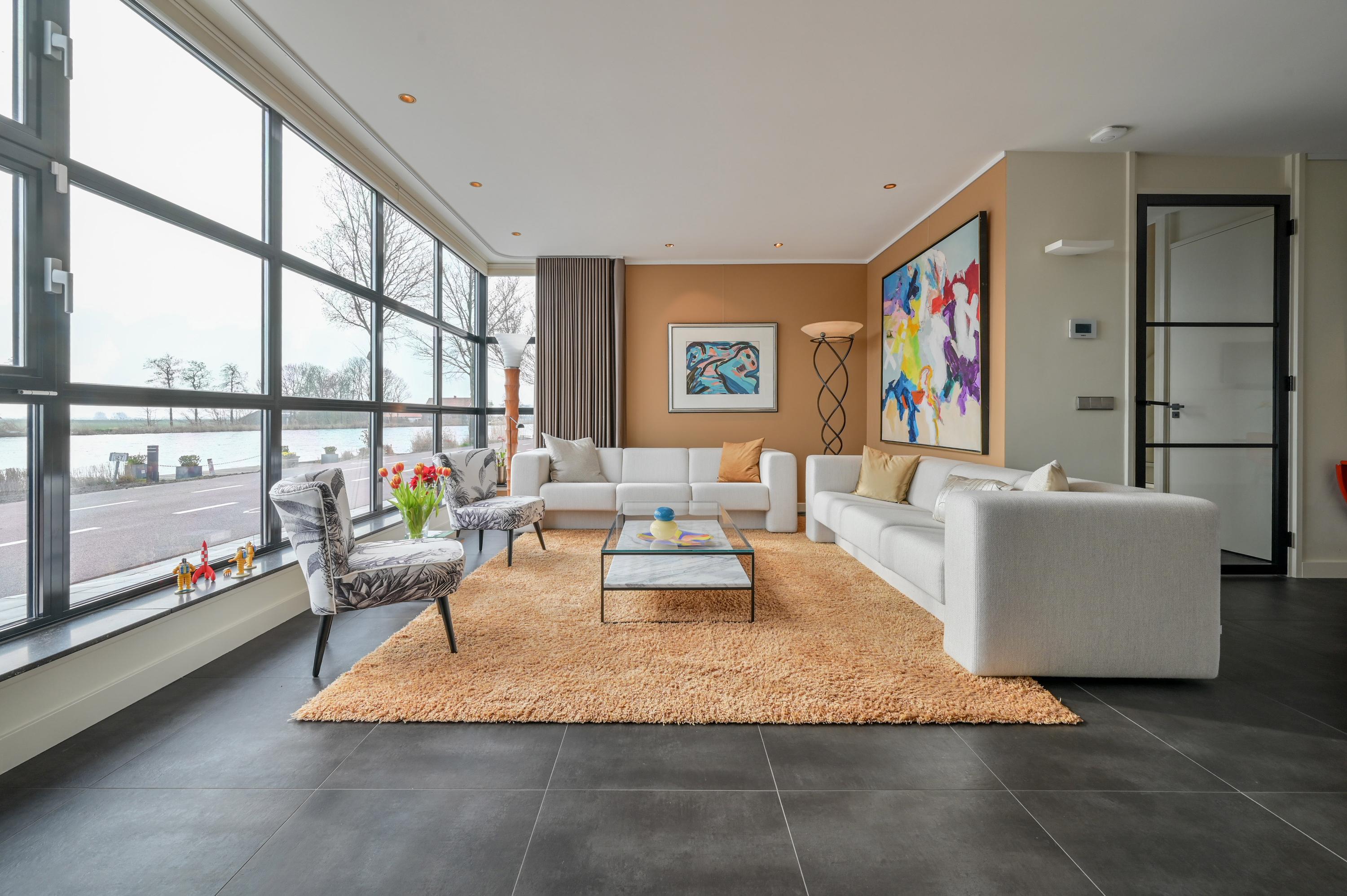 Via de oprit bereikt u de voordeur en de ruime hal, voorzien van garderobekast, toilet en trap naar de verdieping. De woonkamer ligt aan de voorzijde van de woning en biedt een adembenemend uitzicht over de Amstel. Grote raampartijen laten het licht binnenstromen, terwijl het gemotoriseerde gordijn via een app te bedienen is. Tevens hangen hier ook Luxaflex Silhouttes (gemotoriseerd, met stand geheugen). De stijlvolle zwarte plavuizenvloer met vloerverwarming, ingebouwde dimbare spots van Modular en de grote designkasten maken het geheel af.