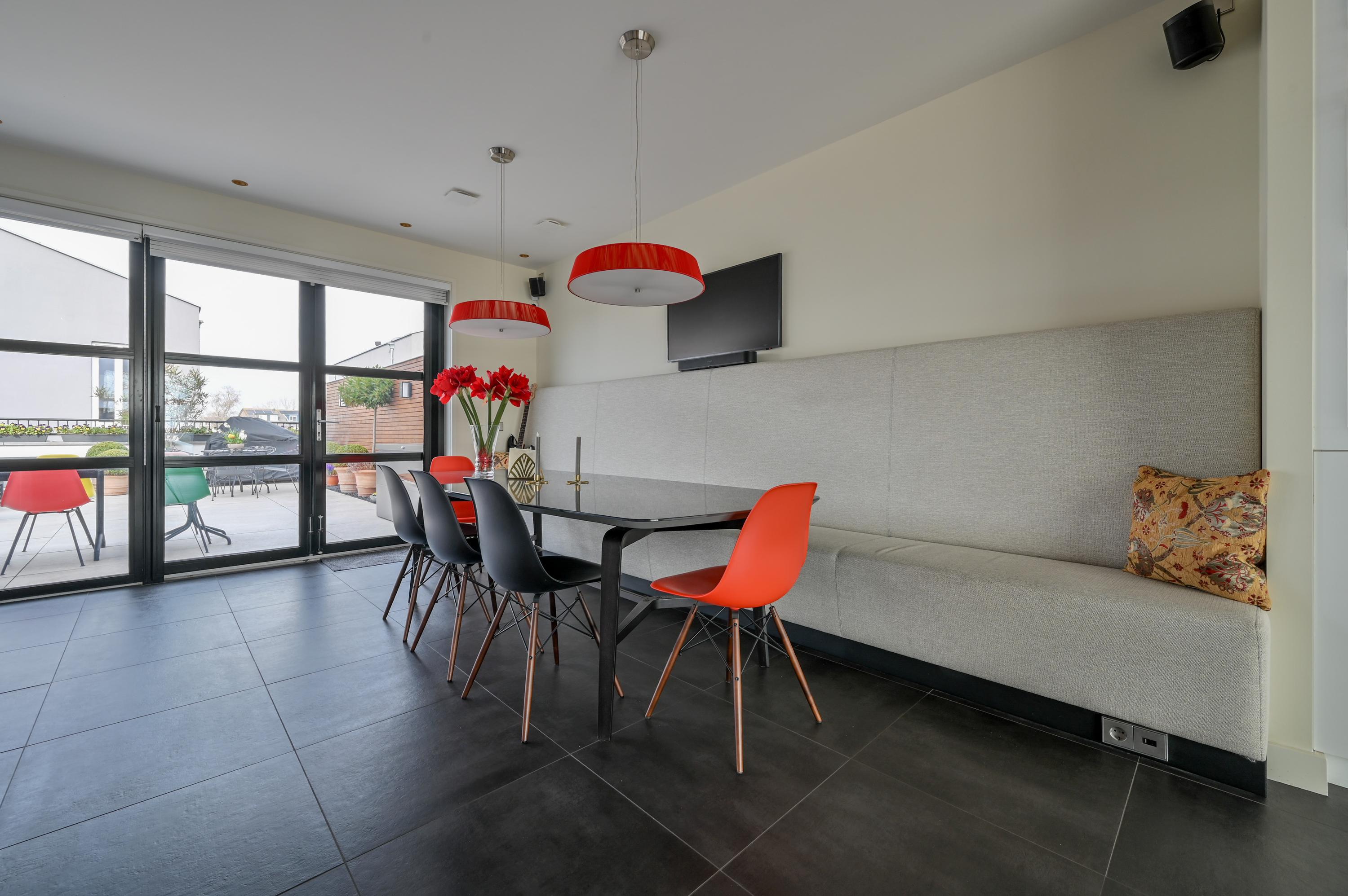Aan de achterzijde bevindt zich de royale, luxe open keuken, ontworpen voor koken én leven. Het spoeleiland, de Qooker, vaatwasser, combi-ovens, inductiekookplaat met afzuigkap, grote LG-koelkast met vriezer en ijsblokjesmachine, Liebherr-wijnklimaatkast en uitgebreide kastruimte maken deze keuken tot een droom voor elke liefhebber van koken en gastvrijheid. Een vaste bank bij de grote eettafel zorgt voor een gezellige zithoek, terwijl dubbele openslaande deuren toegang geven tot de royale terrastuin, waar licht, ruimte en rust samenkomen.