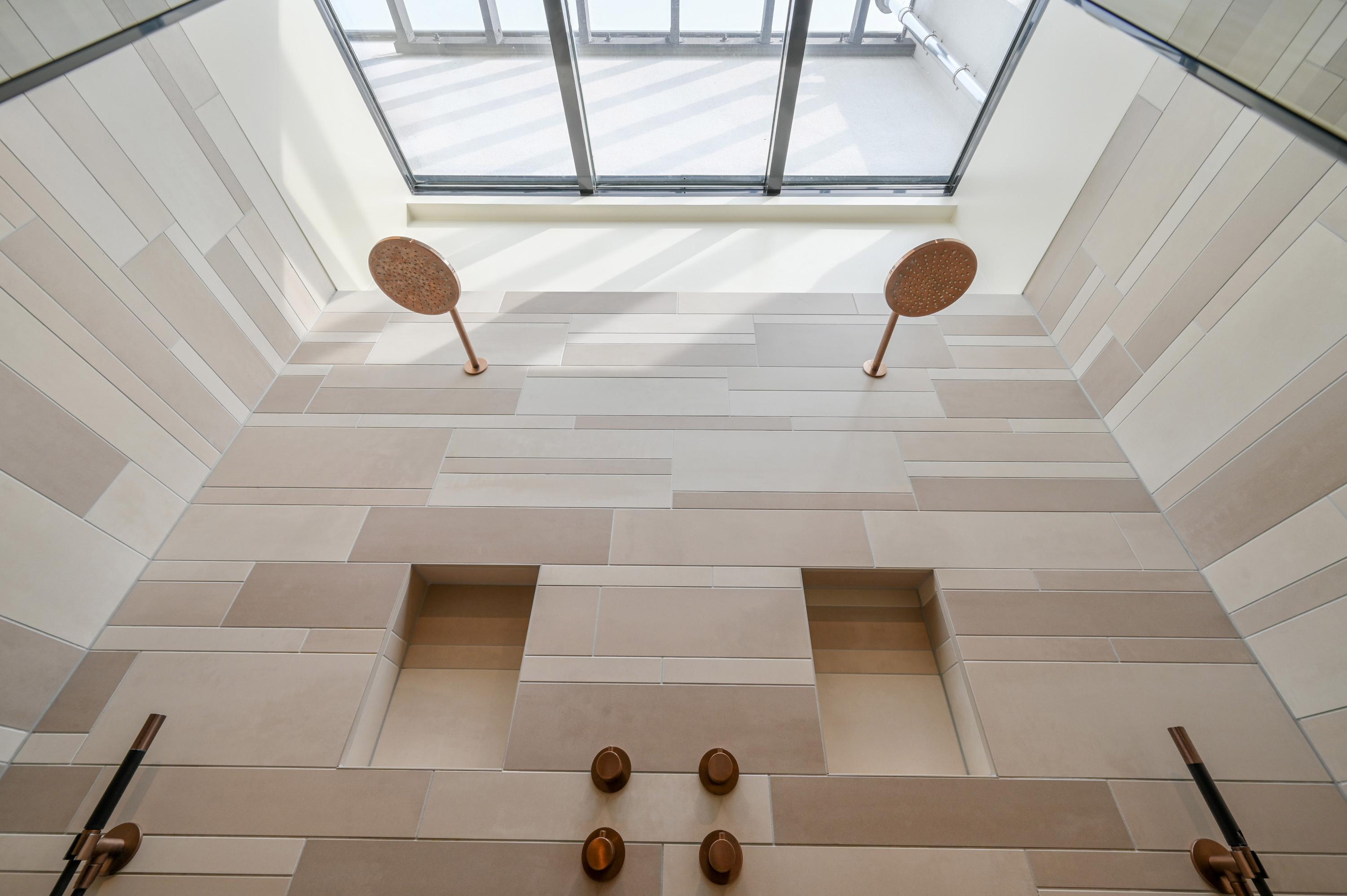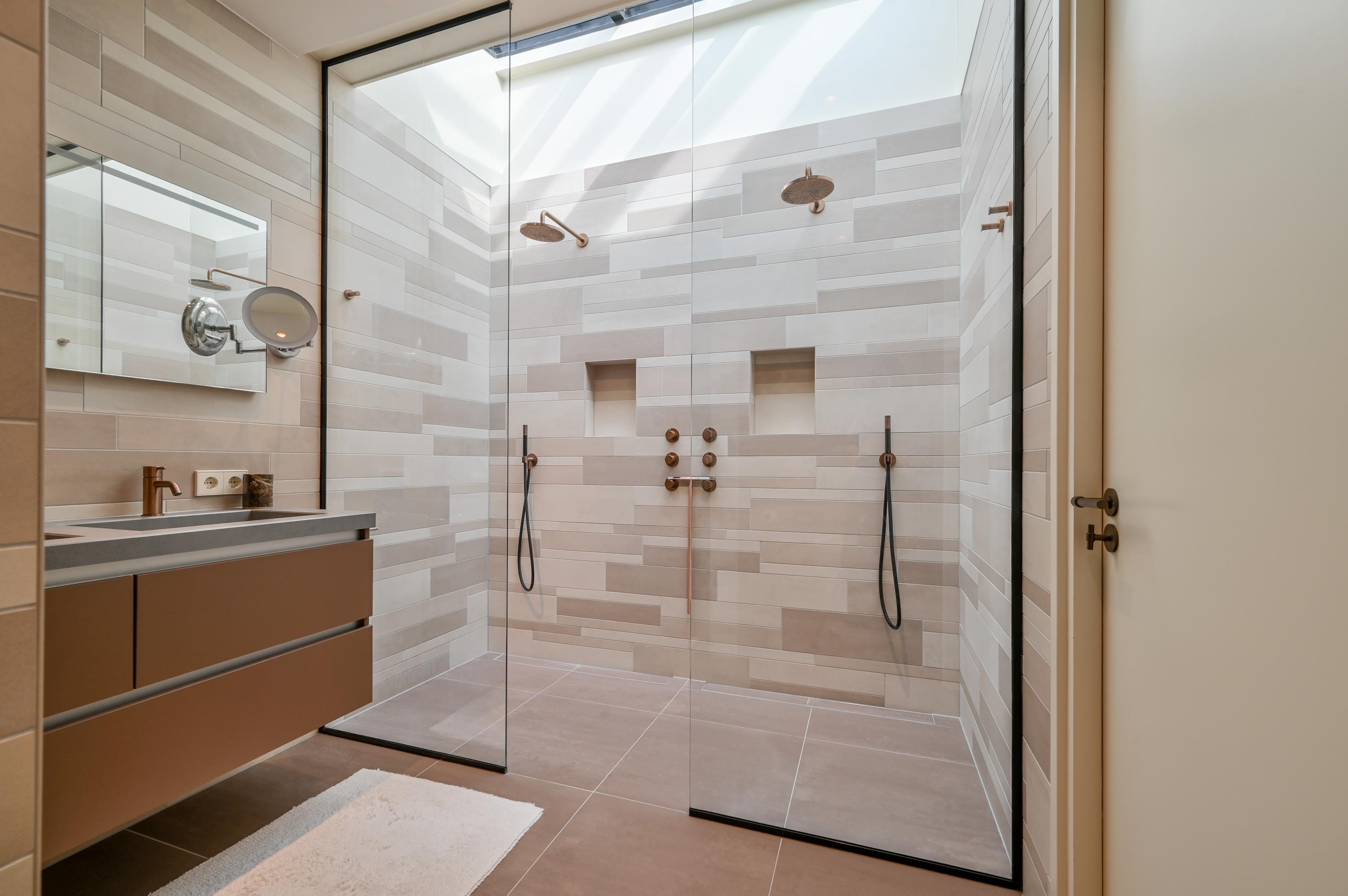 Via de trap in de hal bereikt u de eerste verdieping, waar vier royale slaapkamers zijn gesitueerd. De twee slaapkamers aan de achterzijde zijn met elkaar verbonden door een open doorgang en beschikken over een eigen badkamer met toilet, een ruime wastafel, een moderne douche en handdoekenradiator. Net als in de rest van de woning is hier ook airconditioning aanwezig, voor optimaal comfort het hele jaar door.