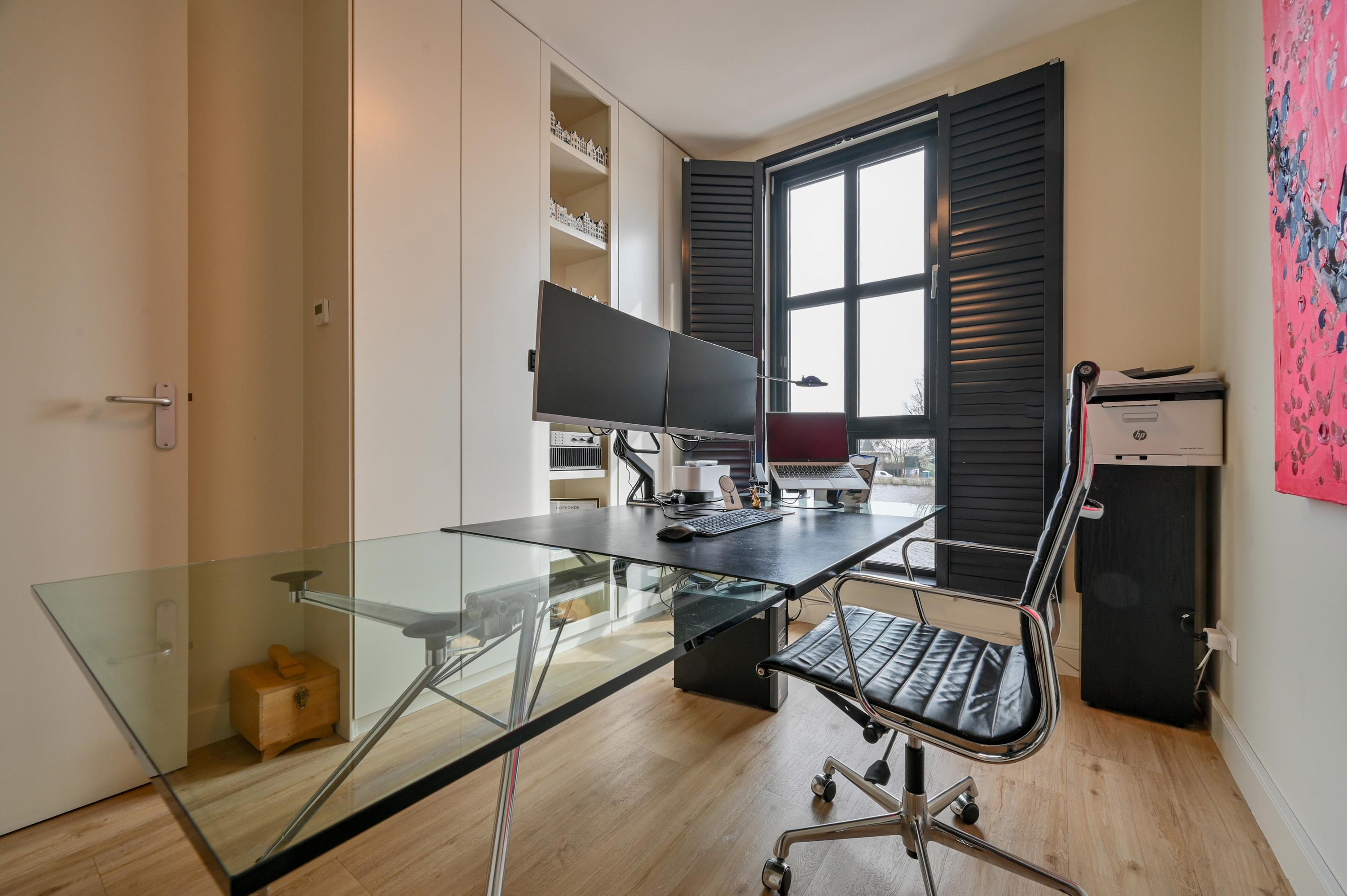 Aan de voorzijde bevinden zich nog twee kamers: momenteel is één kamer in gebruik als stijlvolle kantoorruimte terwijl de andere dienstdoet als riante master-bedroom. Deze master is uitgerust met een op maat gemaakte kastenwand en een luxe ensuite badkamer. De badkamer straalt elegantie uit met lichte designtegels, een inloopdouche met dubbele stort- en handdouche, een lichtstraat die daglicht overvloedig naar binnen laat, een dubbele wastafel met Hotbath kranen en voorzien van lades, een strak wandmeubel en een automatisch toilet met afstandsbediening.