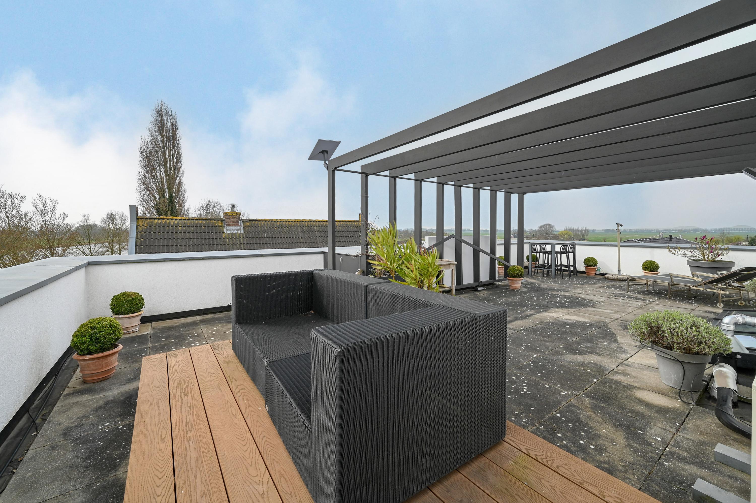 Op de tweede verdieping bevindt zich een riant dakterras, vanwaar u een adembenemend uitzicht heeft over de omliggende natuur en het water van de Amstel. Het terras is voorzien van een ruime pergola, elektriciteit, sfeervolle verlichting, wateraansluiting en een praktische bergkast, waardoor het de ideale plek is om te ontspannen, te borrelen of gasten te ontvangen.